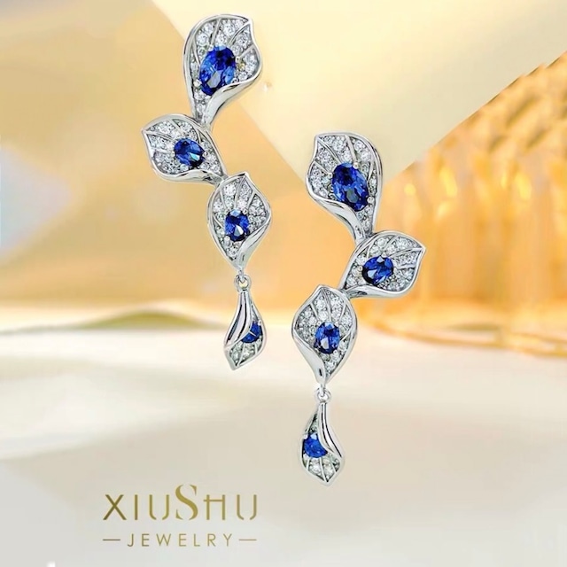 リーフ 人工タンザナイト 高炭素ダイヤモンド キラキラ ゴージャス 揺れる ロングピアス アート ブルー 青 葉っぱ
