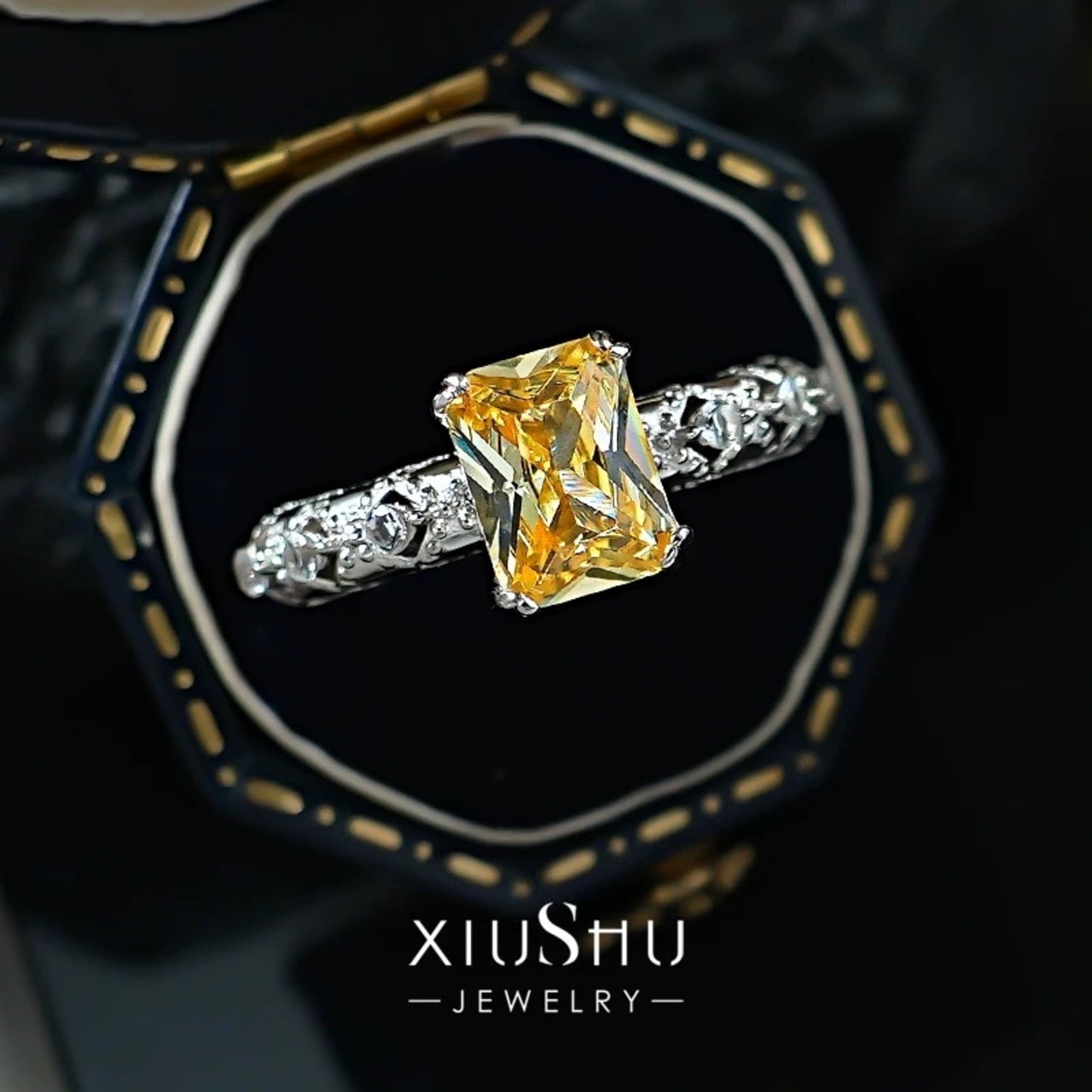 イエロー ミル打ち 高炭素ダイヤモンド キラキラ ゴージャス 指輪 ハイカーボンダイヤモンド シルバー925 リング 長方形 イエロー レトロ ワイドリング