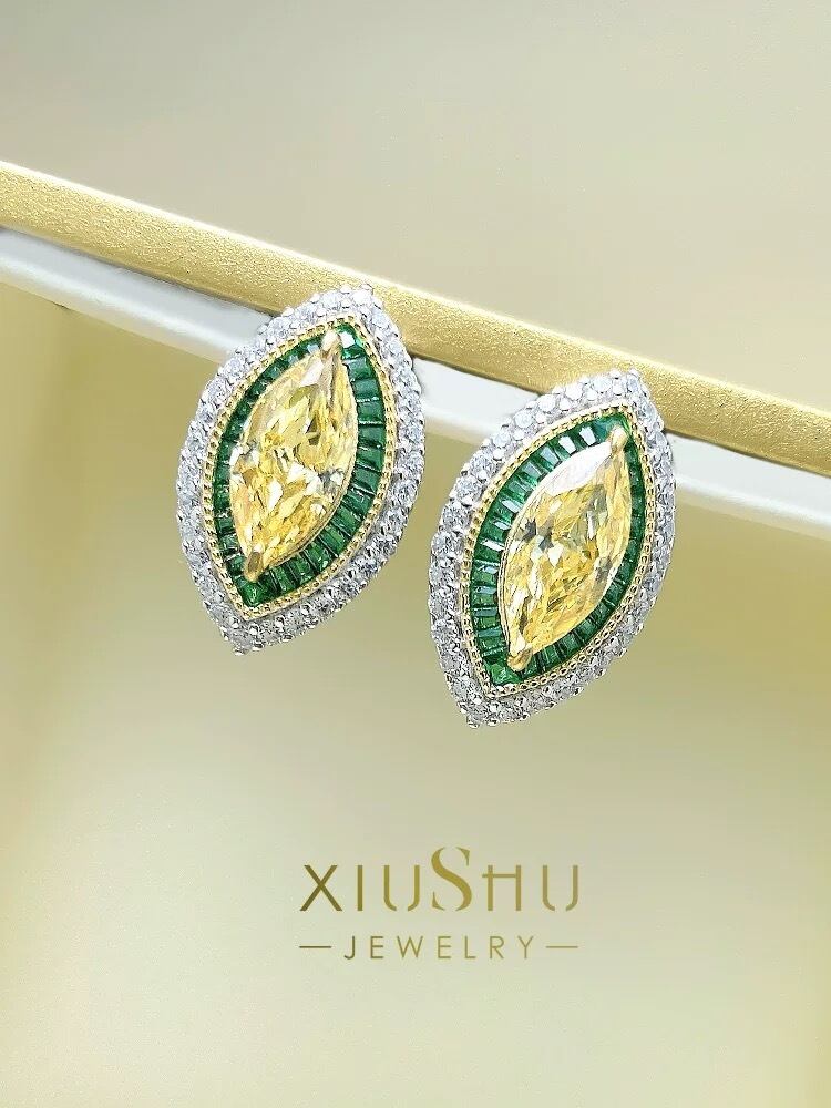 マーキス イエロー グリーン 高炭素ダイヤモンド キラキラ ゴージャス ラグジュアリー ダブルヘイロー スタッドピアス メレ 大きめ ハイカーボンダイヤモンド シルバー925 レトロ カラフル カラー 黄色 クール ミル打ち 緑 エメラルドカラー | キラキラゴージャスジュエリーのXIUSHU(シュシュ)