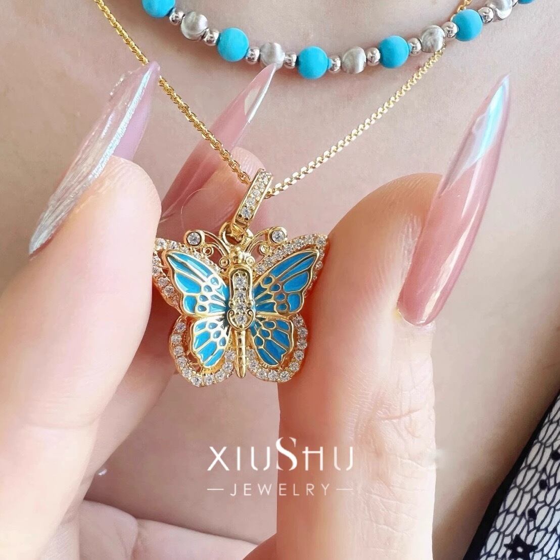 バタフライ エナメル ブルー 高炭素ダイヤモンド キラキラ ゴージャス 蝶々 チョウ ネックレス 青 シルバー925 ハイカーボンダイヤモンド カラフル カラー イエローゴールド 春 ヒップホップ | キラキラゴージャスジュエリーのXIUSHU(シュシュ)
