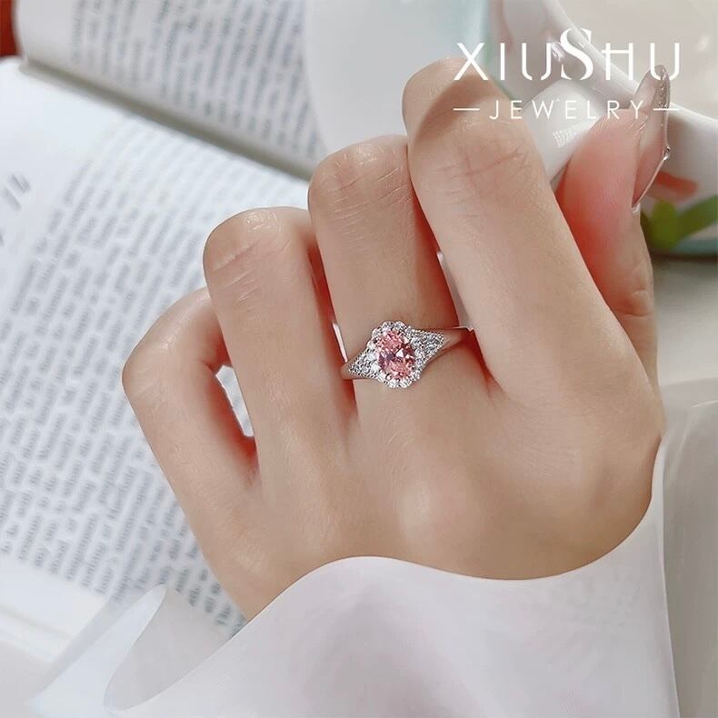 人工パパラチアサファイア オーバル 高炭素ダイヤモンド キラキラ ゴージャス ピンク 指輪 ハイカーボンダイヤモンド 小さめ ヘイローリング メレタイプ ミニ オレンジ | キラキラゴージャスジュエリーのXIUSHU(シュシュ)