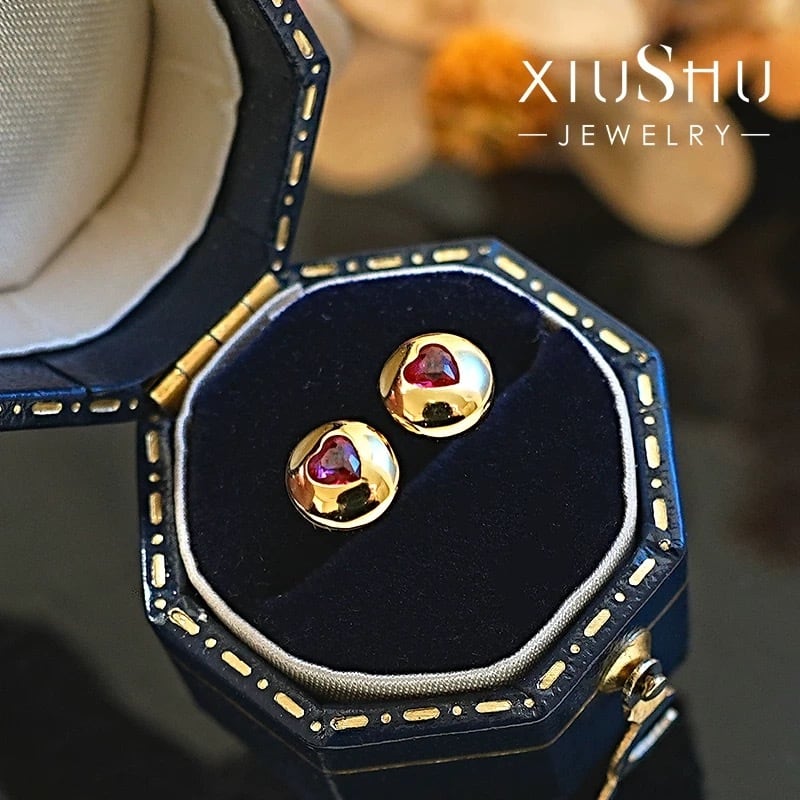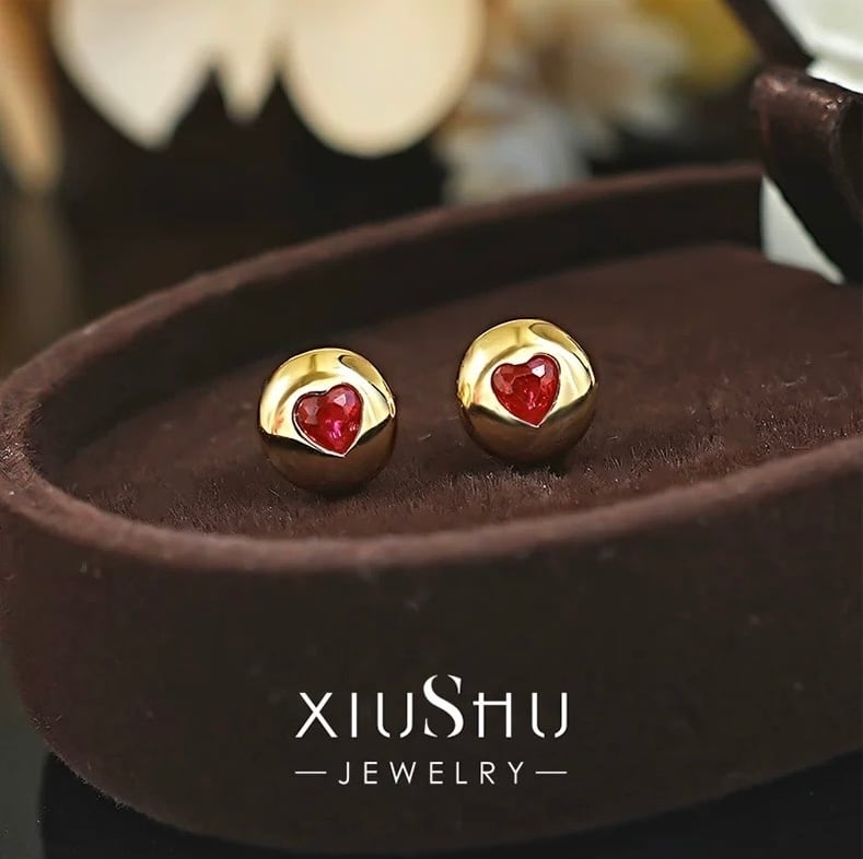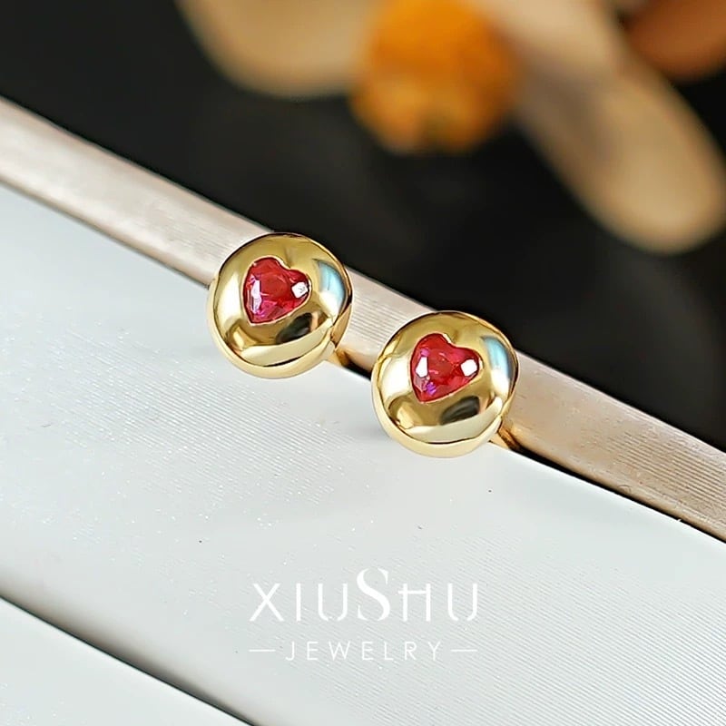 ハート 人工ルビー キラキラ スタッドピアス レッド 赤 ピンク レトロ シンプル ミニ 小さめ シルバー925 小さくて可愛い かわいい ソリティアピアス 1粒 一粒 イエローゴールド ぷっくり | キラキラゴージャスジュエリーのXIUSHU(シュシュ)