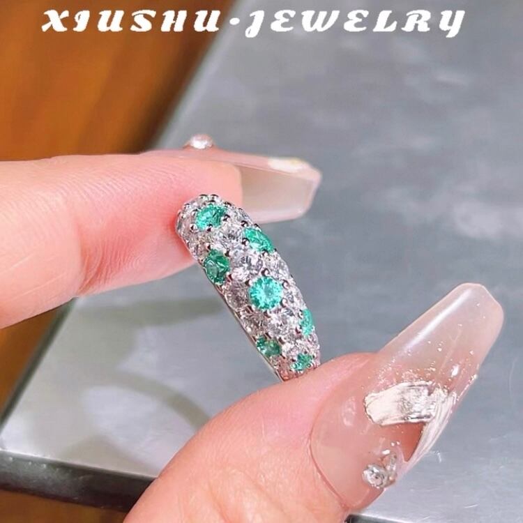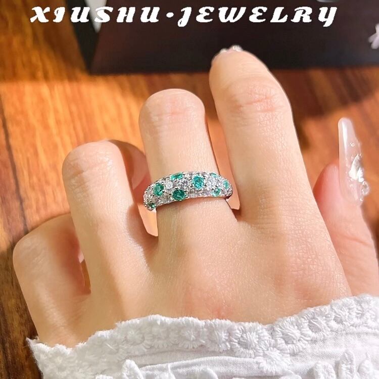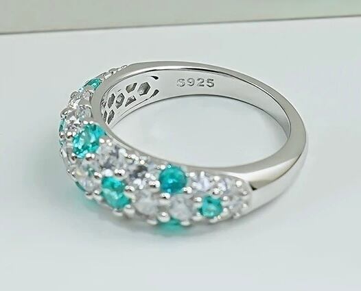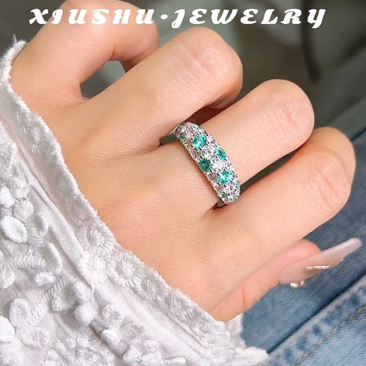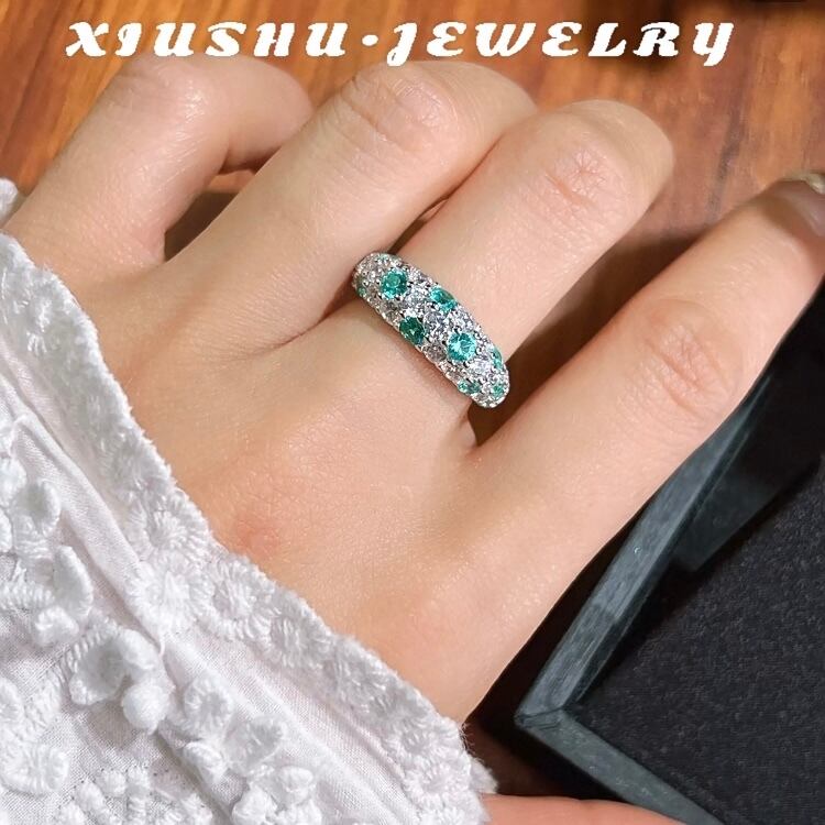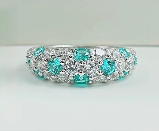 「ミントソーダ」 人工パライバトルマリン パヴェ 高炭素ダイヤモンド キラキラ ゴージャス 指輪 ハイカーボンダイヤモンド シルバー925 レトロ ワイドリング クール ラウンド ロウ ブルー グリーン メレタイプ 青緑 夏 海 | キラキラゴージャスジュエリーのXIUSHU(シュシュ)