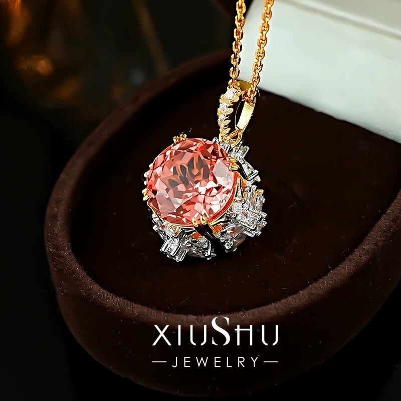 桃の花 サンセットカラー 人工パパラチアサファイア 高炭素ダイヤモンド ホワイト キラキラ ゴージャス ネックレス ハイカーボンダイヤモンド シルバー925 華やか フラワー春 カラフル 大きい ビッグ オレンジ ピンク イエローゴールドメッキ | キラキラゴージャスジュエリーのXIUSHU(シュシュ)