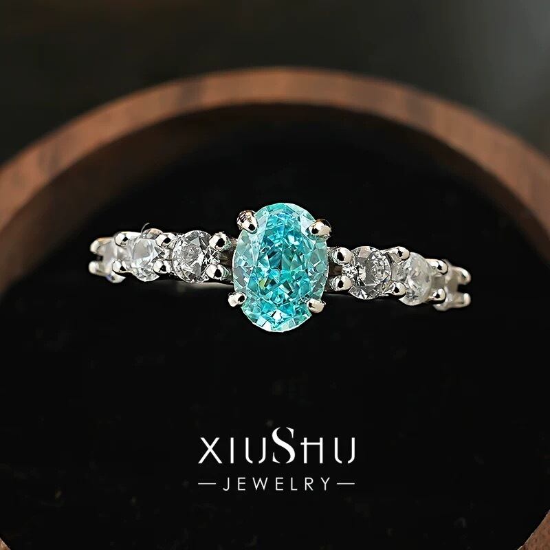人工アクアマリン オーバル 高炭素ダイヤモンド キラキラ ゴージャス 指輪 リング ハイカーボンダイヤモンド シルバー925 ブルー 青 小さめ ミニ 普段使い カラフル カラー ハーフエタニティリング | キラキラゴージャスジュエリーのXIUSHU(シュシュ)