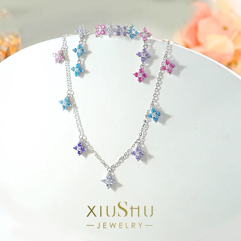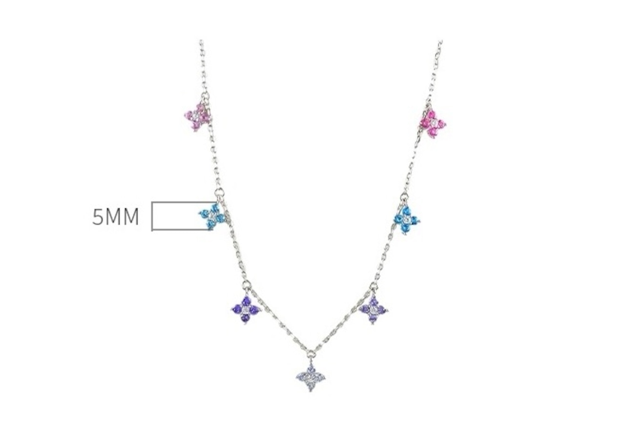 カラフルな花 四葉のクローバー 高炭素ダイヤモンド キラキラ ゴージャス ネックレス ハイカーボンダイヤモンド シルバー925 四つ葉 レトロ ピンク パープル ブルー ホワイト 青 紫 華やか フラワー | キラキラゴージャスジュエリーのXIUSHU(シュシュ)