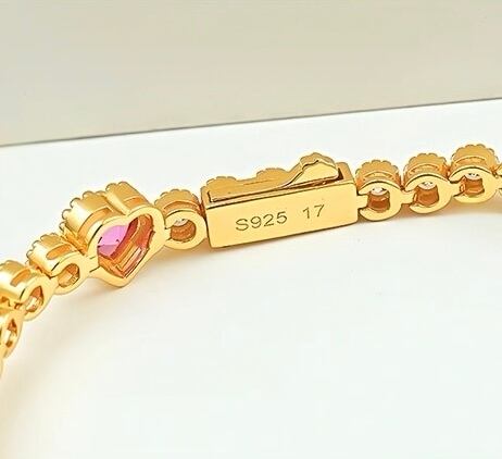 ハート 人工ピンクトルマリン エタニティブレスレット ラグジュアリー 高炭素ダイヤモンド キラキラ ゴージャス ラグジュアリー ホワイト シルバー925 高炭素ダイヤモンド レトロ ミル打ち ベゼルセッティング イエローゴールドメッキ 大人可愛い かわいい | キラキラゴージャスジュエリーのXIUSHU(シュシュ)