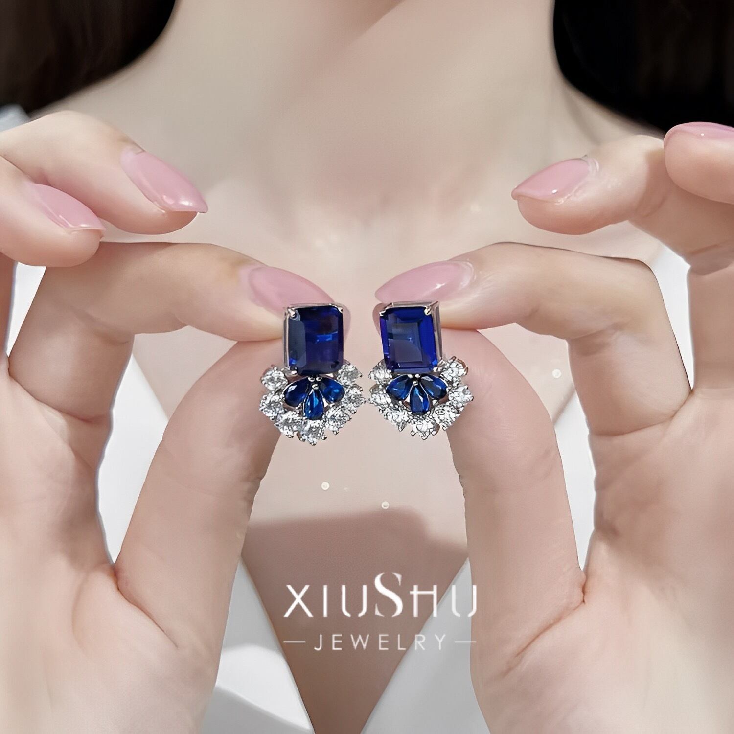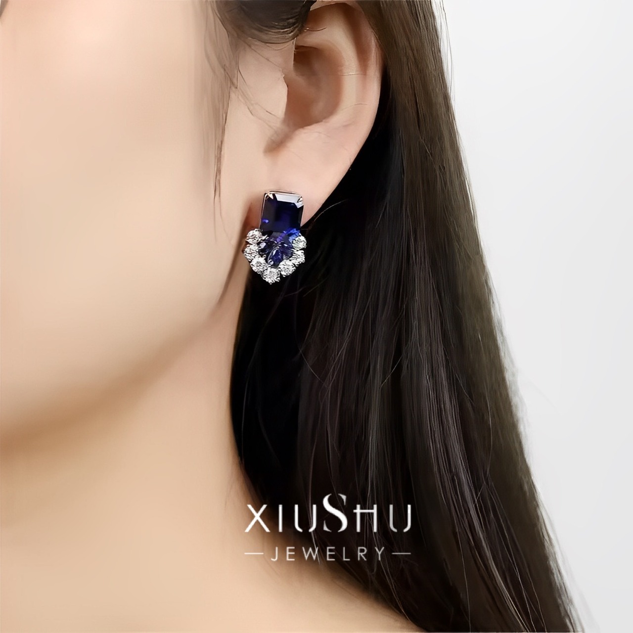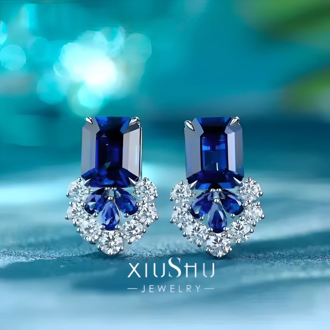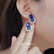 人工ロイヤルブルーサファイア エメラルドカット 青色 カラフル 高炭素ダイヤモンド キラキラ ゴージャス スタッドピアス ハイカーボンダイヤモンド シルバー925 レトロ 華やか ホワイト フラワー 花 長方形 ペアシェイプ ラウンド 人工宝石 | キラキラゴージャスジュエリーのXIUSHU(シュシュ)