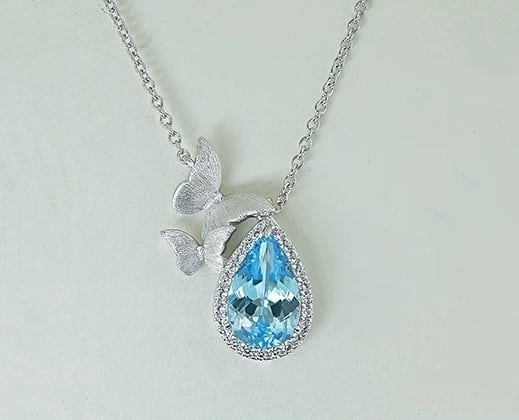 「蝶が飛ぶ」人工アクアマリン 高炭素ダイヤモンド ホワイト キラキラ ゴージャス ペアシェイプ ネックレス ハイカーボンダイヤモンド シルバー925 ドロップ 大人可愛い かわいい 夏 ヘイローネックレス ブルー 蝶々 バタフライ 青 | キラキラゴージャスジュエリーのXIUSHU(シュシュ)