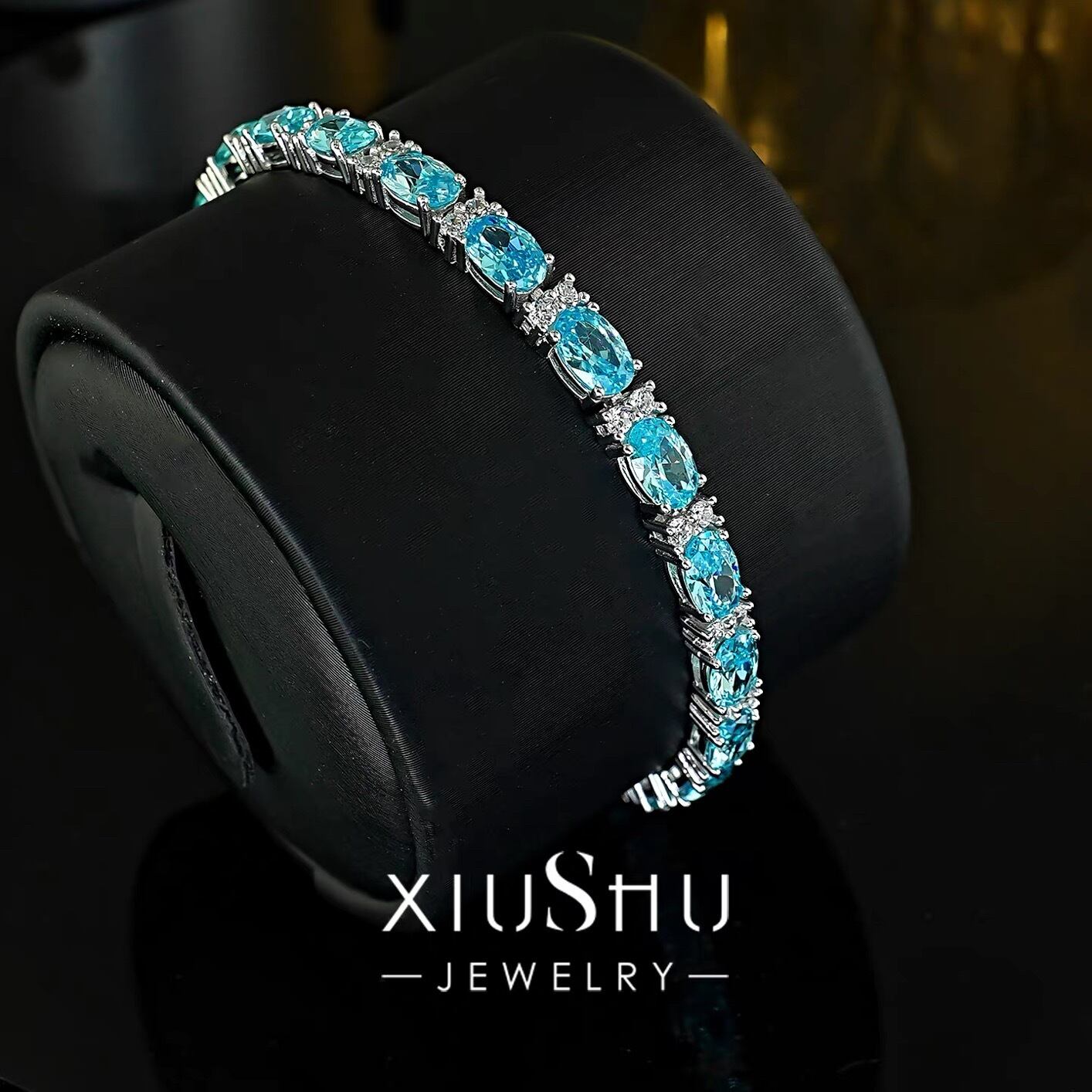 人工アクアマリン オーバル エタニティブレスレット 高炭素ダイヤモンド キラキラ ゴージャス ラグジュアリー シルバー925 高炭素ダイヤモンド カラフル カラー 夏 海 ブルー 青 メレタイプ ヒップホップ | キラキラゴージャスジュエリーのXIUSHU(シュシュ)