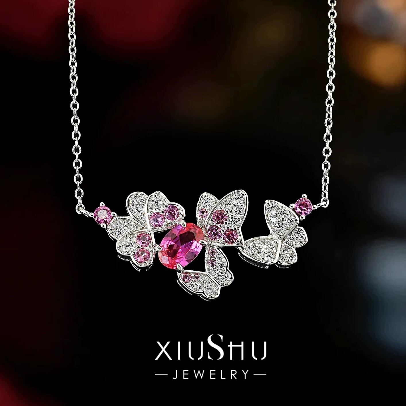 人工ピンクトルマリン バタフライ オーバル 高炭素ダイヤモンド ホワイト キラキラ ゴージャス ネックレス ハイカーボンダイヤモンド シルバー925 カラフル ラグジュアリー レトロ 夏 蝶々 ちょうちょ フラワー