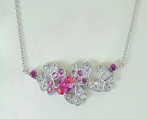 人工ピンクトルマリン バタフライ オーバル 高炭素ダイヤモンド ホワイト キラキラ ゴージャス ネックレス ハイカーボンダイヤモンド シルバー925 カラフル ラグジュアリー レトロ 夏 蝶々 ちょうちょ フラワー | キラキラゴージャスジュエリーのXIUSHU(シュシュ)
