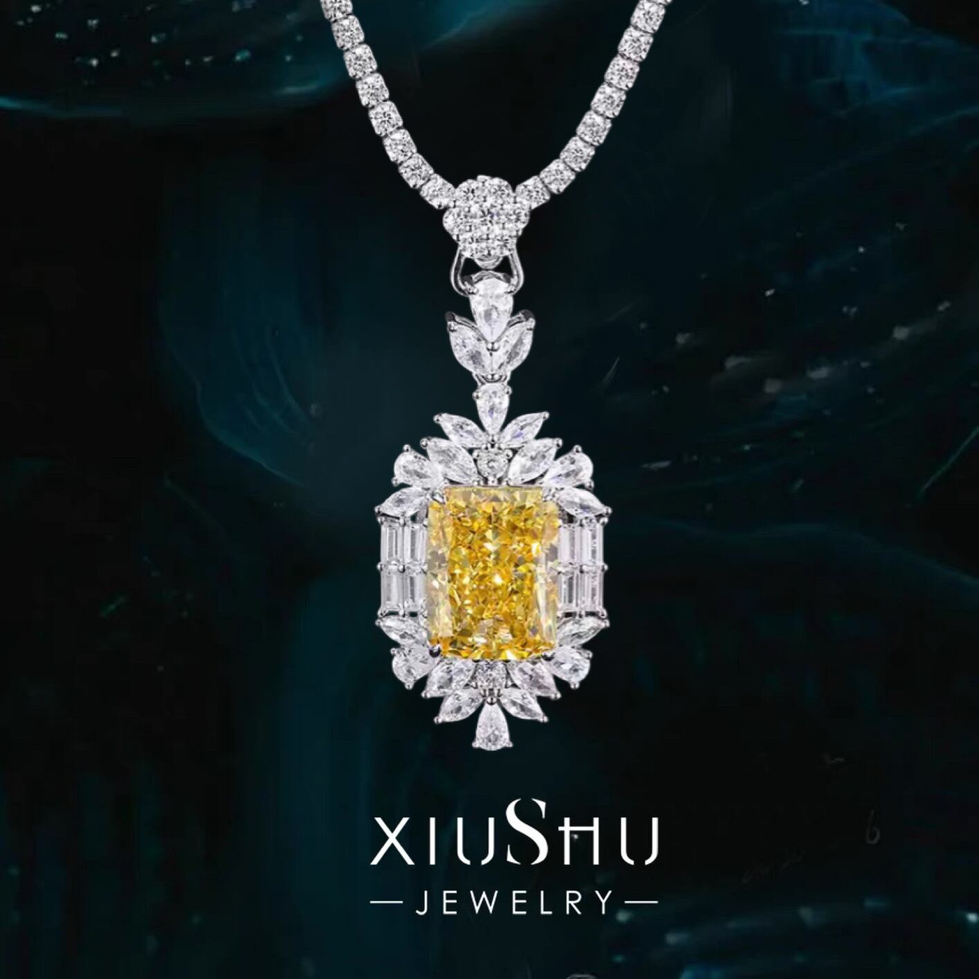 イエロー 長方形 高炭素ダイヤモンド ホワイト キラキラ ゴージャス ハイカーボンダイヤモンド シルバー925 カラフル ラグジュアリー ヘイローネックレス レトロ 夏 クール フルエタニティネックレス 黄色