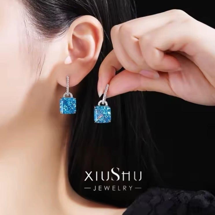 ブルー スクエア 高炭素ダイヤモンド ホワイト キラキラ ゴージャス ハイカーボンダイヤモンド シルバー925 レトロ ラグジュアリー 中折れピアス フープピアス カラフル ぶら下がりピアス 海 青 夏 | キラキラゴージャスジュエリーのXIUSHU(シュシュ)