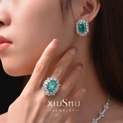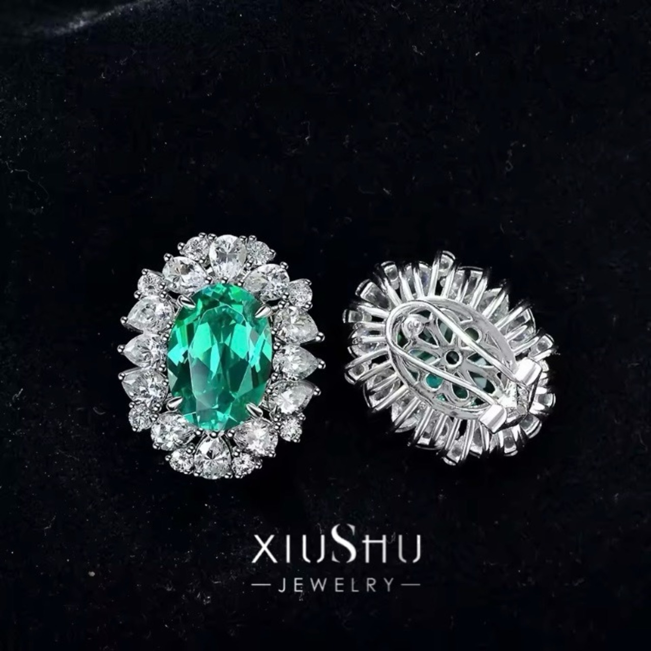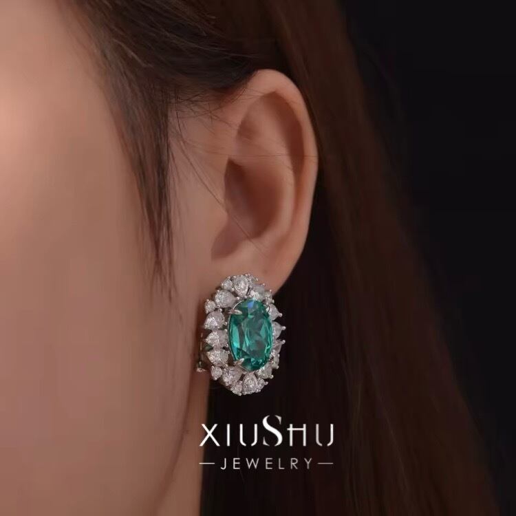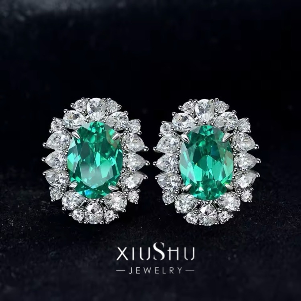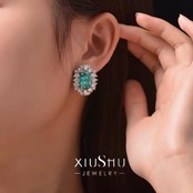 人工パライバトルマリン フラワー 高炭素ダイヤモンド キラキラ ラグジュアリー ゴージャス スタッドピアス ハイカーボンダイヤモンド グリーン 緑 花 シルバー925 レトロ グリーン ビッグ ラージ オーバル 夏 ヘイローピアス 人工宝石 | キラキラゴージャスジュエリーのXIUSHU(シュシュ)