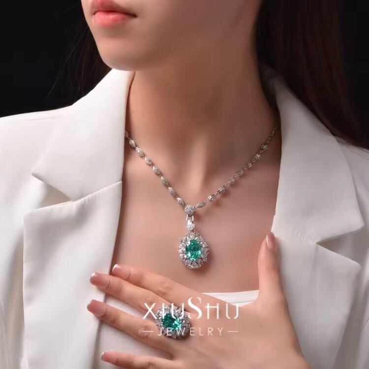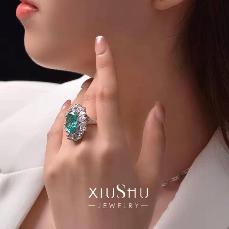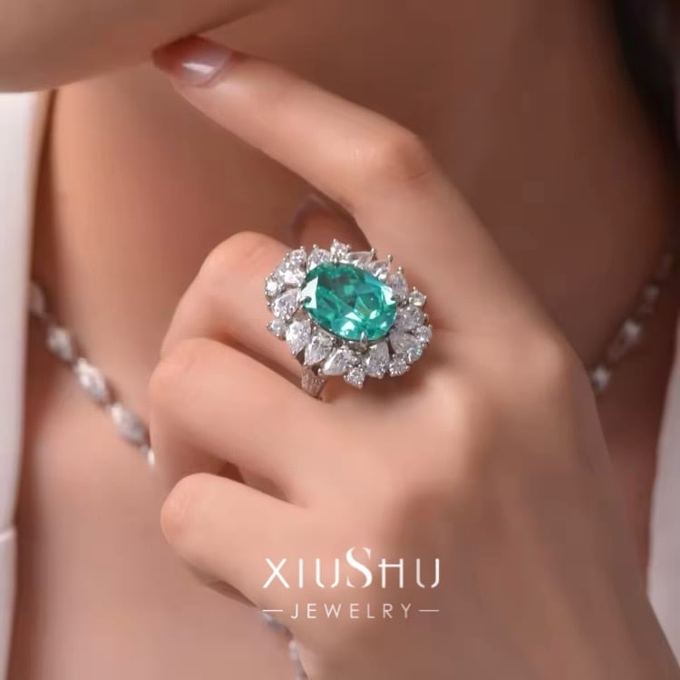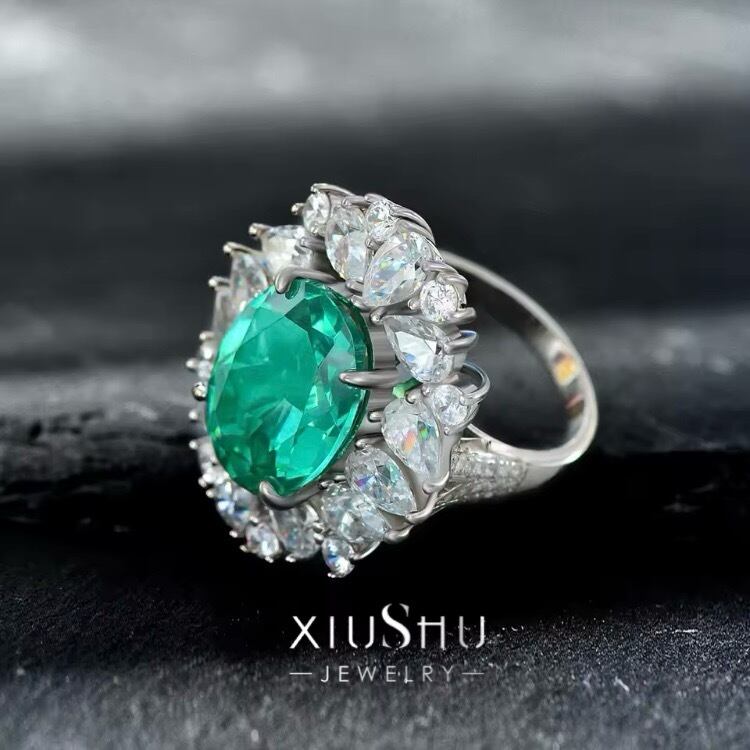 人工パライバトルマリン フラワー 高炭素ダイヤモンド キラキラ 12×16mm ラグジュアリー ゴージャス 指輪 ハイカーボンダイヤモンド グリーン 緑 花 シルバー925 レトロ グリーン ビッグ ラージ オーバル 夏 ヘイローリング 人工宝石 | キラキラゴージャスジュエリーのXIUSHU(シュシュ)
