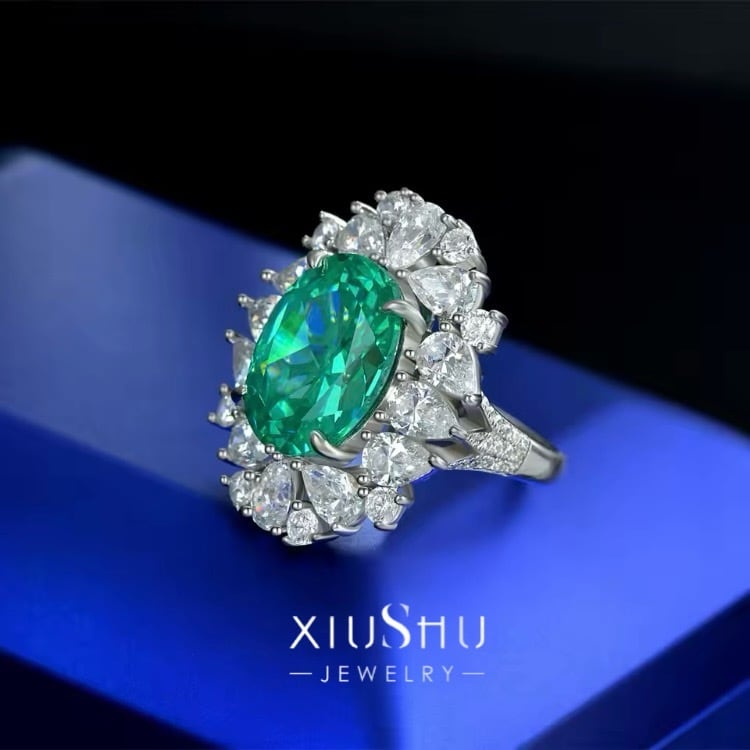 人工パライバトルマリン フラワー 高炭素ダイヤモンド キラキラ 12×16mm ラグジュアリー ゴージャス 指輪 ハイカーボンダイヤモンド グリーン 緑 花 シルバー925 レトロ グリーン ビッグ ラージ オーバル 夏 ヘイローリング 人工宝石