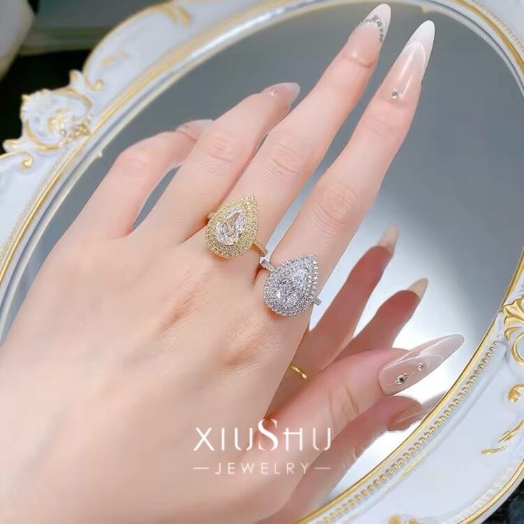 ペアシェイプ ドロップ リング 高炭素ダイヤモンド キラキラ ゴージャス 指輪 ハイカーボンダイヤモンド ホワイト エンゲージリング ビッグ ラージ 大きい S925 シルバー925 大きめ メレタイプ ダブルヘイローリング イエローゴールドメッキ