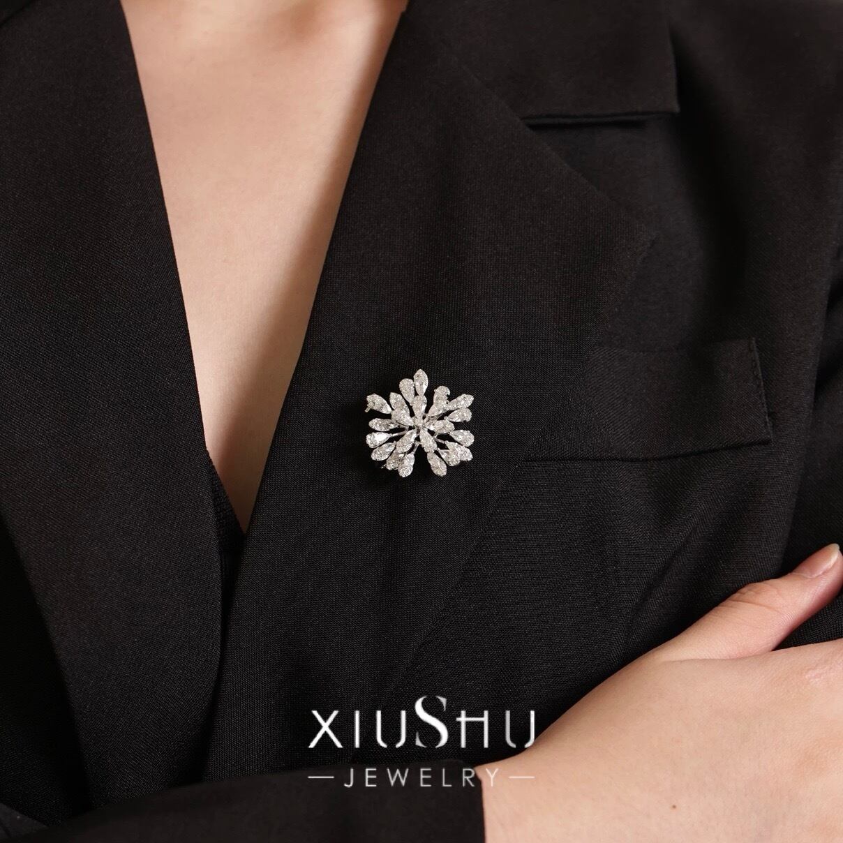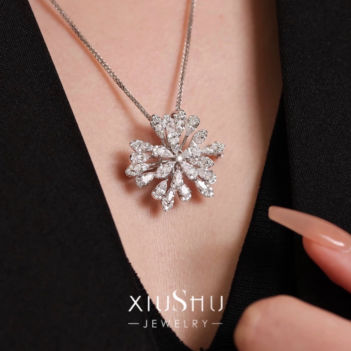 美しくちりばめられた花火 ブローチ/ネックレス 2way 豪華 スノーフレーク 高炭素ダイヤモンド ホワイト キラキラ ゴージャス ハイカーボンダイヤモンド シルバー925 雪 冬 大きい ビッグ | キラキラゴージャスジュエリーのXIUSHU(シュシュ)