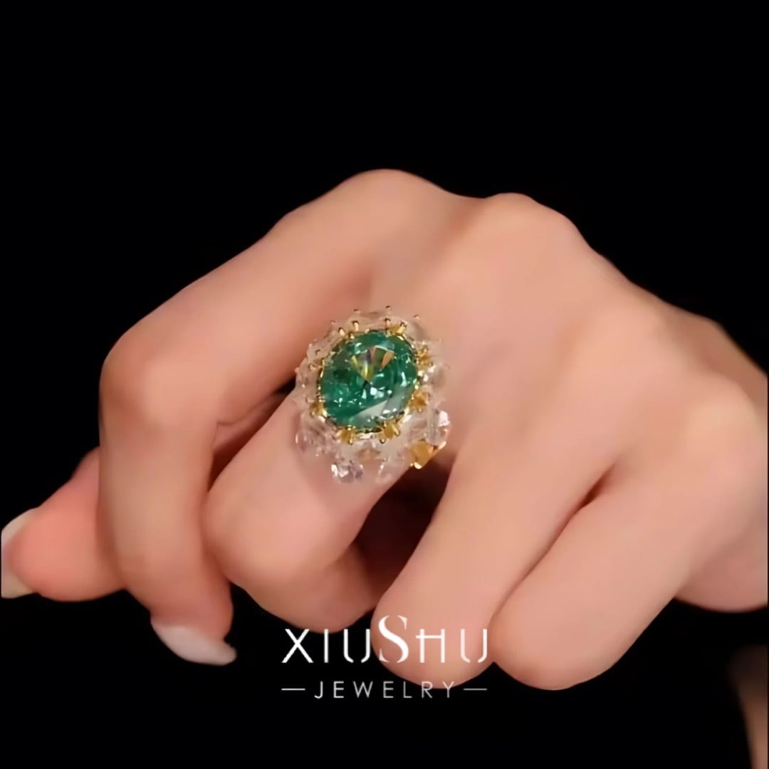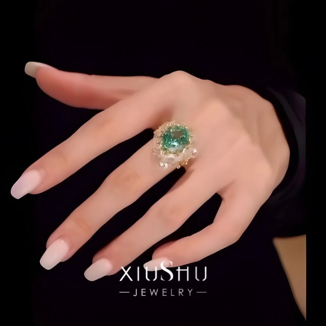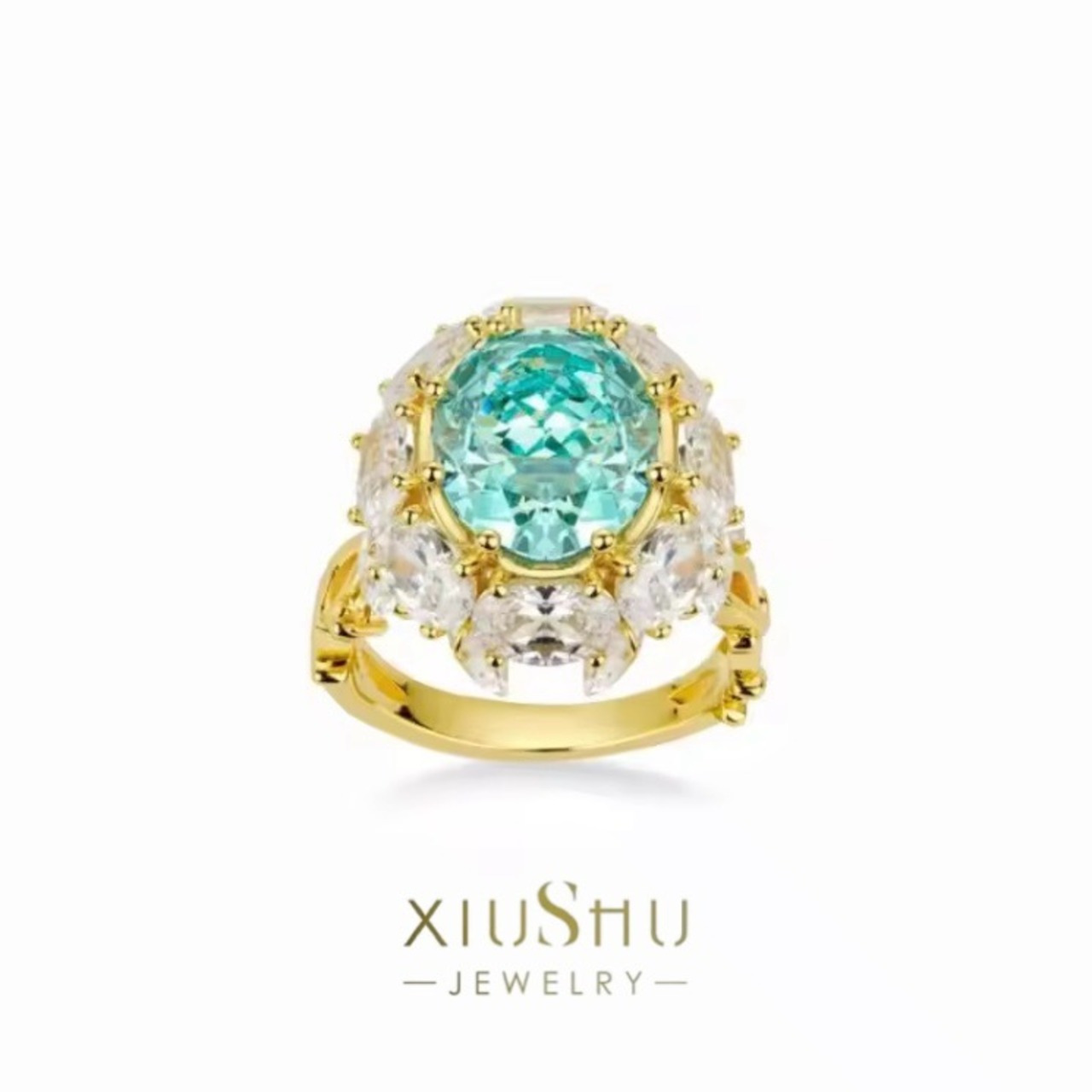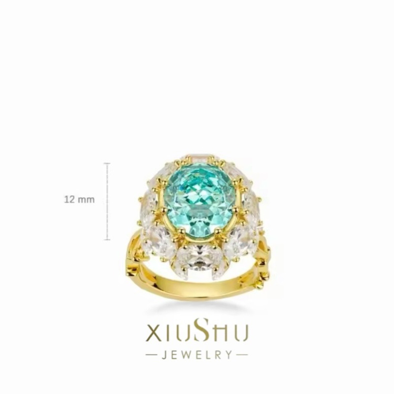 人工 ブルーグリーン パライバトルマリン好きにおすすめ リング 高炭素ダイヤモンド キラキラ ゴージャス 指輪 ハイカーボンダイヤモンド ホワイト エンゲージリング ビッグ ラージ 大きい S925 シルバー925 揺れる イエローゴールドメッキ | キラキラゴージャスジュエリーのXIUSHU(シュシュ)