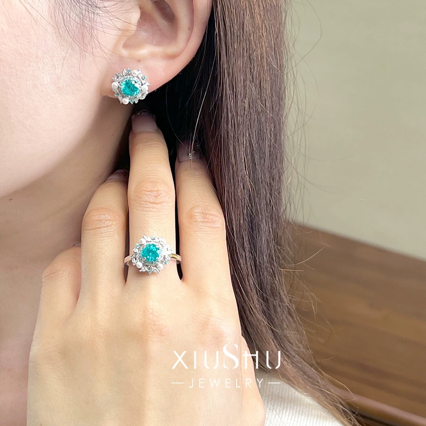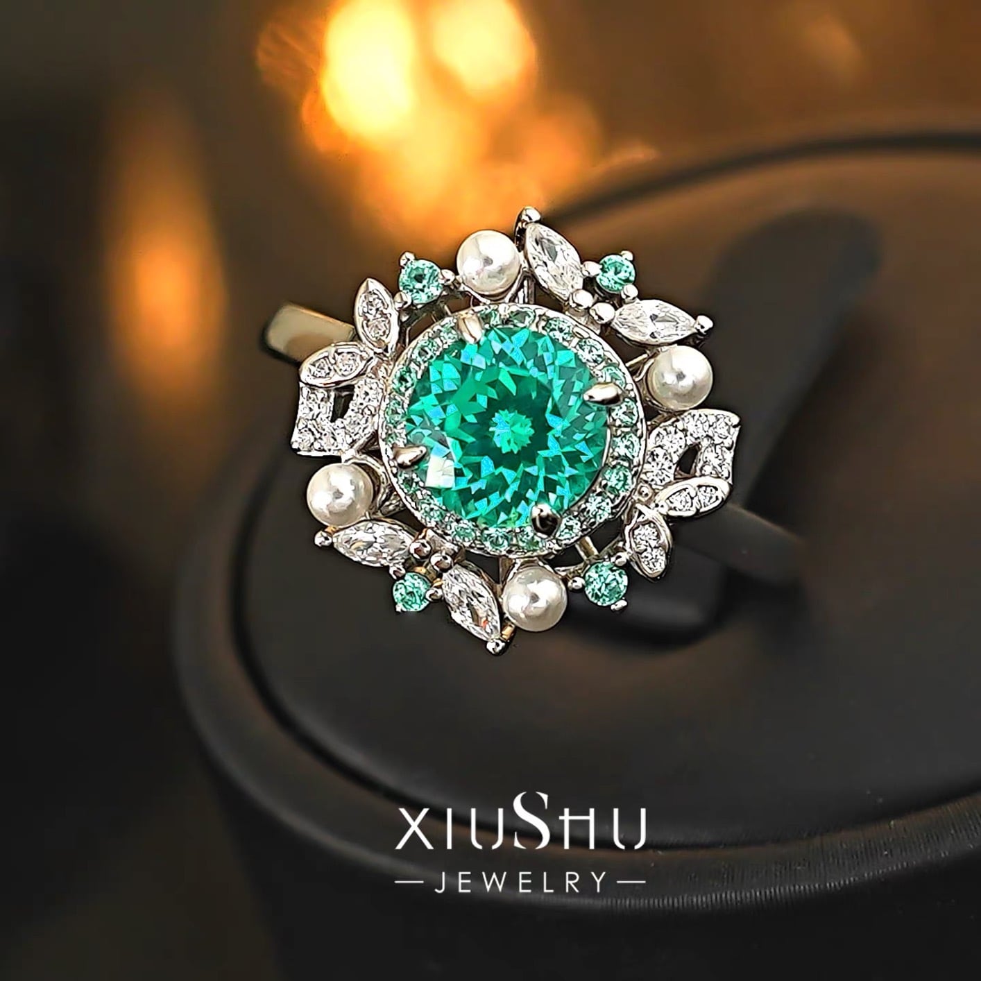 人工パライバトルマリン ラウンド ロータスカット 人工パール レトロ 高炭素ダイヤモンド ホワイト キラキラ ゴージャス 指輪 リング ハイカーボンダイヤモンド シルバー925 ブルー グリーン 青 緑 モダン | キラキラゴージャスジュエリーのXIUSHU(シュシュ)