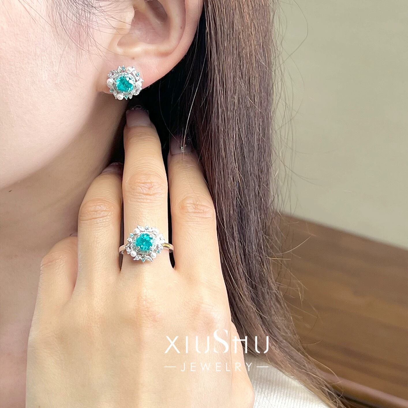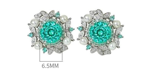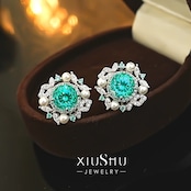 人工パライバトルマリン ラウンド ロータスカット 人工パール レトロ 高炭素ダイヤモンド ホワイト キラキラ ゴージャス スタッドピアス ハイカーボンダイヤモンド シルバー925 ブルー グリーン 青 緑 モダン | キラキラゴージャスジュエリーのXIUSHU(シュシュ)