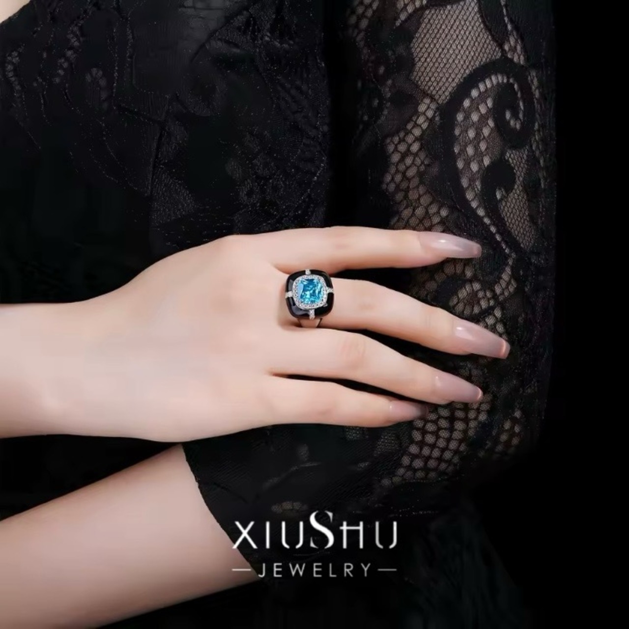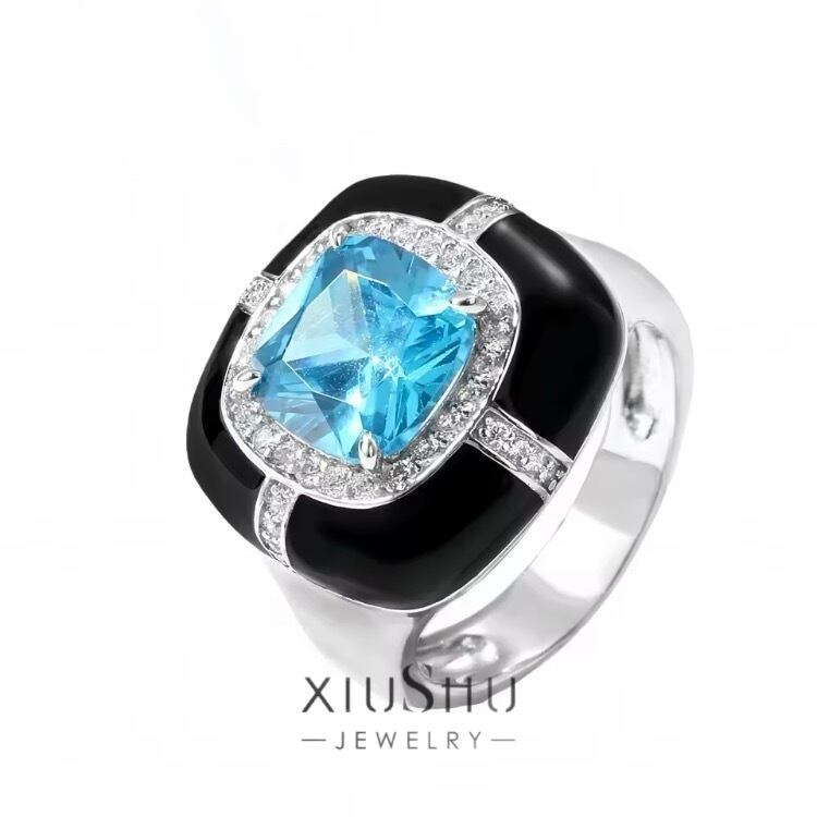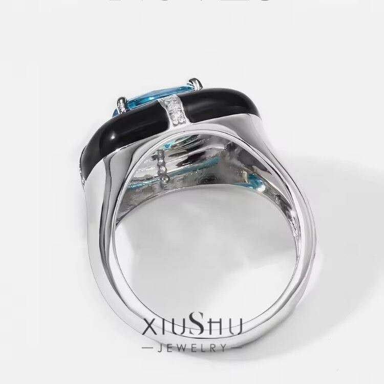 ブラック エナメル 人工ブルートパーズ スクエア 高炭素ダイヤモンド キラキラ ゴージャス 指輪 ハイカーボンダイヤモンド ビッグ シルバー925 大きい リング クール 黒 かっこいい | キラキラゴージャスジュエリーのXIUSHU(シュシュ)