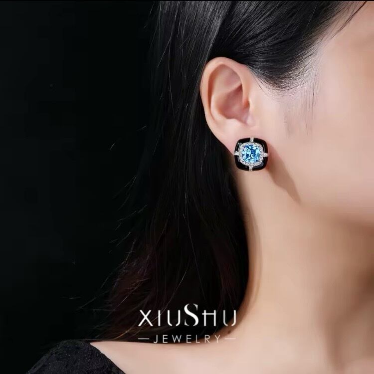 ブラック エナメル 人工ブルートパーズ スクエア 高炭素ダイヤモンド キラキラ ゴージャス スタッドピアス ハイカーボンダイヤモンド ビッグ シルバー925 大きい クール 黒 かっこいい | キラキラゴージャスジュエリーのXIUSHU(シュシュ)