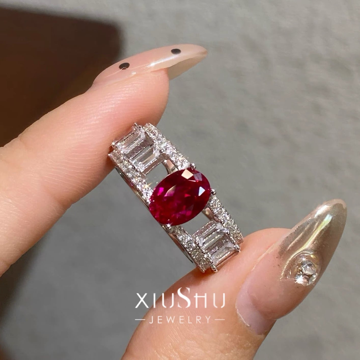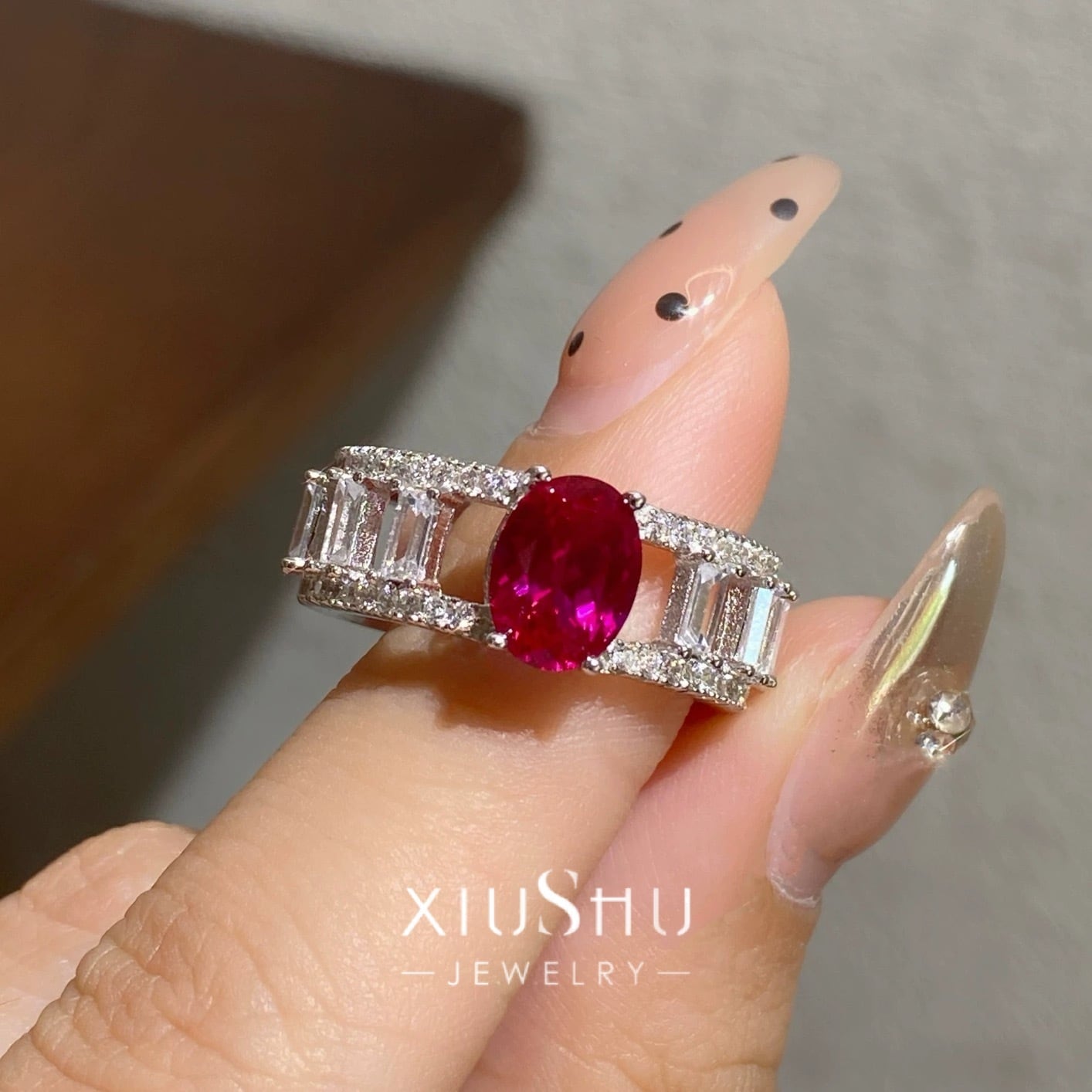 深紅の人工ルビーが指先で強く輝くラグジュアリーリング。