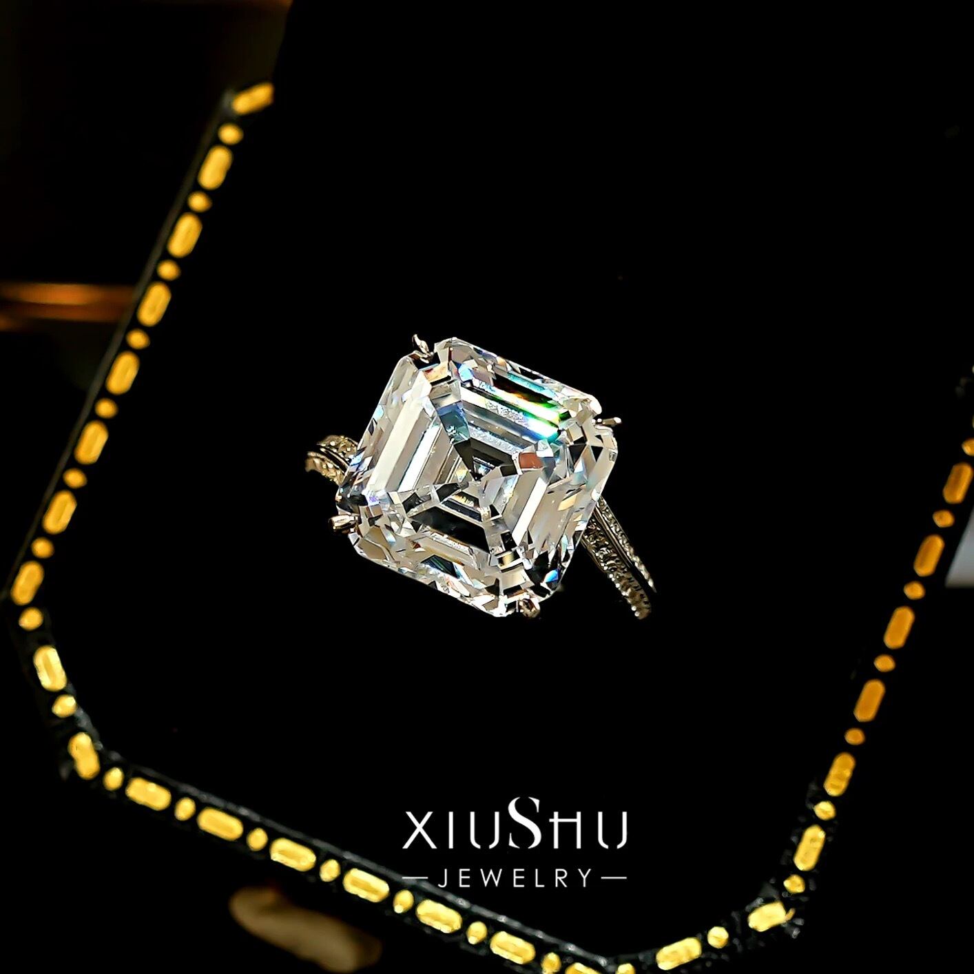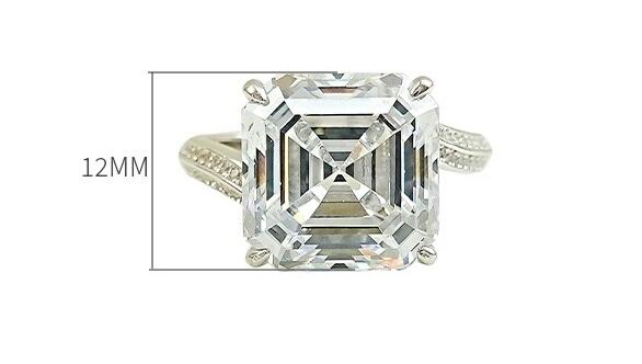 圧倒的な存在感を放つ、10カラットのアッシャーカット・ハイカーボンダイヤモンドリング。