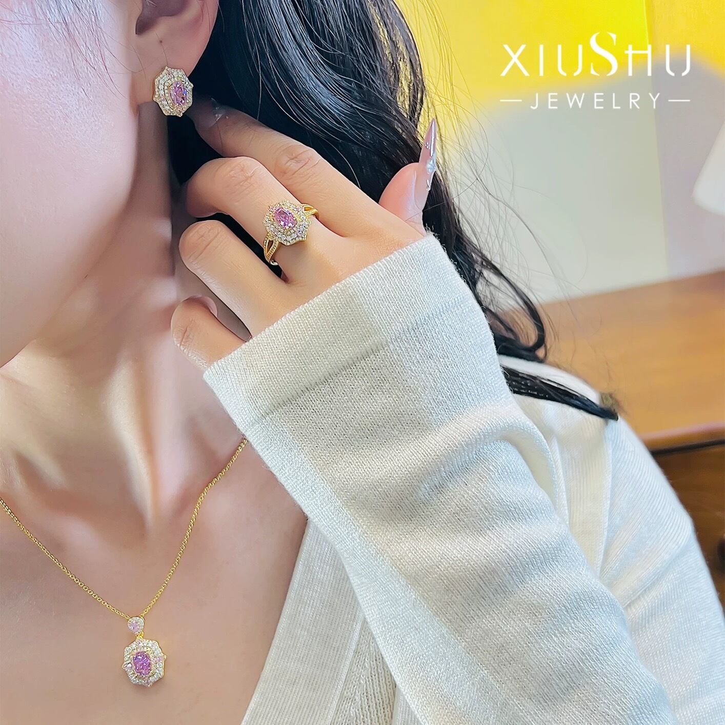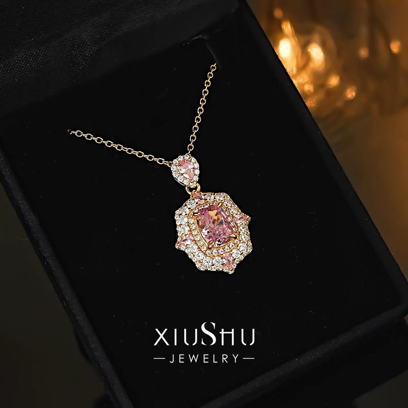 ロマンティック ドリームガーデン 人工ピンクダイヤモンド 高炭素ダイヤモンド キラキラ ゴージャス ハイカーボンダイヤモンド シルバー925 カラフル ラグジュアリー ヘイローネックレス イエローゴールドメッキ ペアシェイプ | キラキラゴージャスジュエリーのXIUSHU(シュシュ)