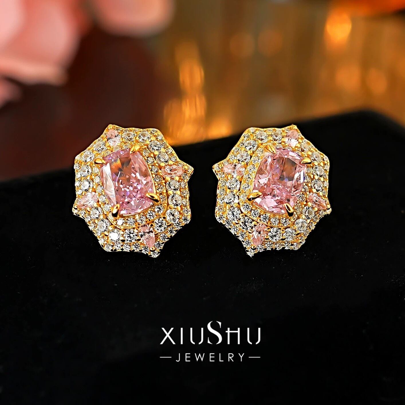 ロマンティック ドリームガーデン 人工ピンクダイヤモンド 高炭素ダイヤモンド キラキラ ゴージャス ハイカーボンダイヤモンド シルバー925 カラフル ラグジュアリー ヘイロー スタッドピアス イエローゴールドメッキ ペアシェイプ | キラキラゴージャスジュエリーのXIUSHU(シュシュ)