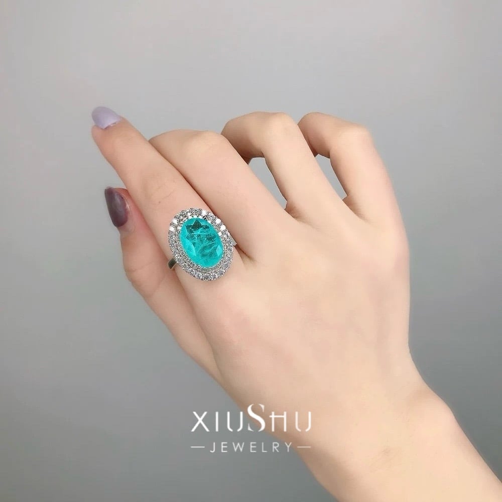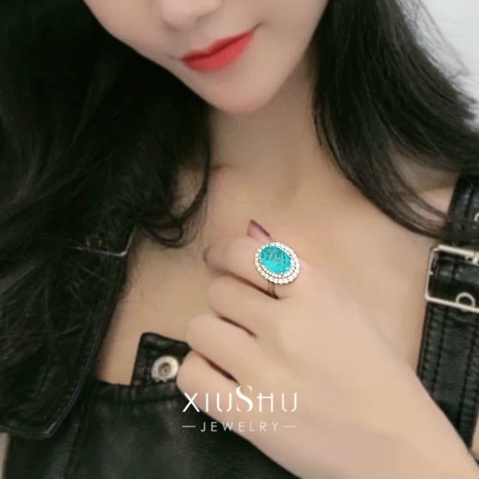 合成パライバトルマリンを使用。天然パライバトルマリンの組成特性をシミュレートし、宝石に蛍光感があり、 脱脂綿の若干の曇り、若干の雲霧状の綿、不規則な割れ、インクルージョン、クラック、内容物の結晶化など レベルの高いパライバトルマリンに取って代わります! 全体的に透明感がありとてもツヤツヤです!