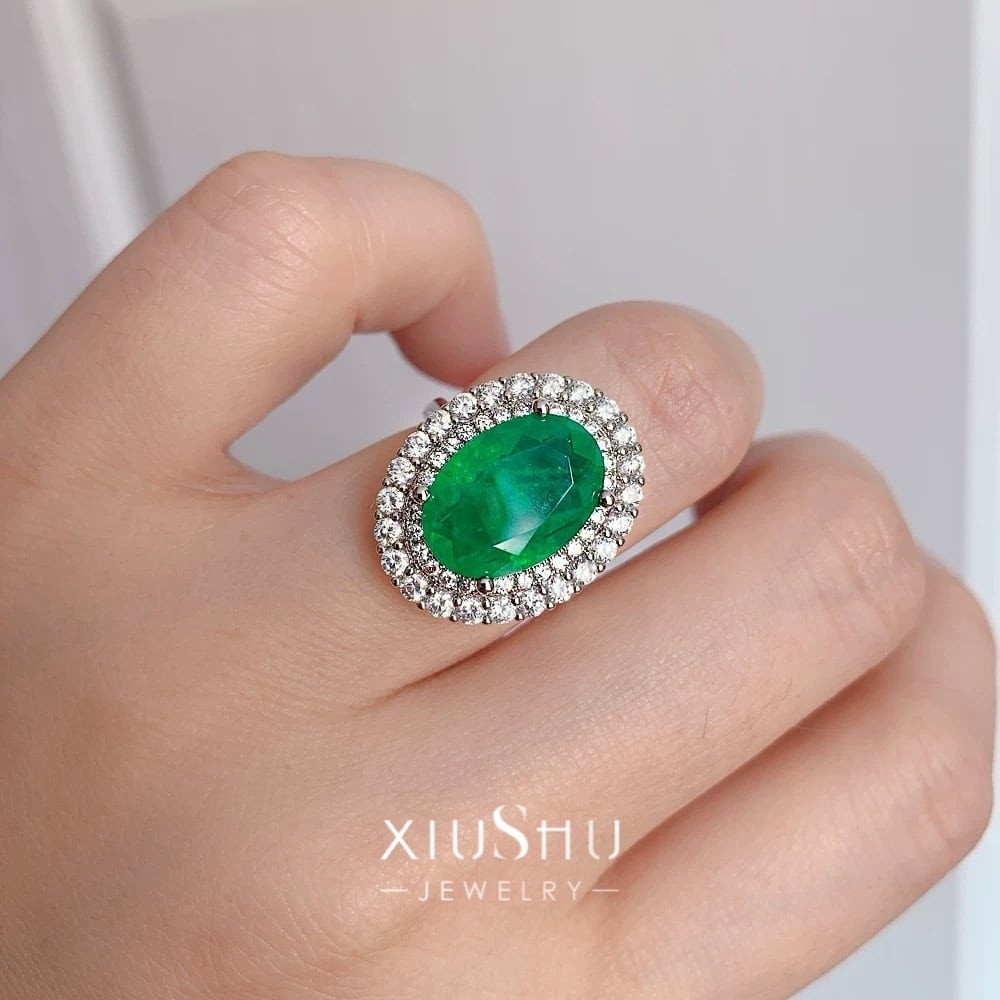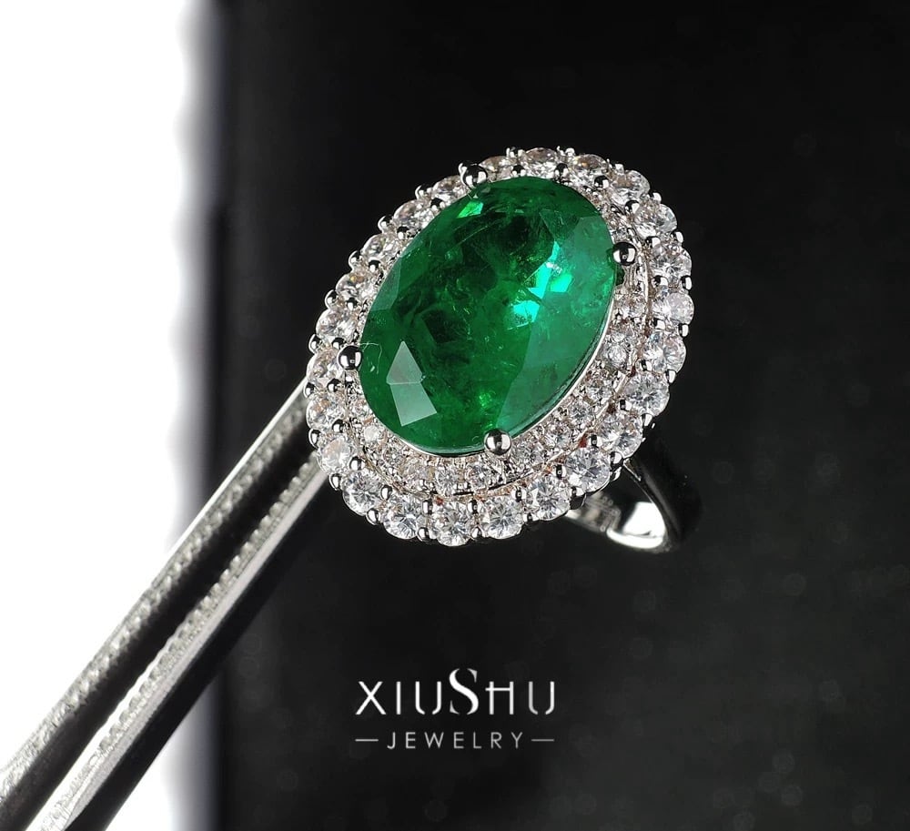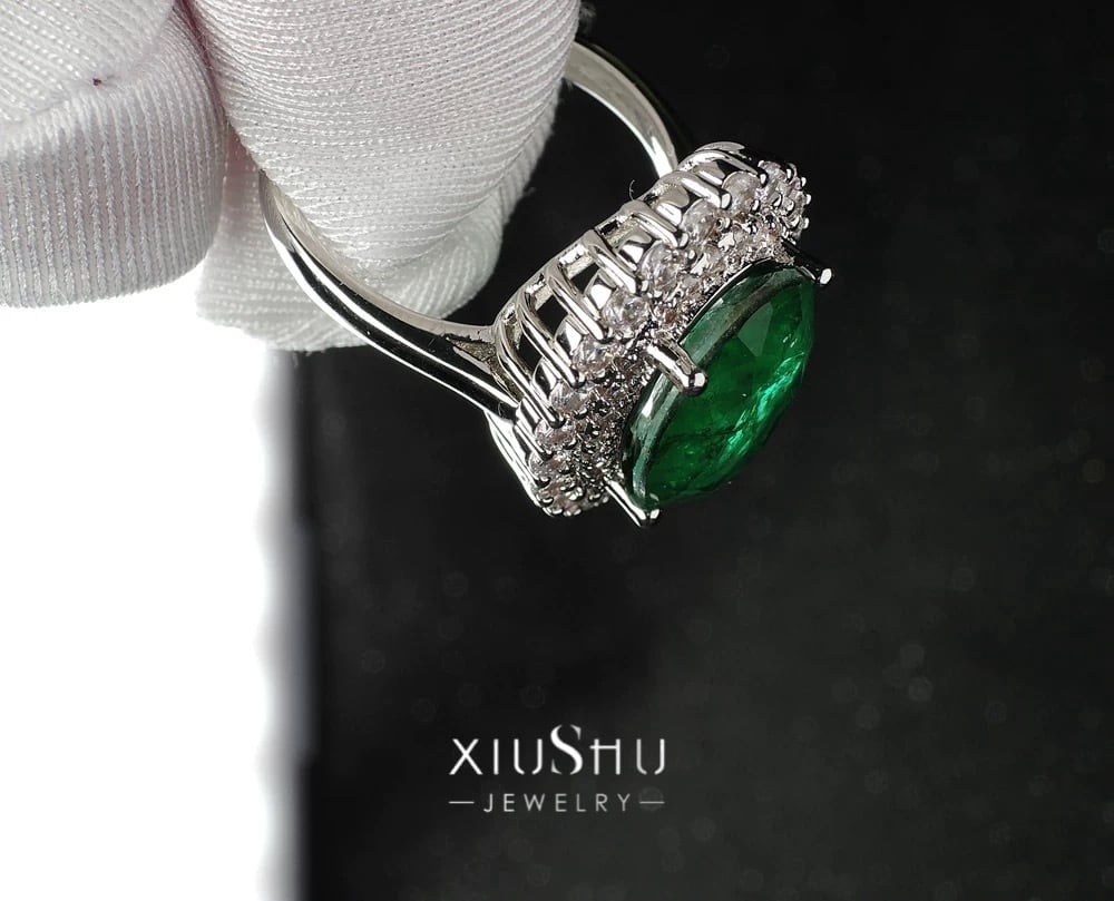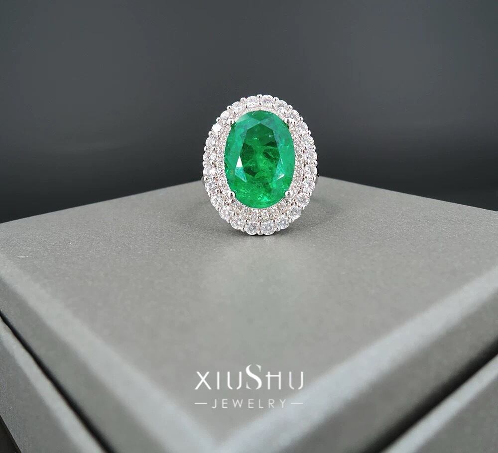 合成エメラルドを使用。天然エメラルドの組成特性をシミュレートし、宝石に蛍光感があり、 脱脂綿の若干の曇り、若干の雲霧状の綿、不規則な割れ、インクルージョン、クラック、内容物の結晶化など レベルの高いエメラルドに取って代わります! 全体的に透明感がありとてもツヤツヤです!