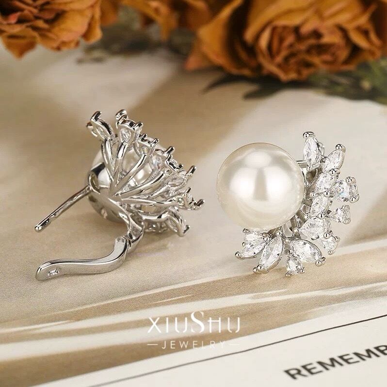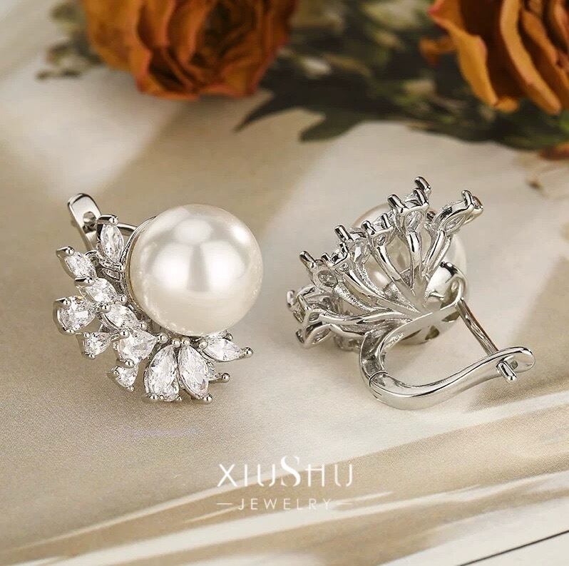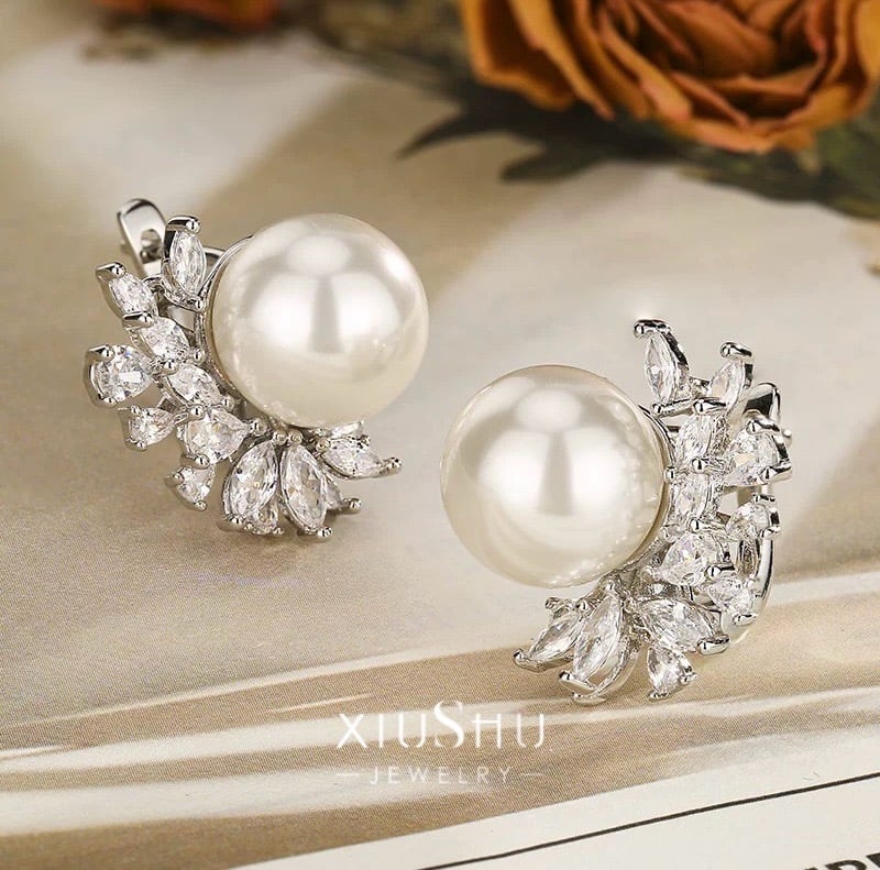 ふっくら艶めく人工パールに、ハイカーボンダイヤモンドを贅沢に散りばめたエレガントなピアス。