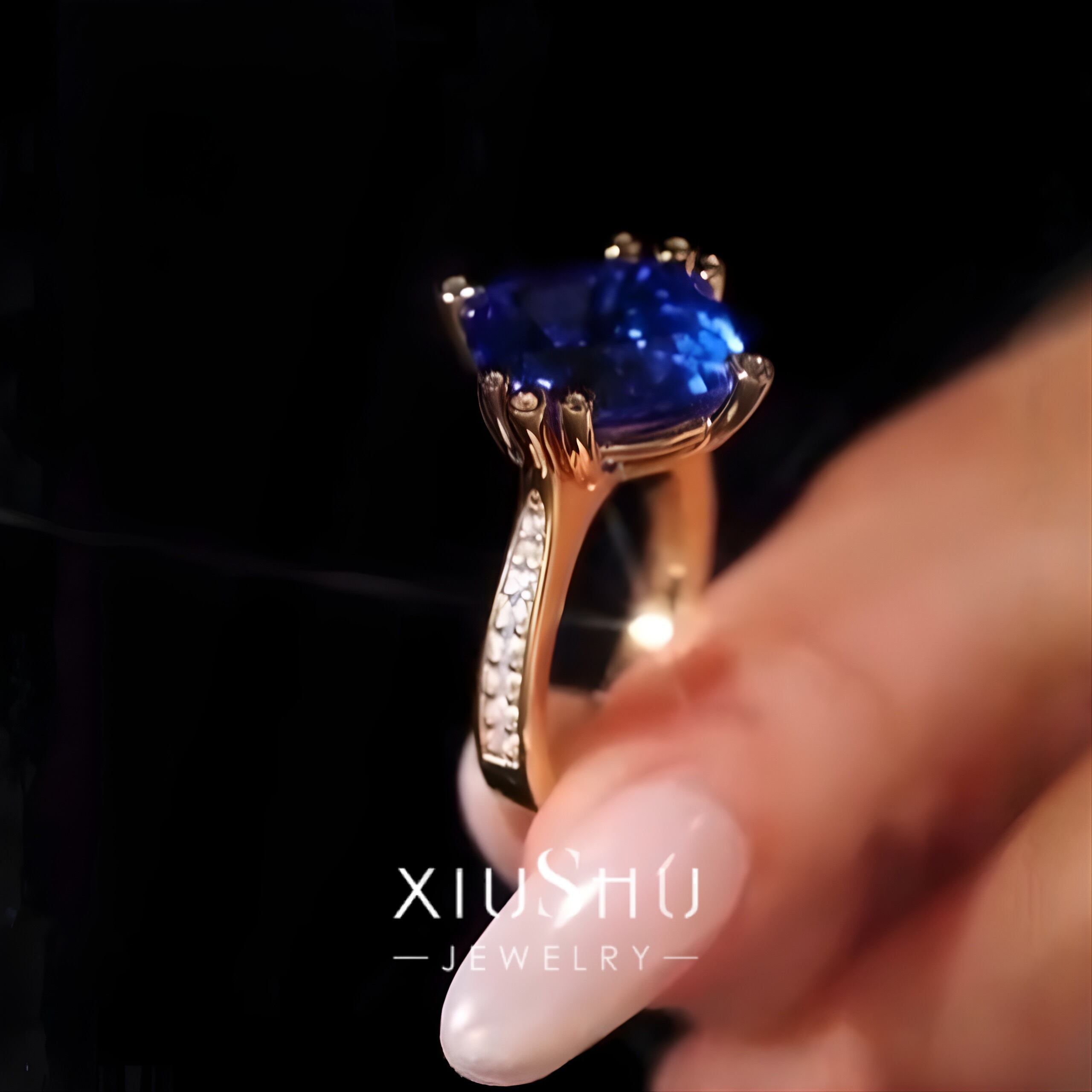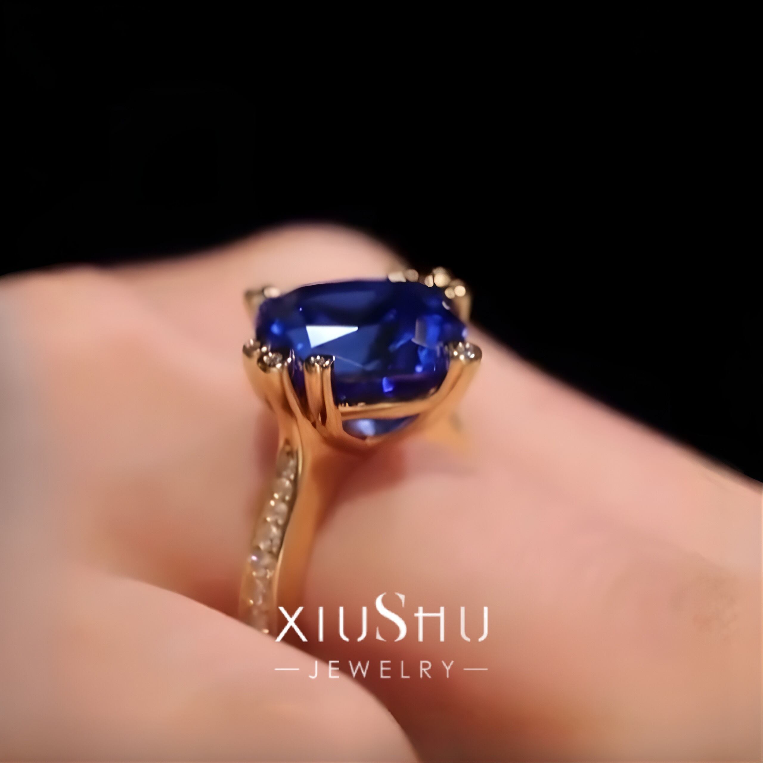 オリジナルの人工サファイアと高炭素ダイヤモンドのリングになります。