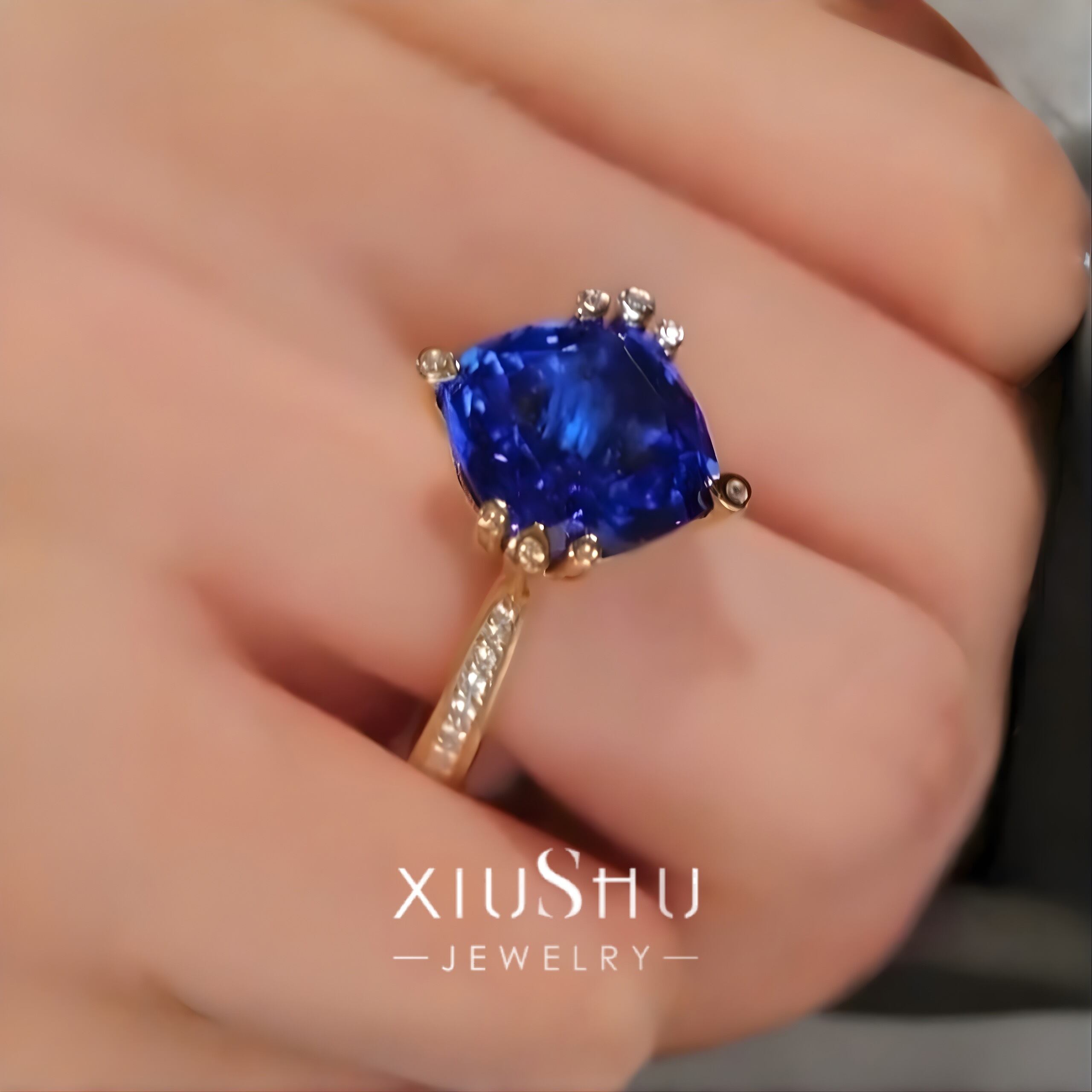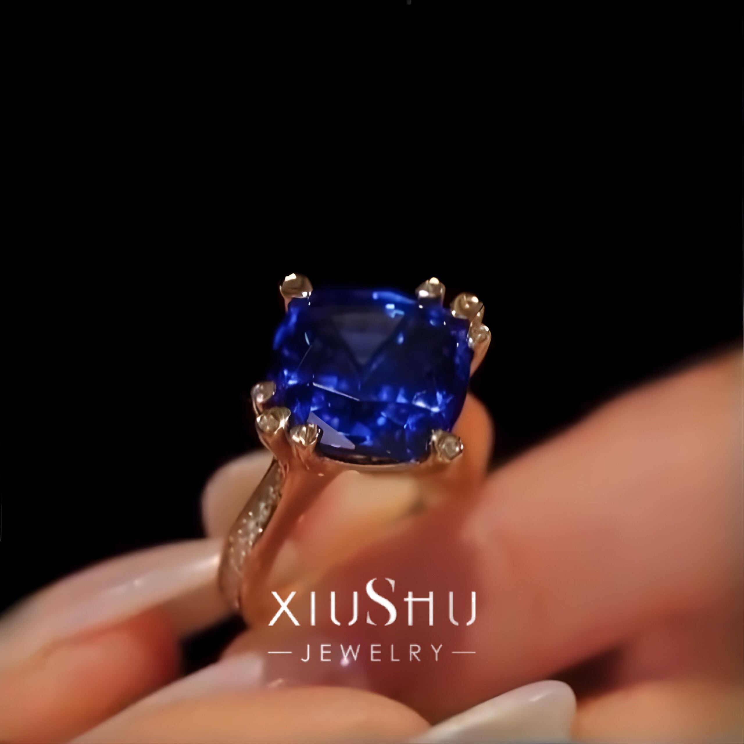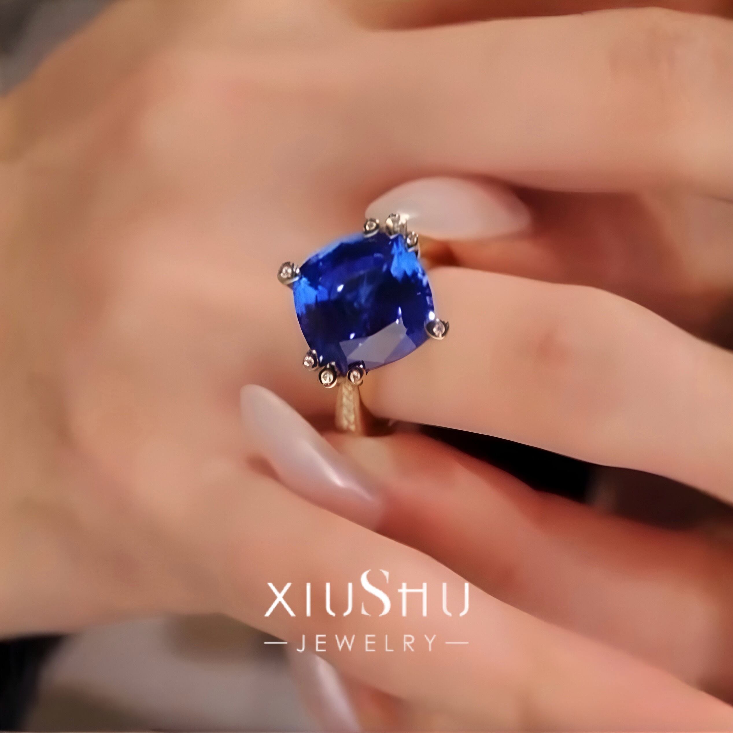 深い澄んだブルーが印象的な人工サファイアに、
