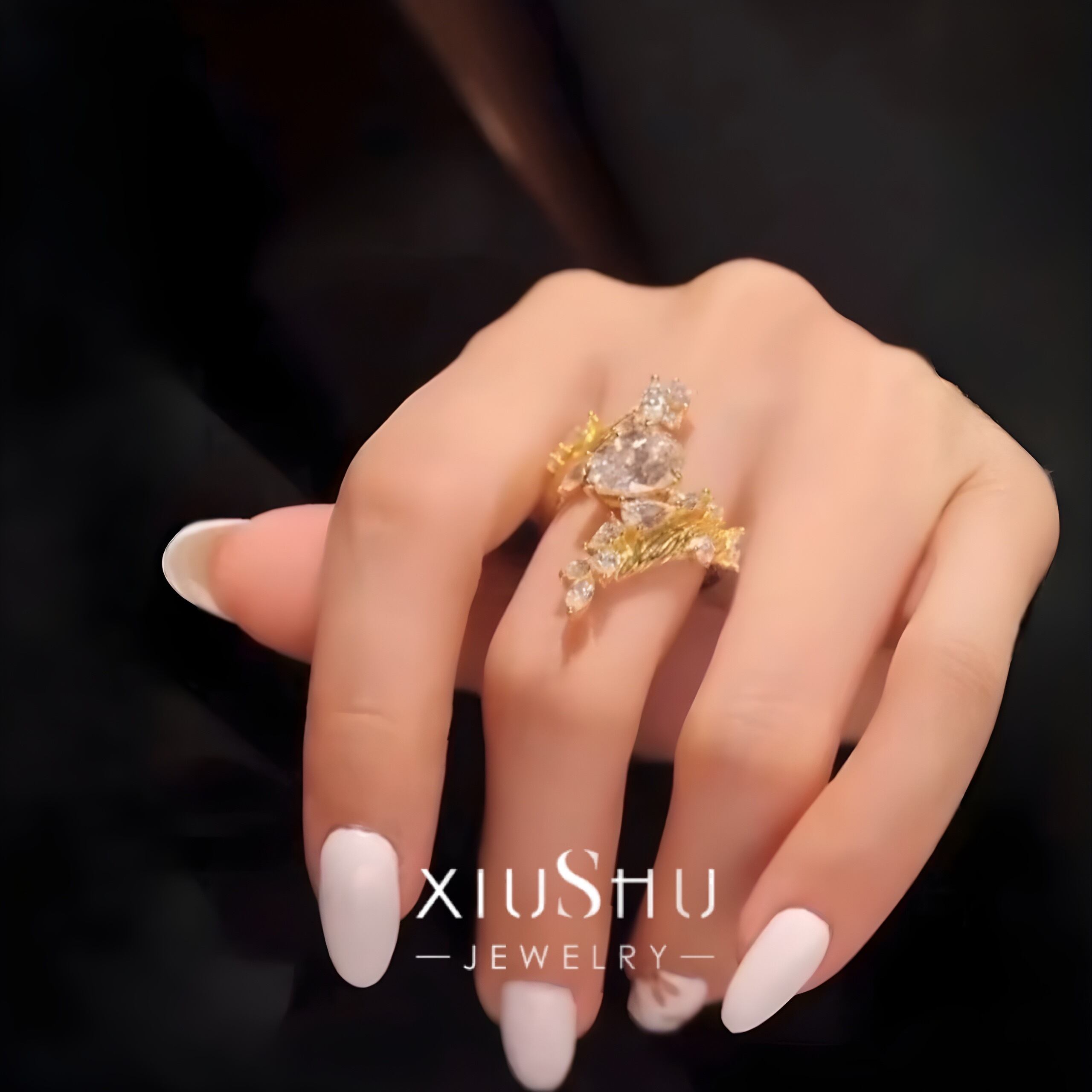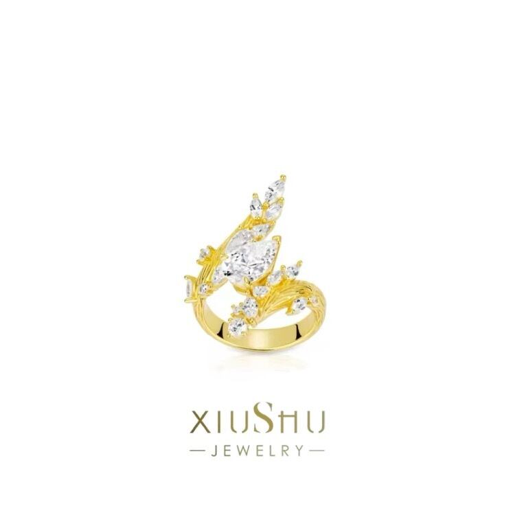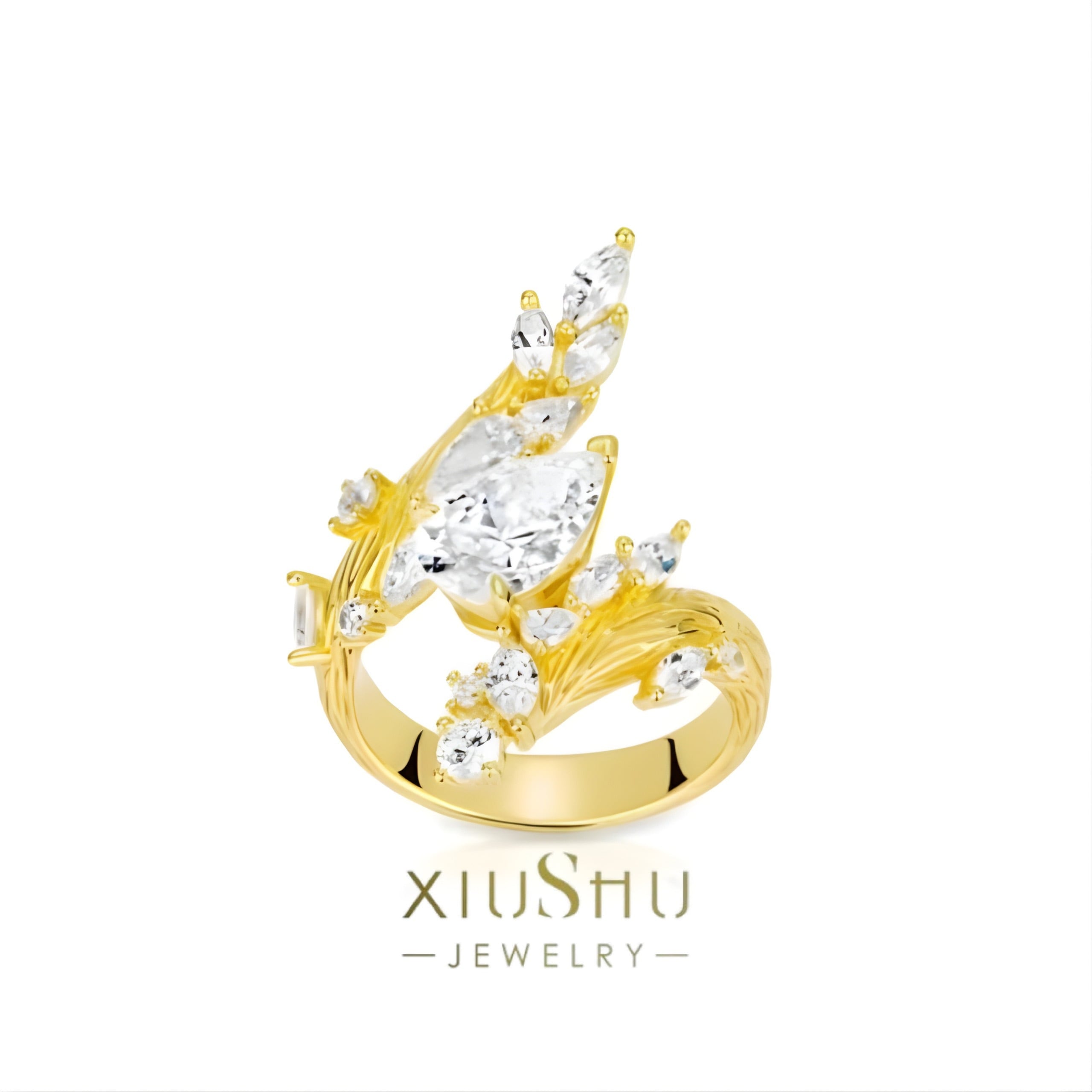 リーフ ペアシェイプ 高炭素ダイヤモンド キラキラ ゴージャス リング 指輪 ハイカーボンダイヤモンド ホワイト レトロ S925 シルバー925 葉 ビッグ ラージ ゴールドメッキ アート 彫刻