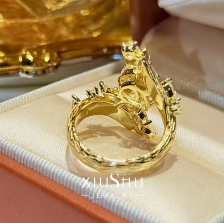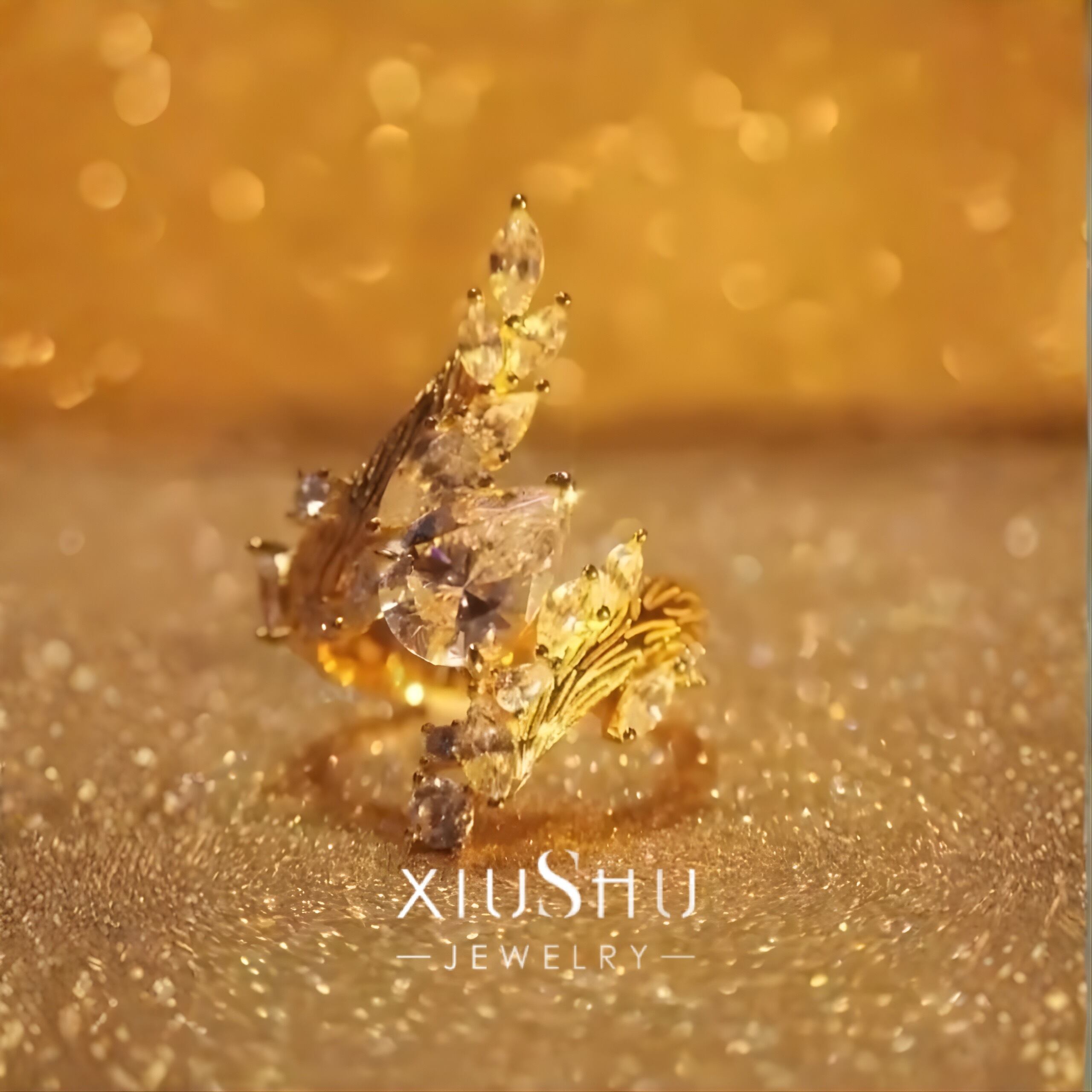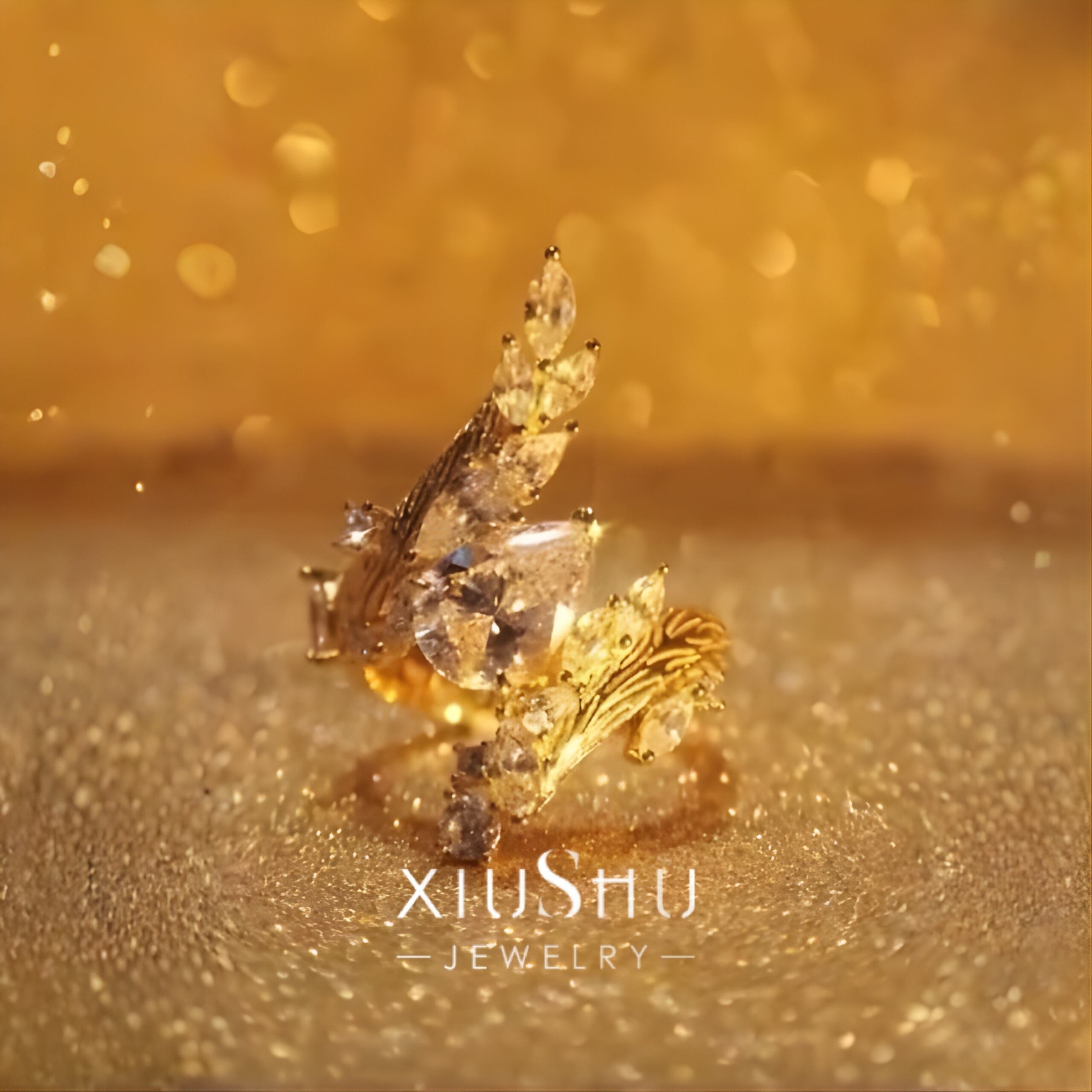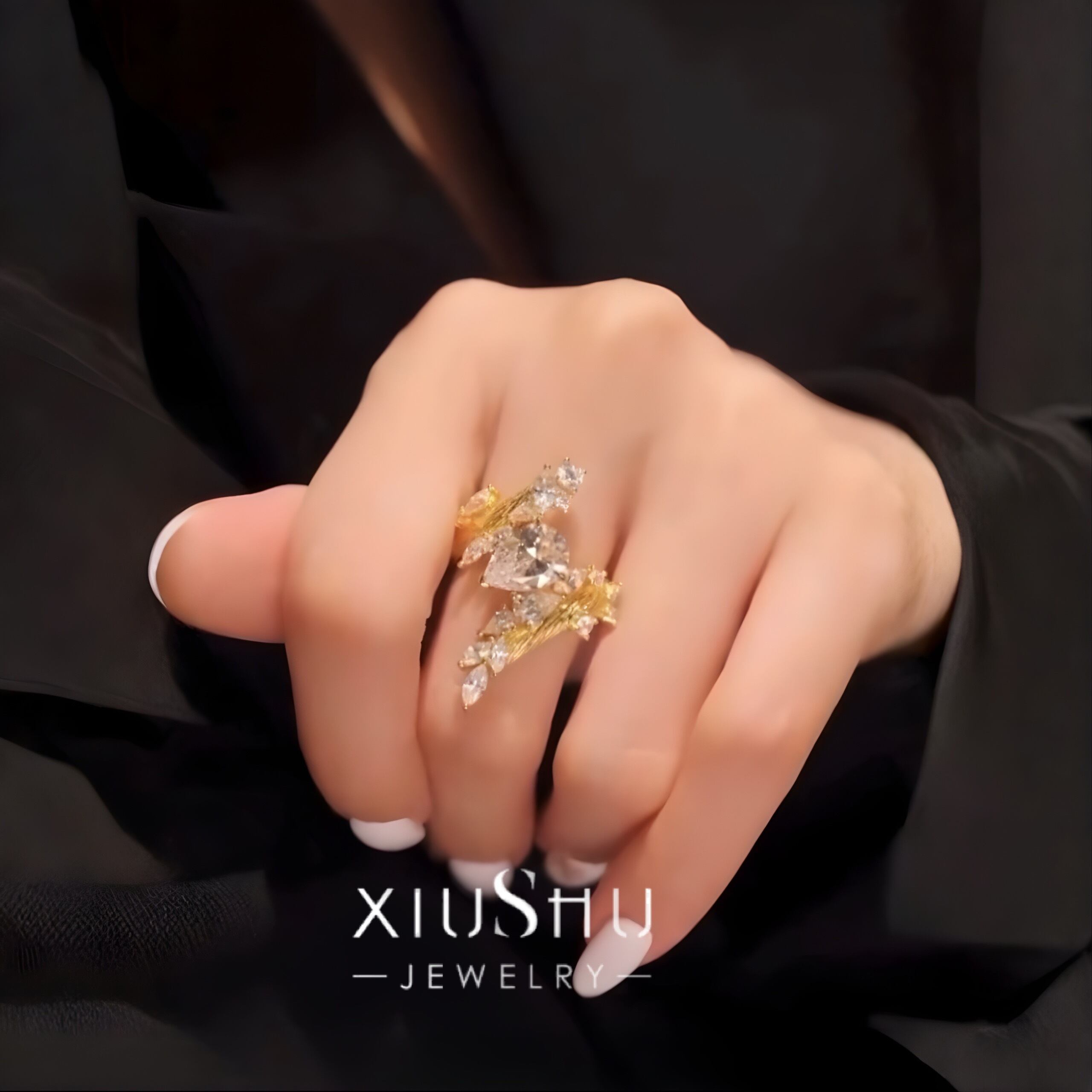 リーフ ペアシェイプ 高炭素ダイヤモンド キラキラ ゴージャス リング 指輪 ハイカーボンダイヤモンド ホワイト レトロ S925 シルバー925 葉 ビッグ ラージ ゴールドメッキ アート 彫刻