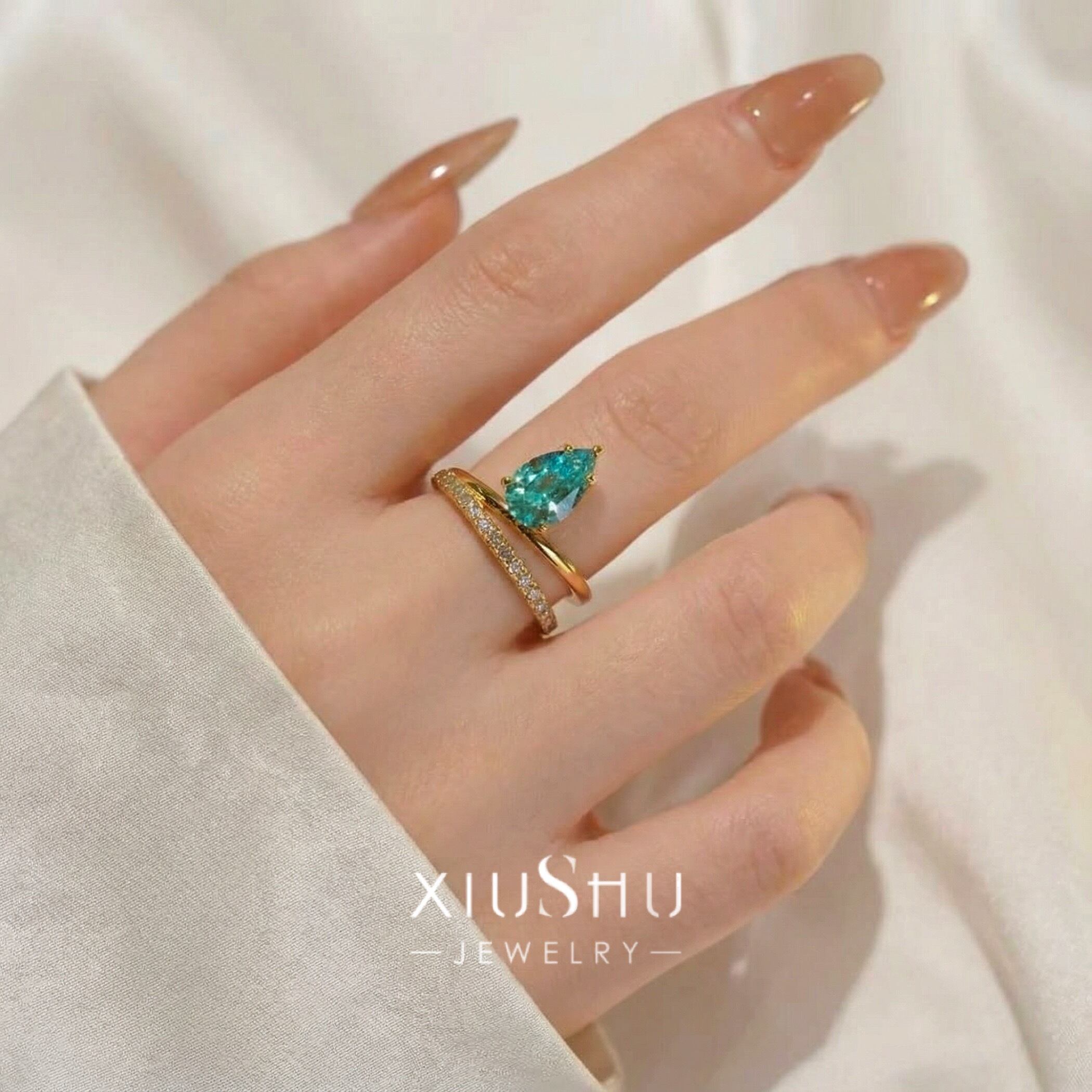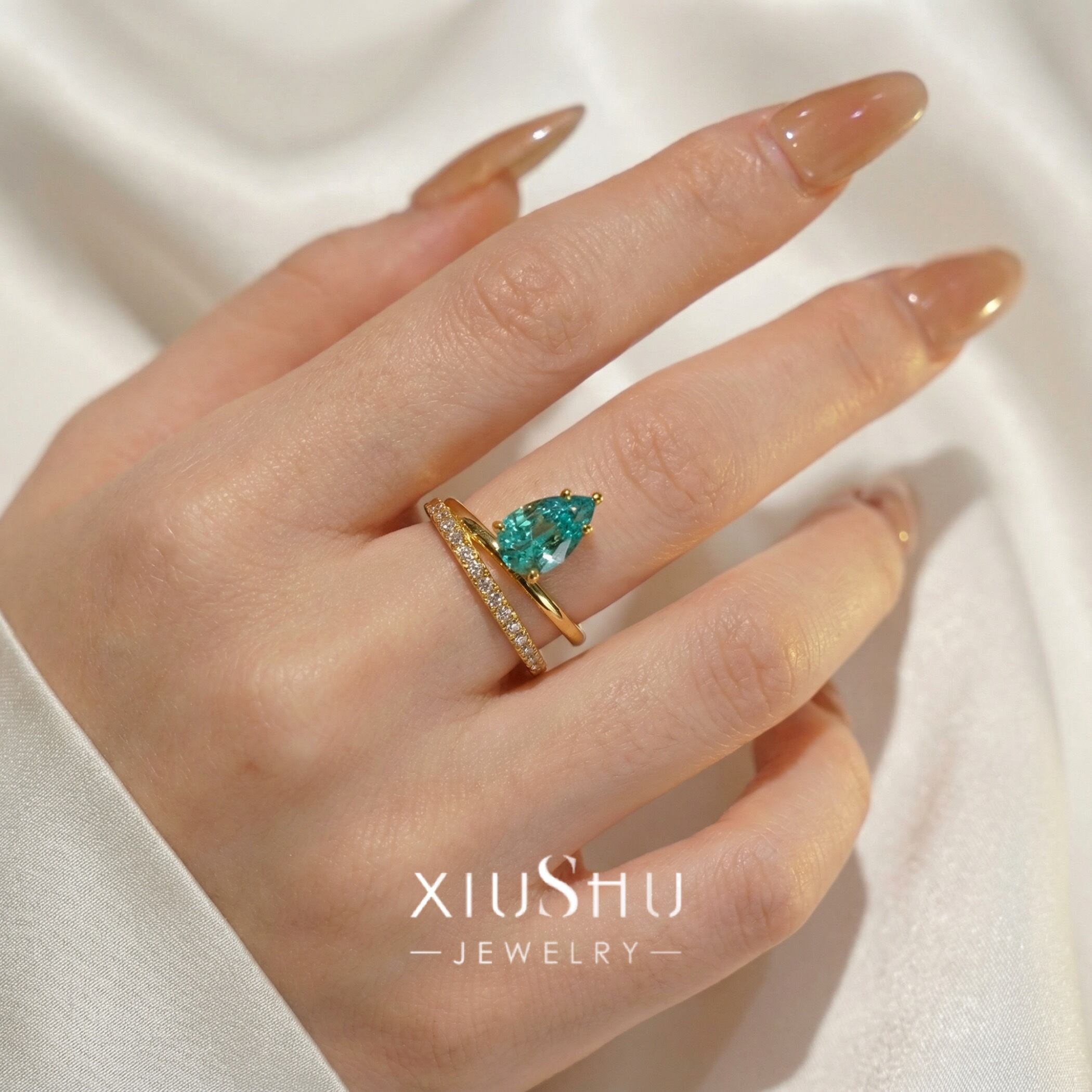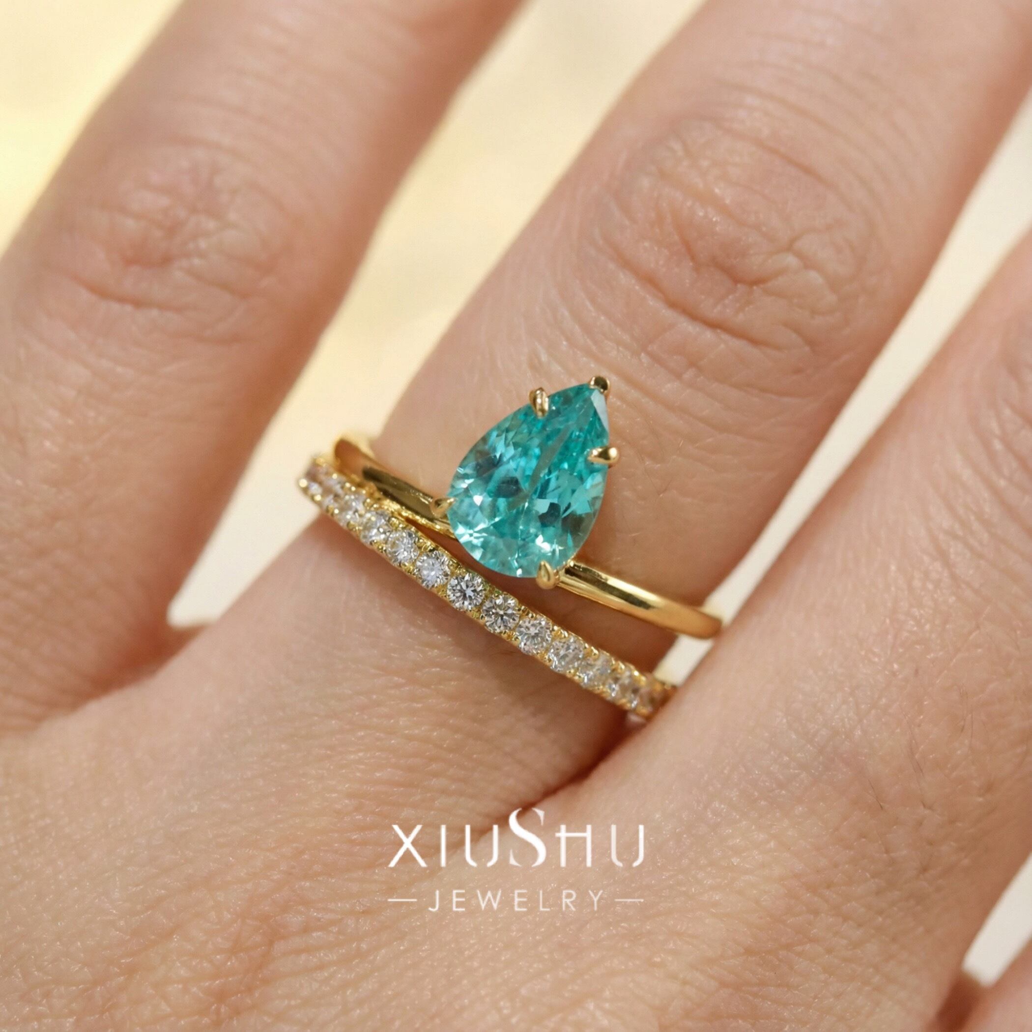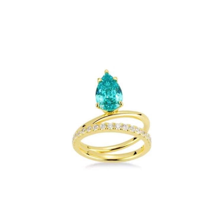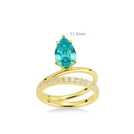 人工パライバトルマリン ペアシェイプ 高炭素ダイヤモンド キラキラ ゴージャス リング 指輪 ハイカーボンダイヤモンド レトロ S925 シルバー925 ブルー グリーン 緑 青 ゴールドメッキ ドロップ ダブルリング