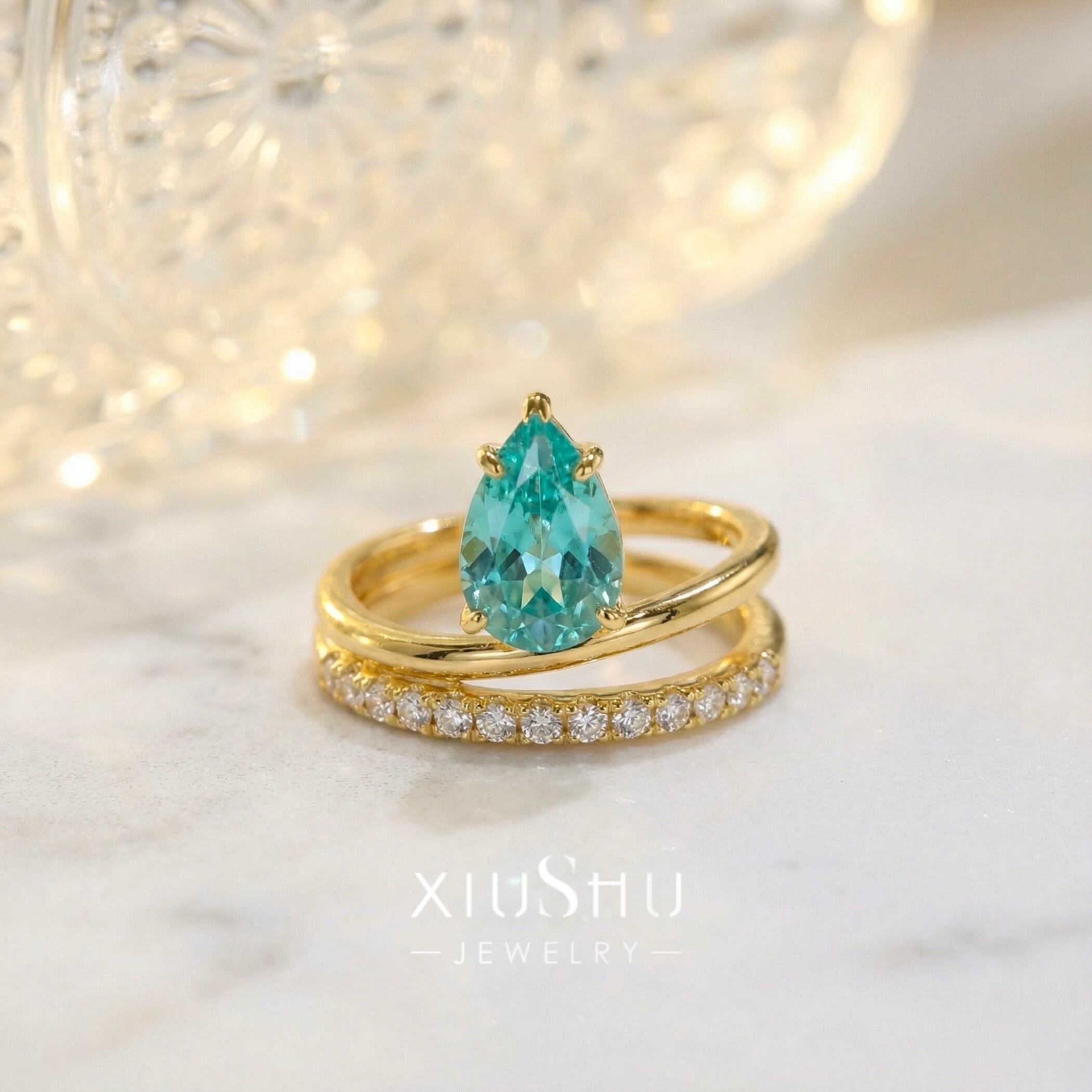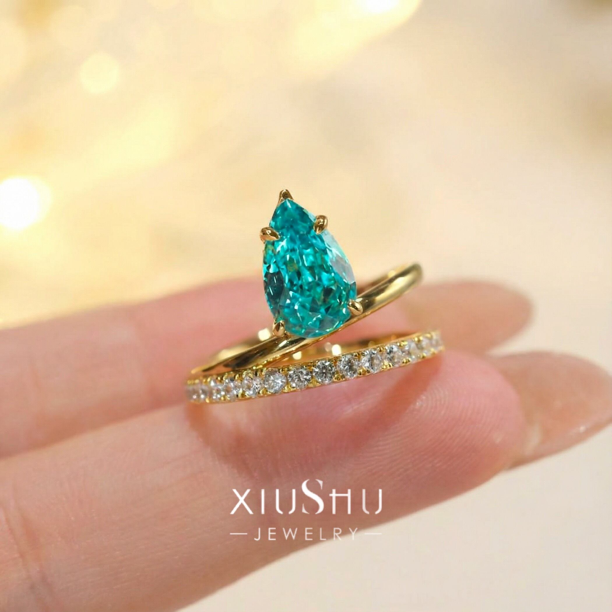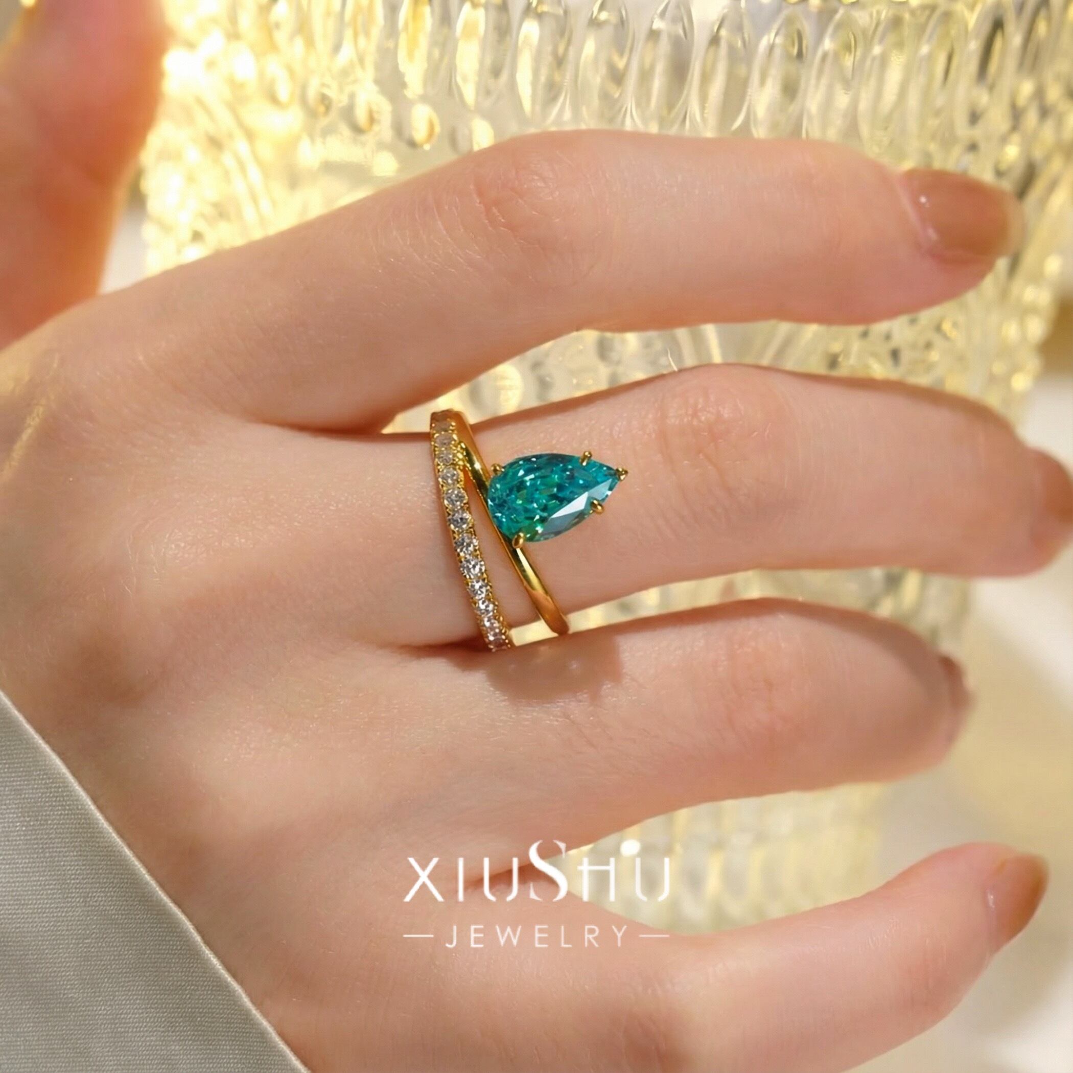 人工パライバトルマリン ペアシェイプ 高炭素ダイヤモンド キラキラ ゴージャス リング 指輪 ハイカーボンダイヤモンド レトロ S925 シルバー925 ブルー グリーン 緑 青 ゴールドメッキ ドロップ ダブルリング