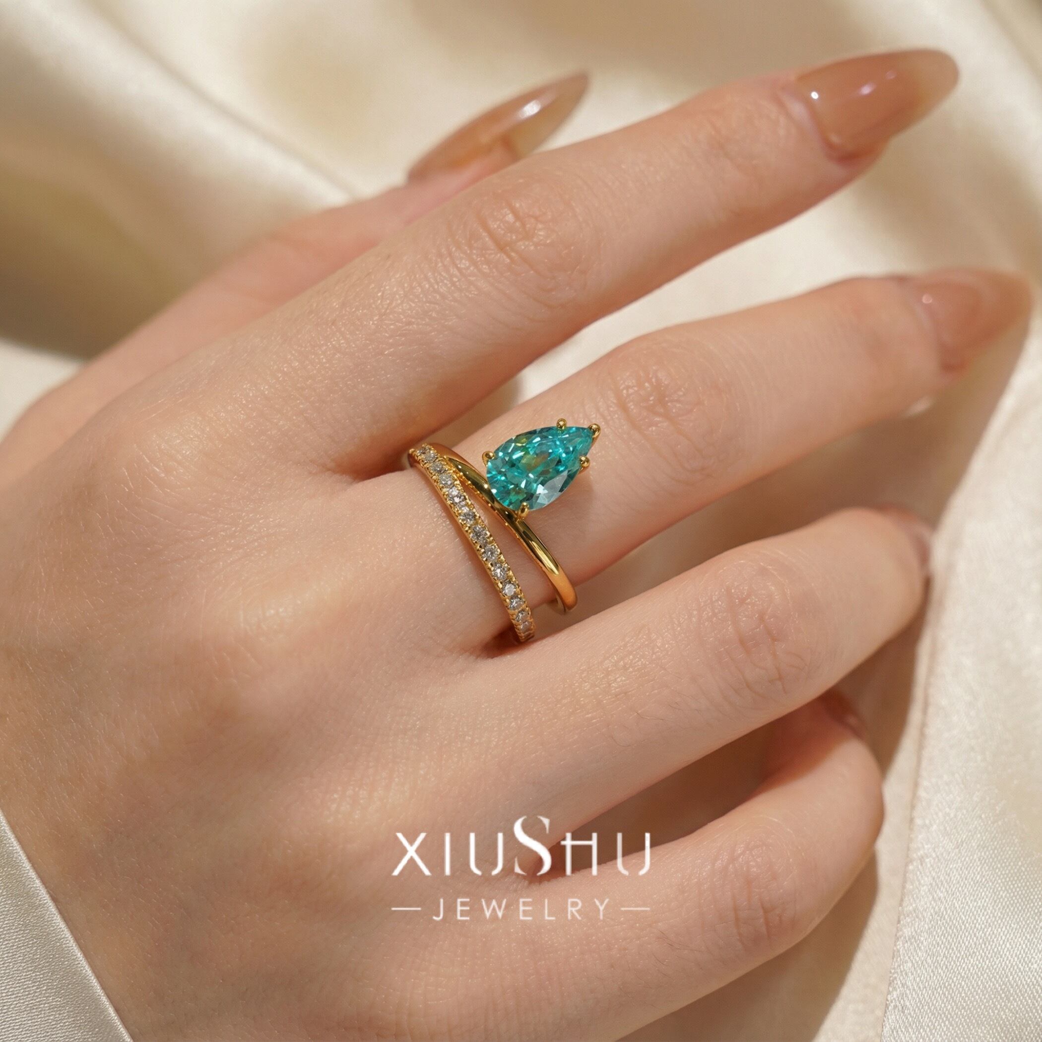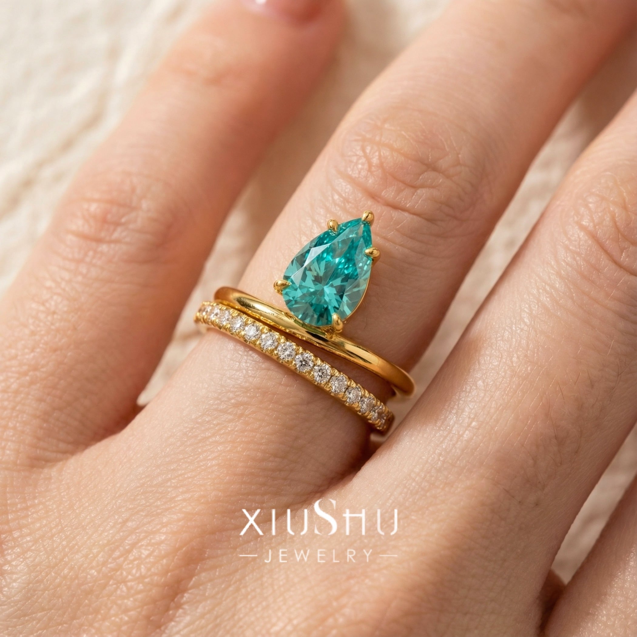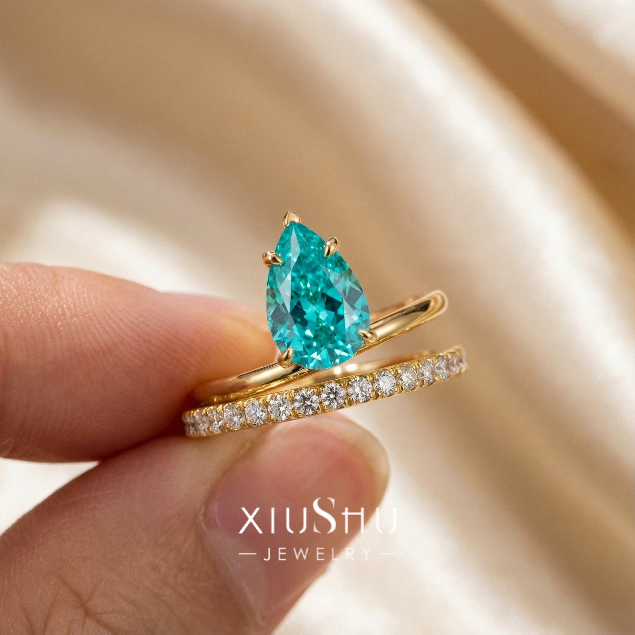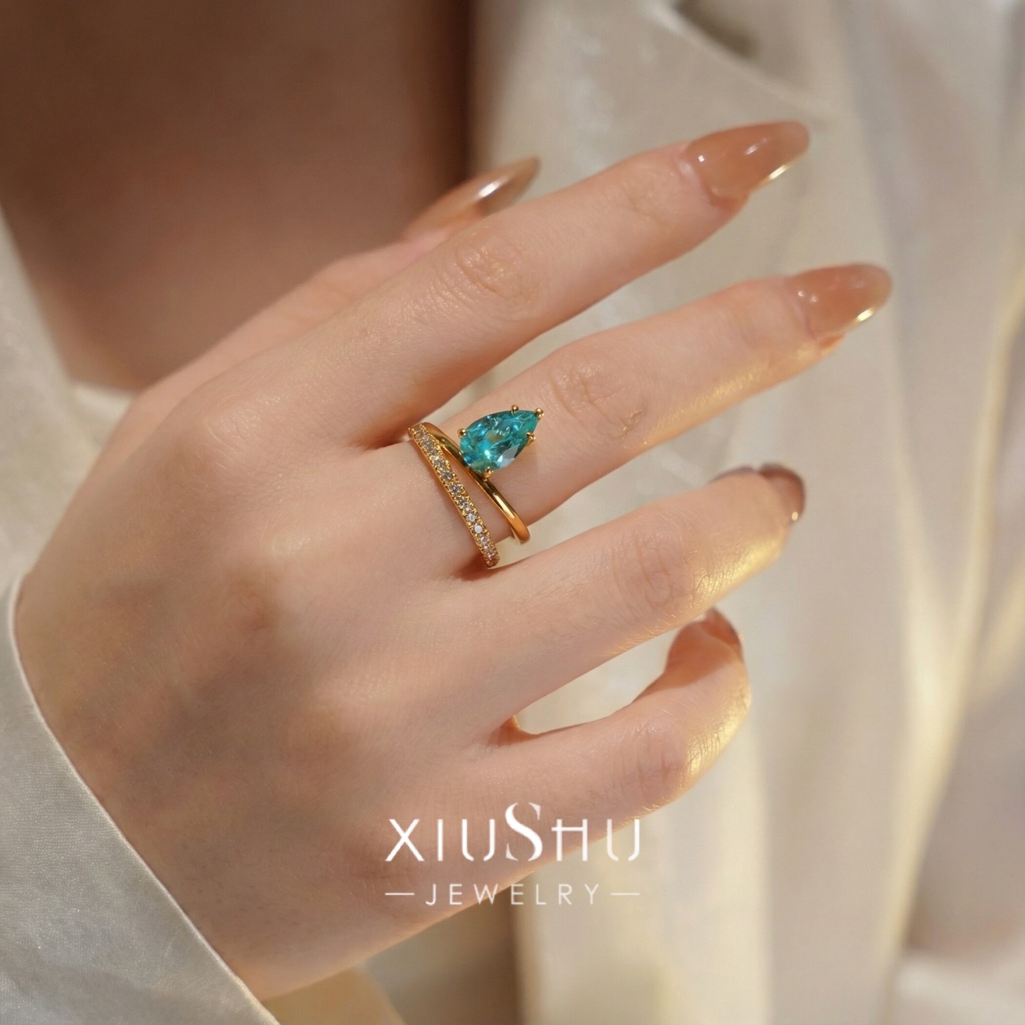 人工パライバトルマリン ペアシェイプ 高炭素ダイヤモンド キラキラ ゴージャス リング 指輪 ハイカーボンダイヤモンド レトロ S925 シルバー925 ブルー グリーン 緑 青 ゴールドメッキ ドロップ ダブルリング