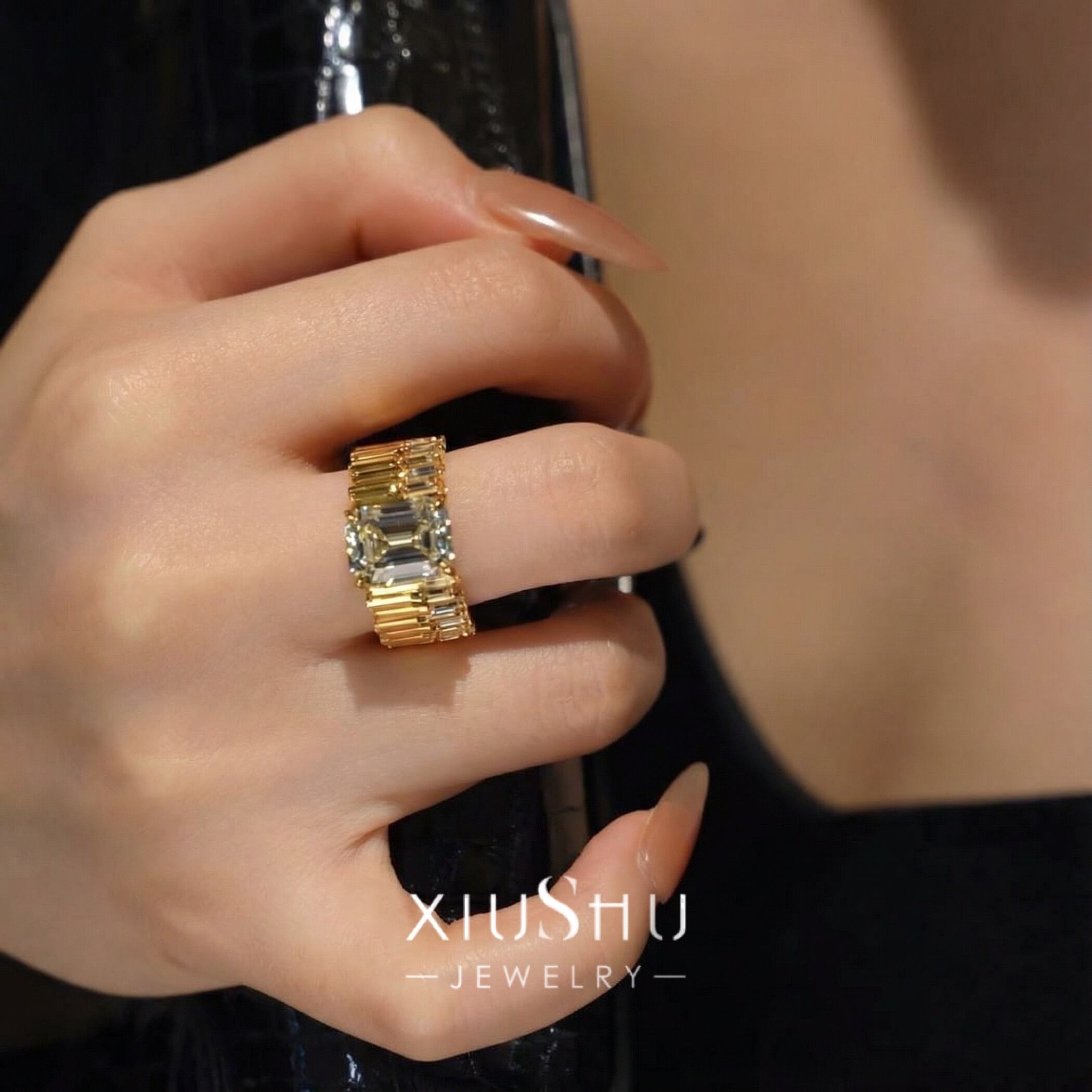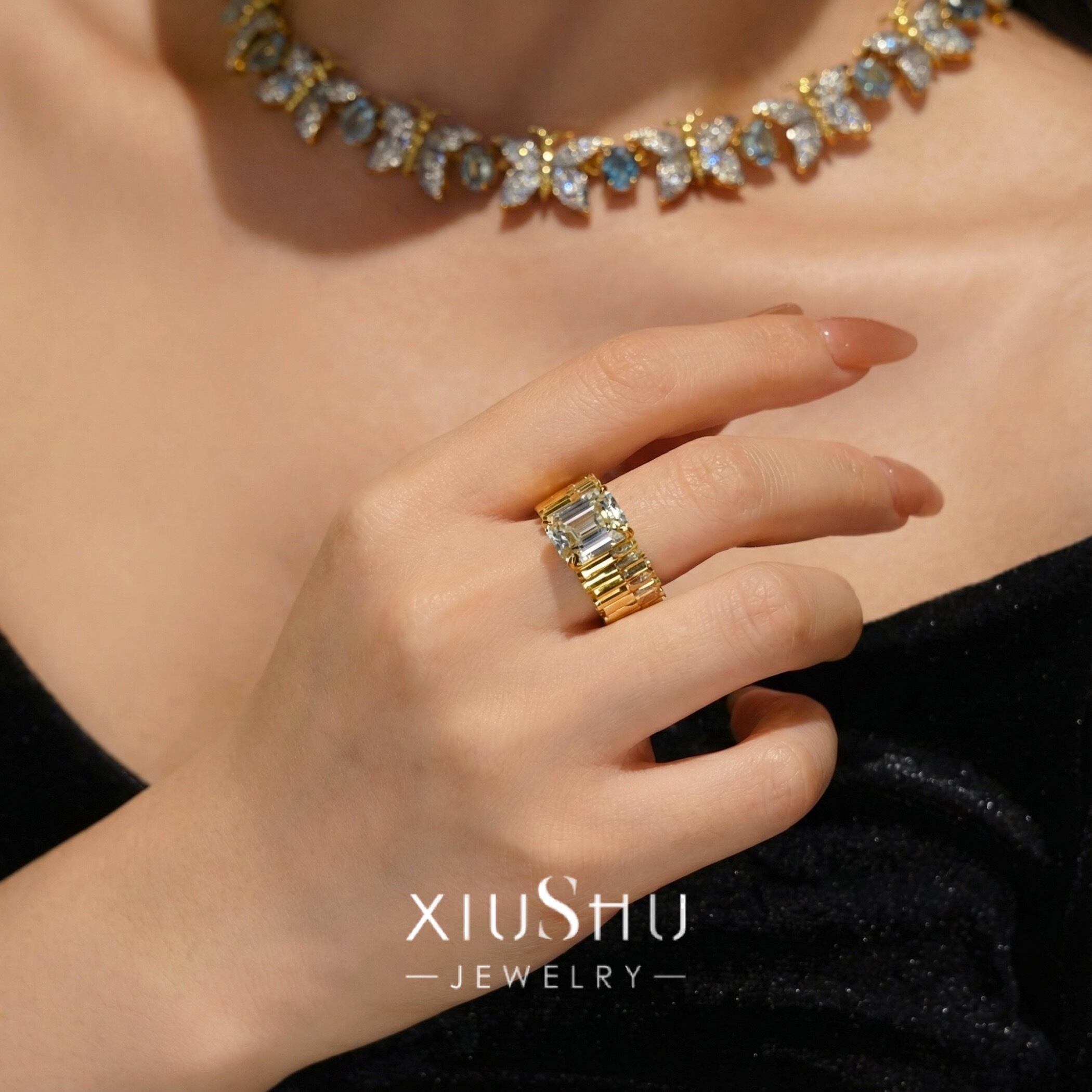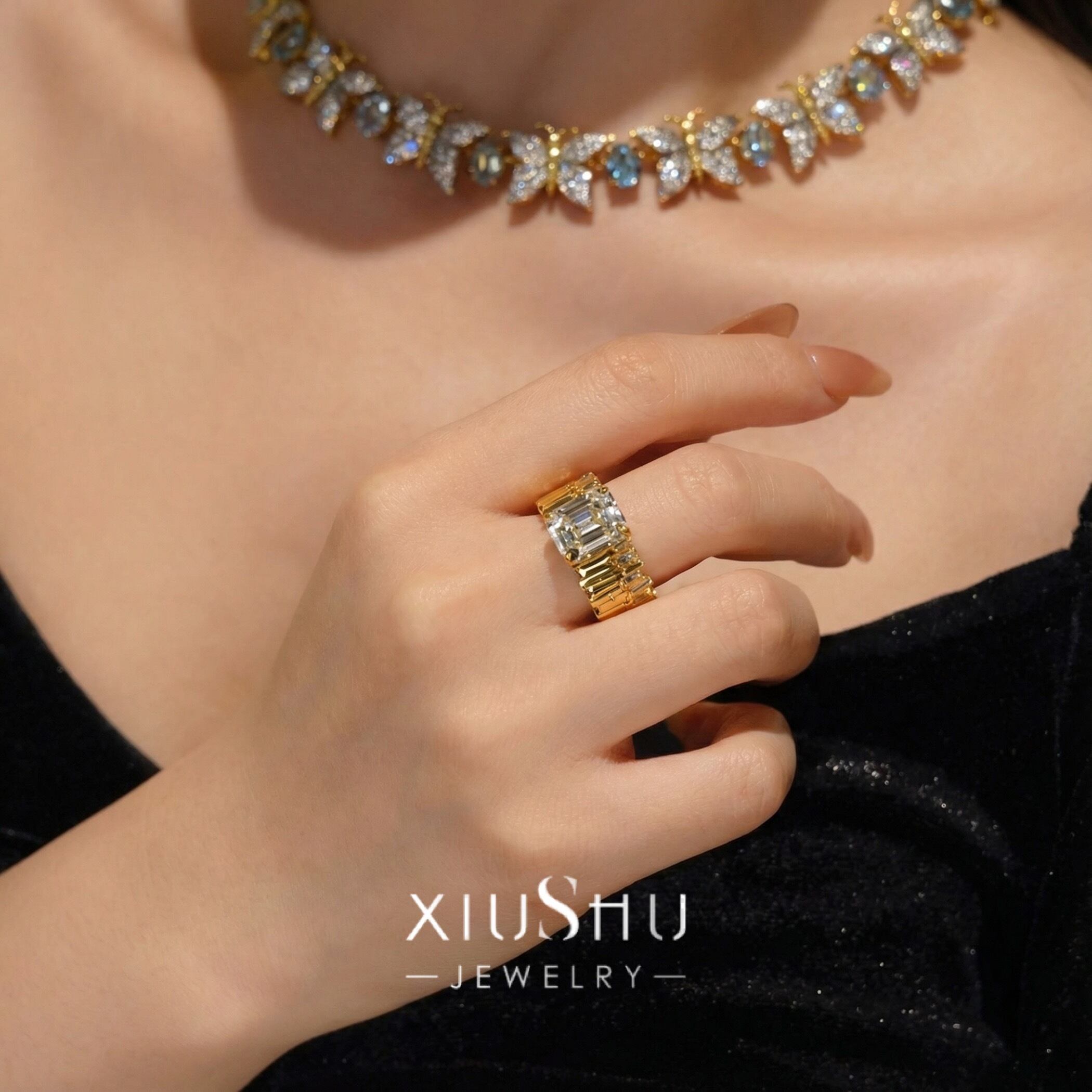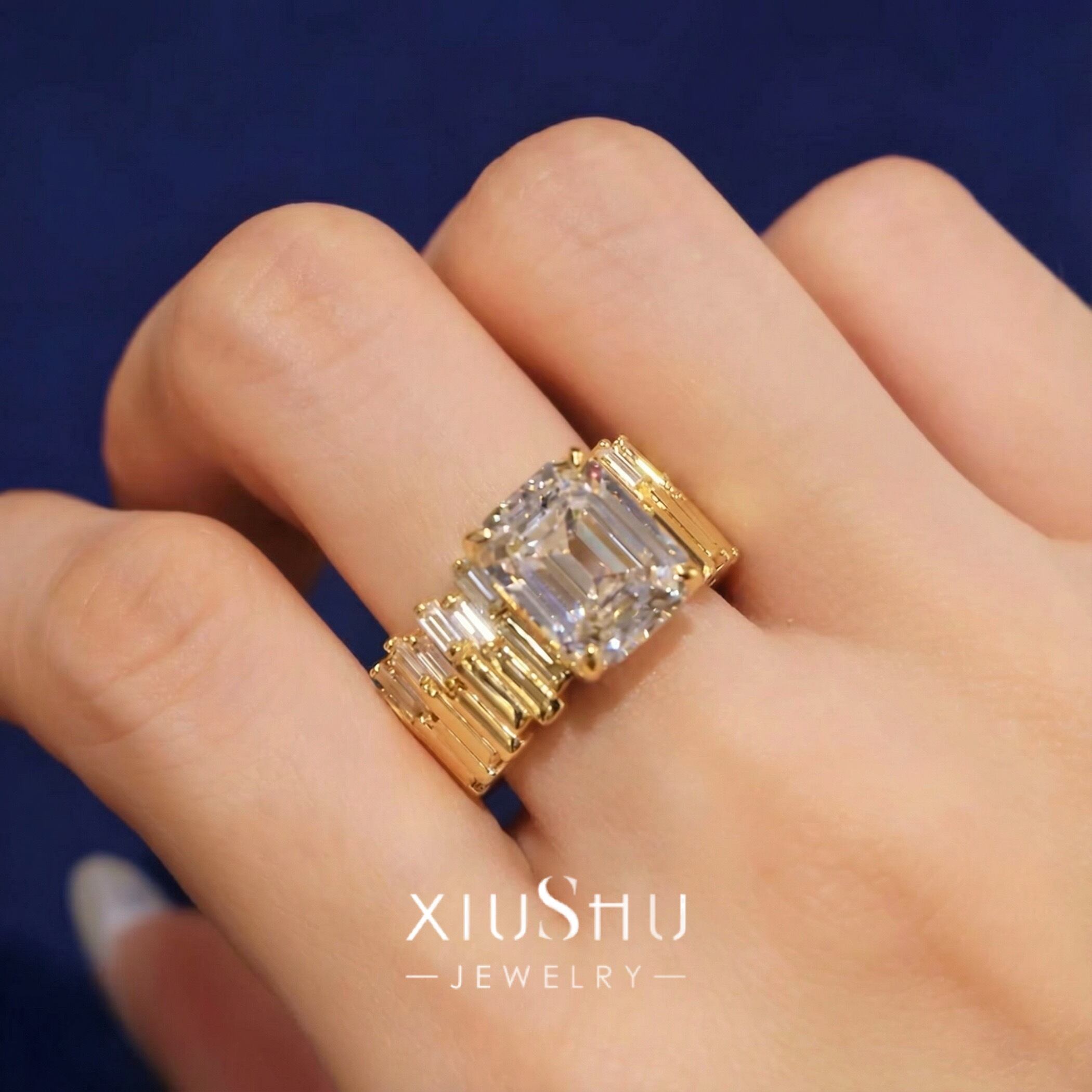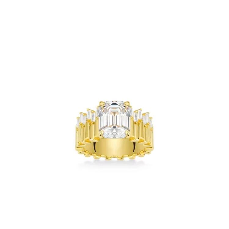 エメラルドカット 高炭素ダイヤモンド キラキラ ゴージャス リング 指輪 ハイカーボンダイヤモンド ホワイト レトロ S925 シルバー925 ゴールドメッキ ワイドリング クール