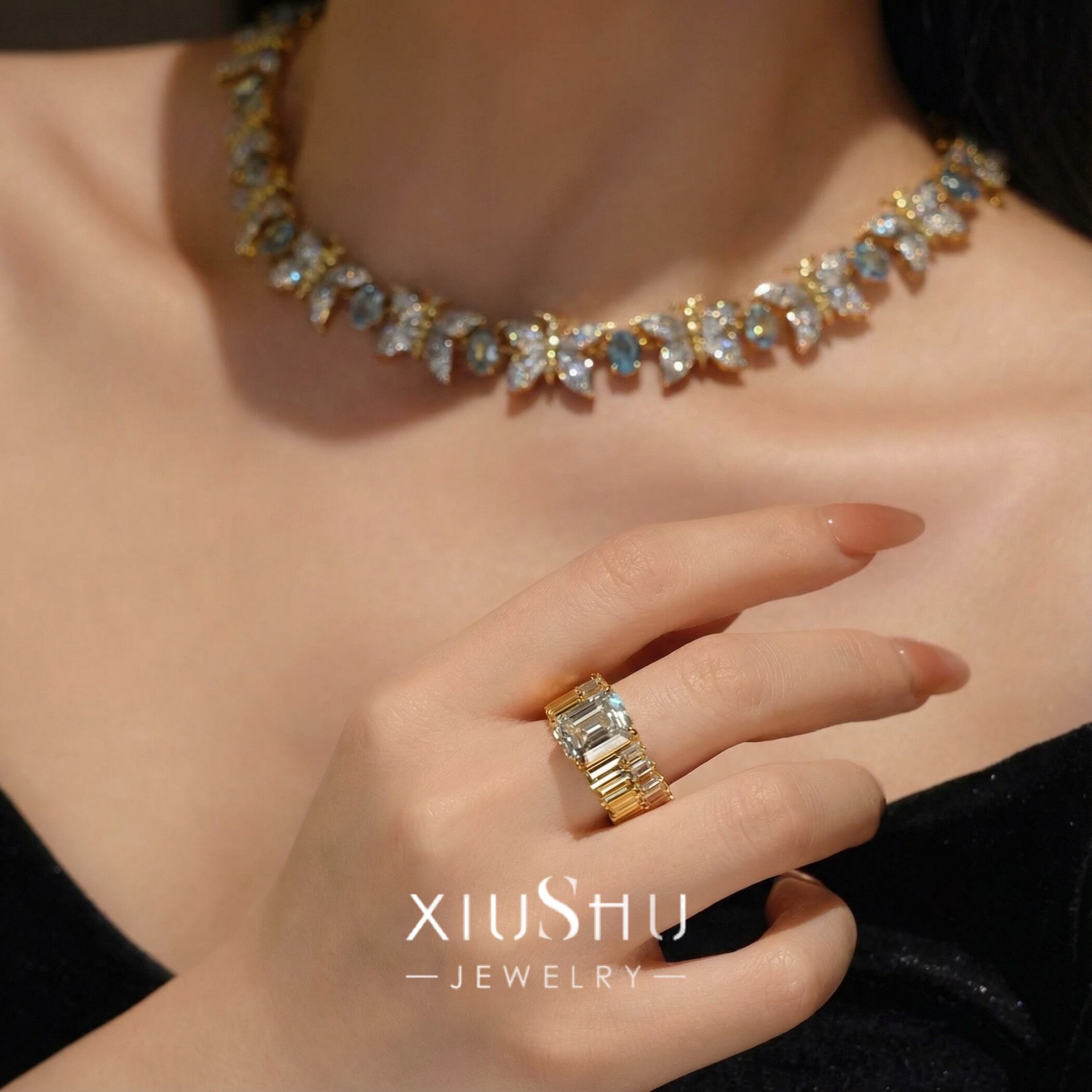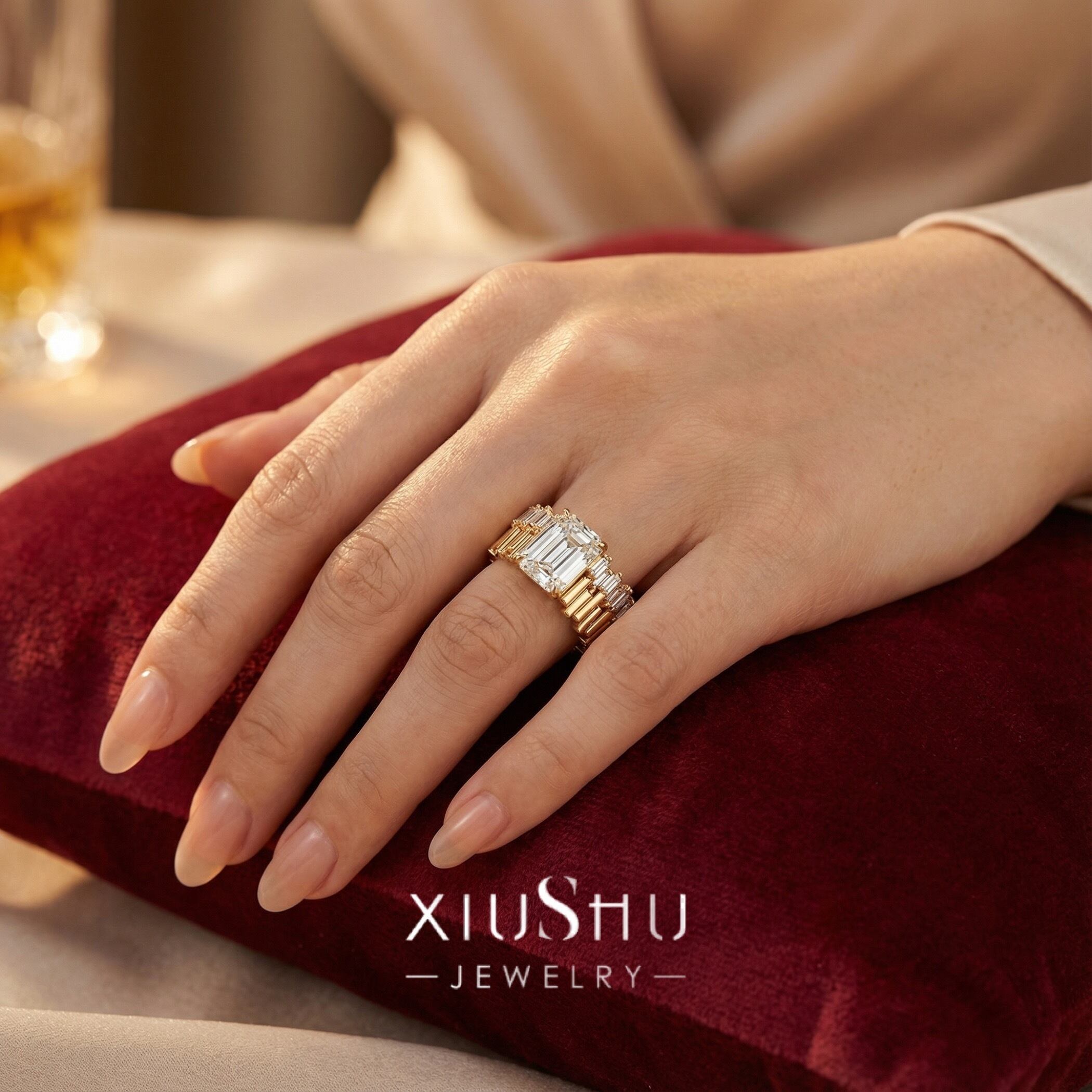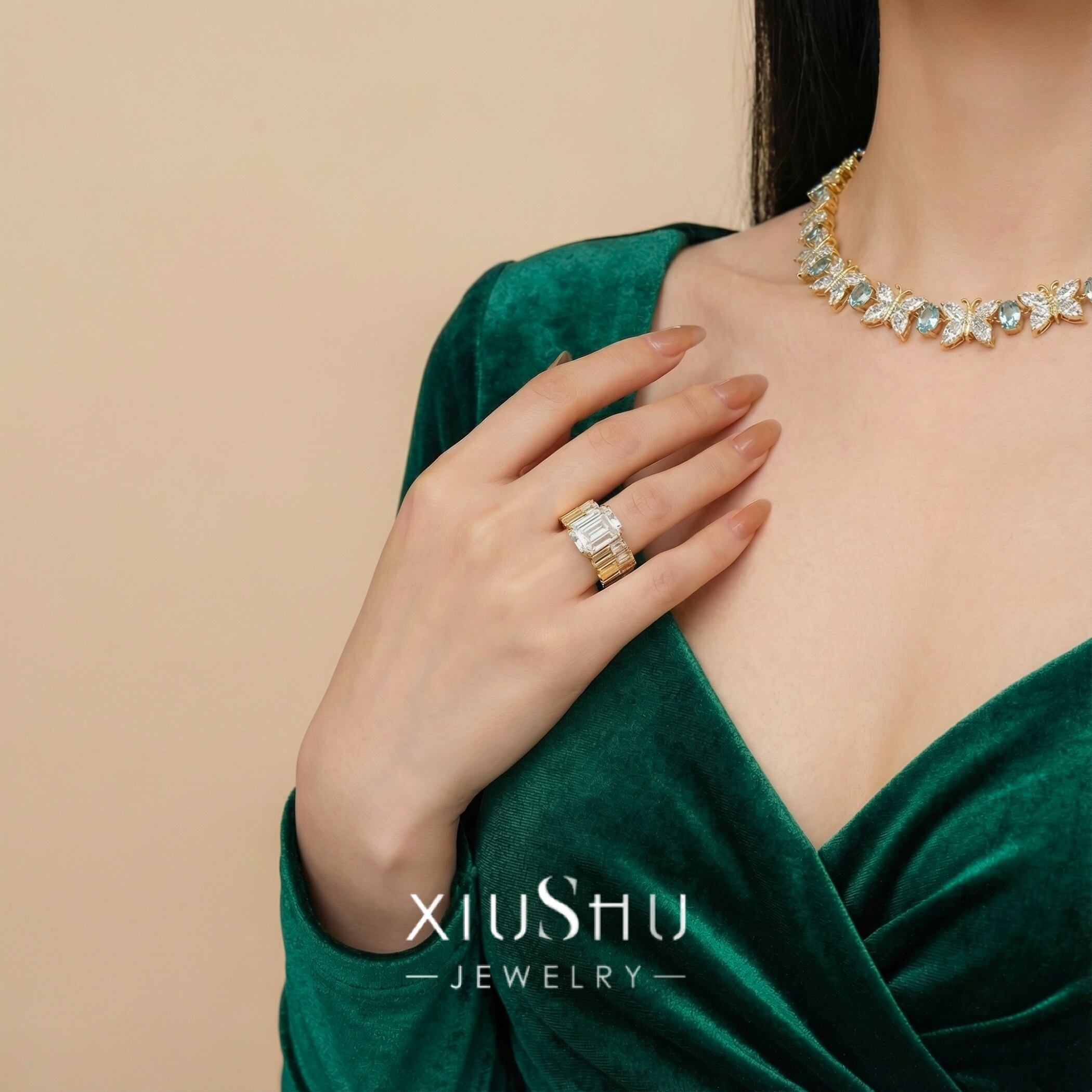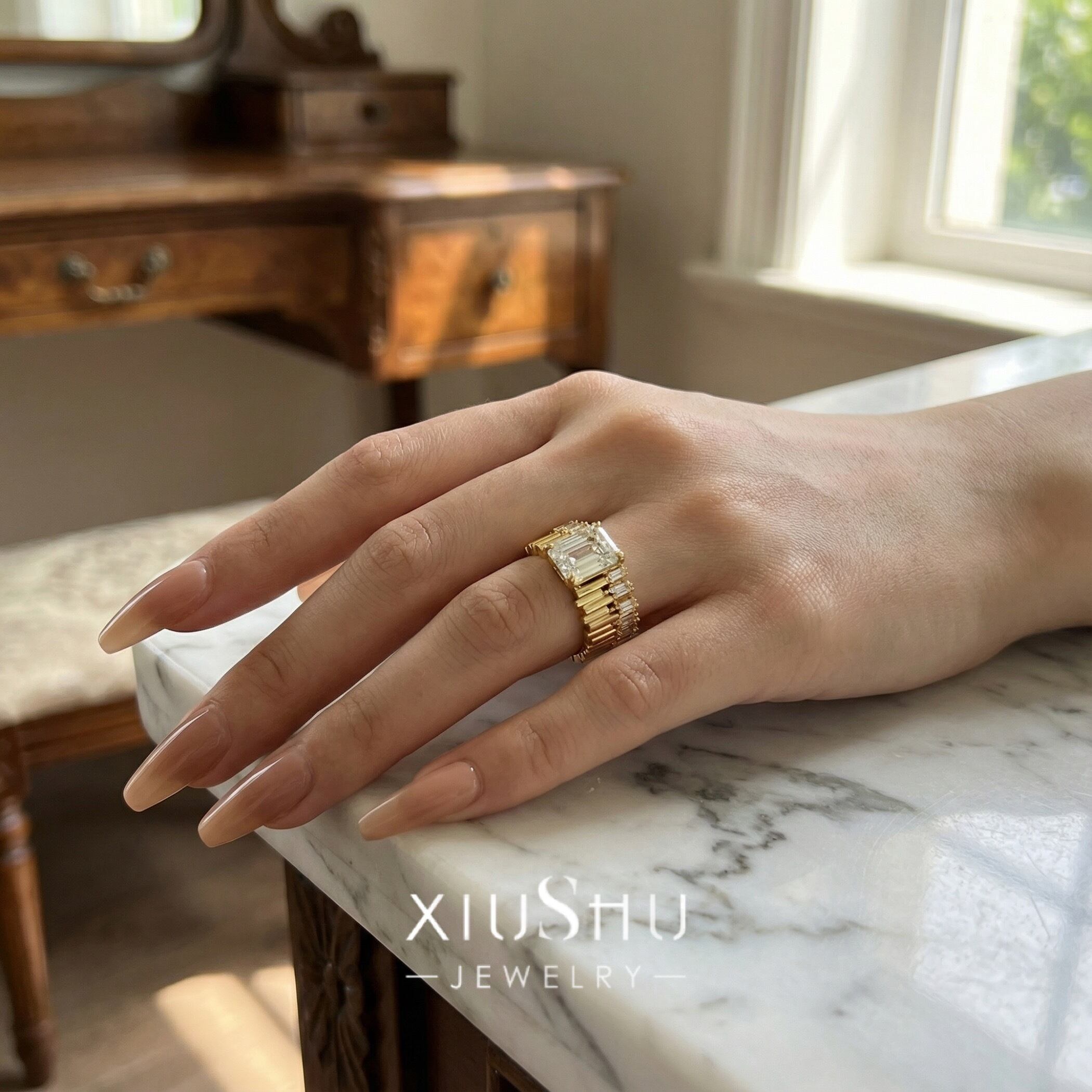 エメラルドカット 高炭素ダイヤモンド キラキラ ゴージャス リング 指輪 ハイカーボンダイヤモンド ホワイト レトロ S925 シルバー925 ゴールドメッキ ワイドリング クール