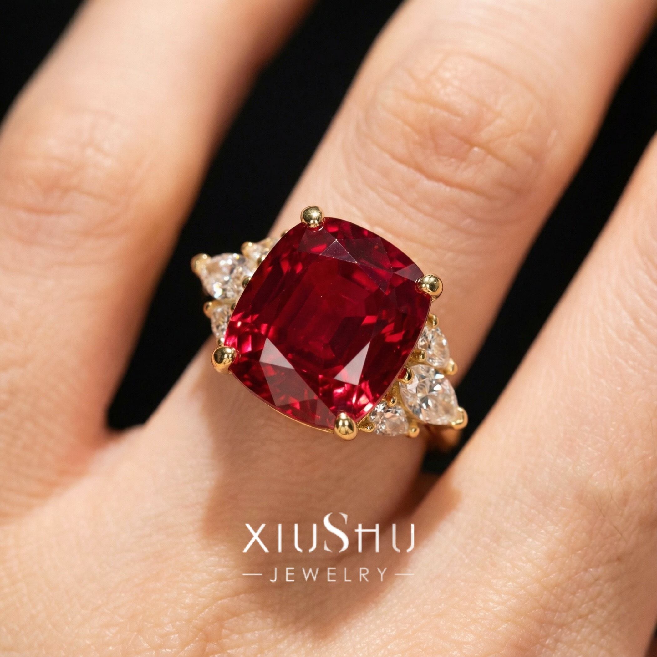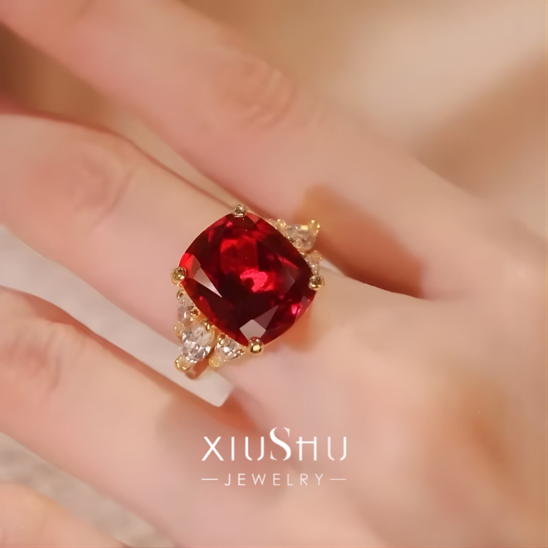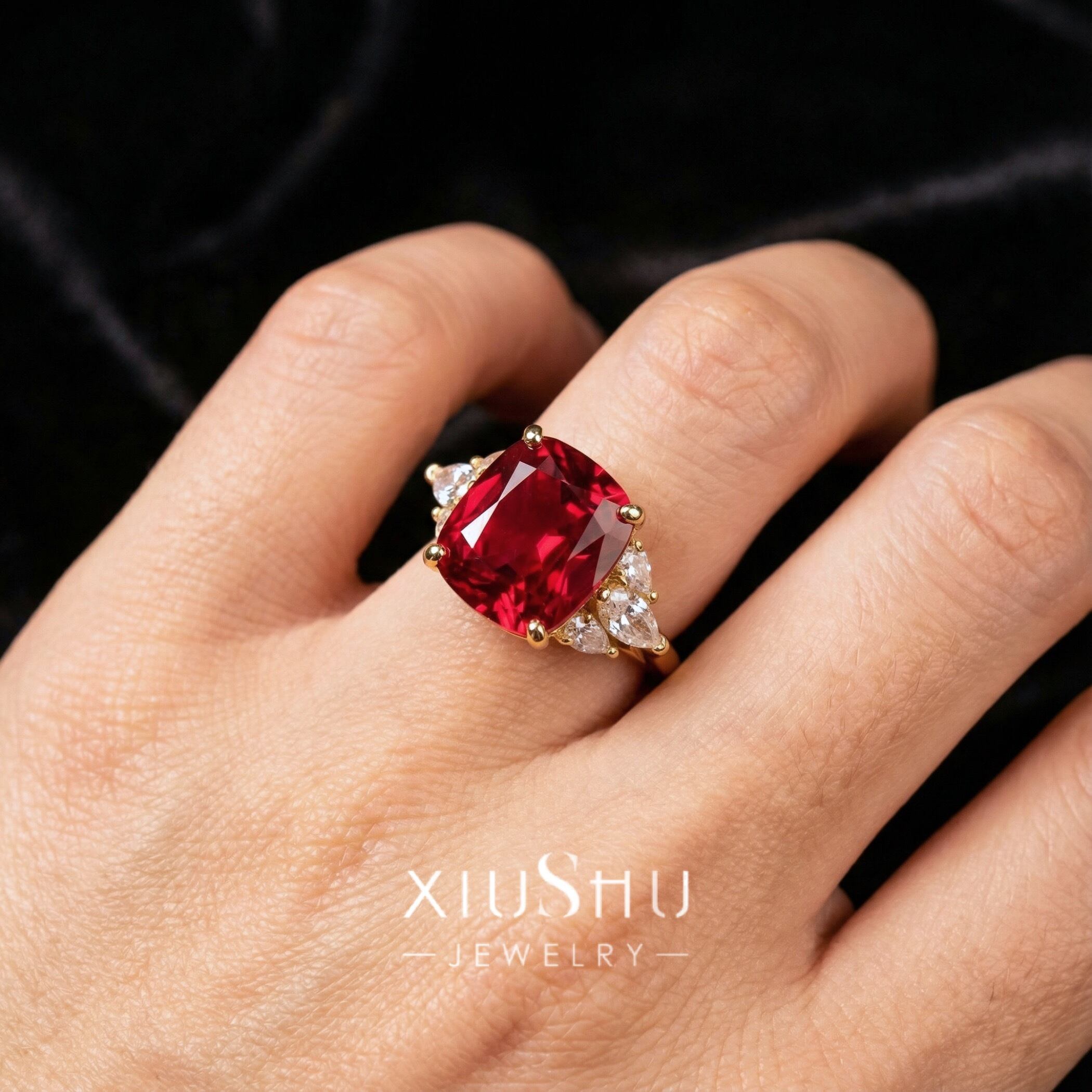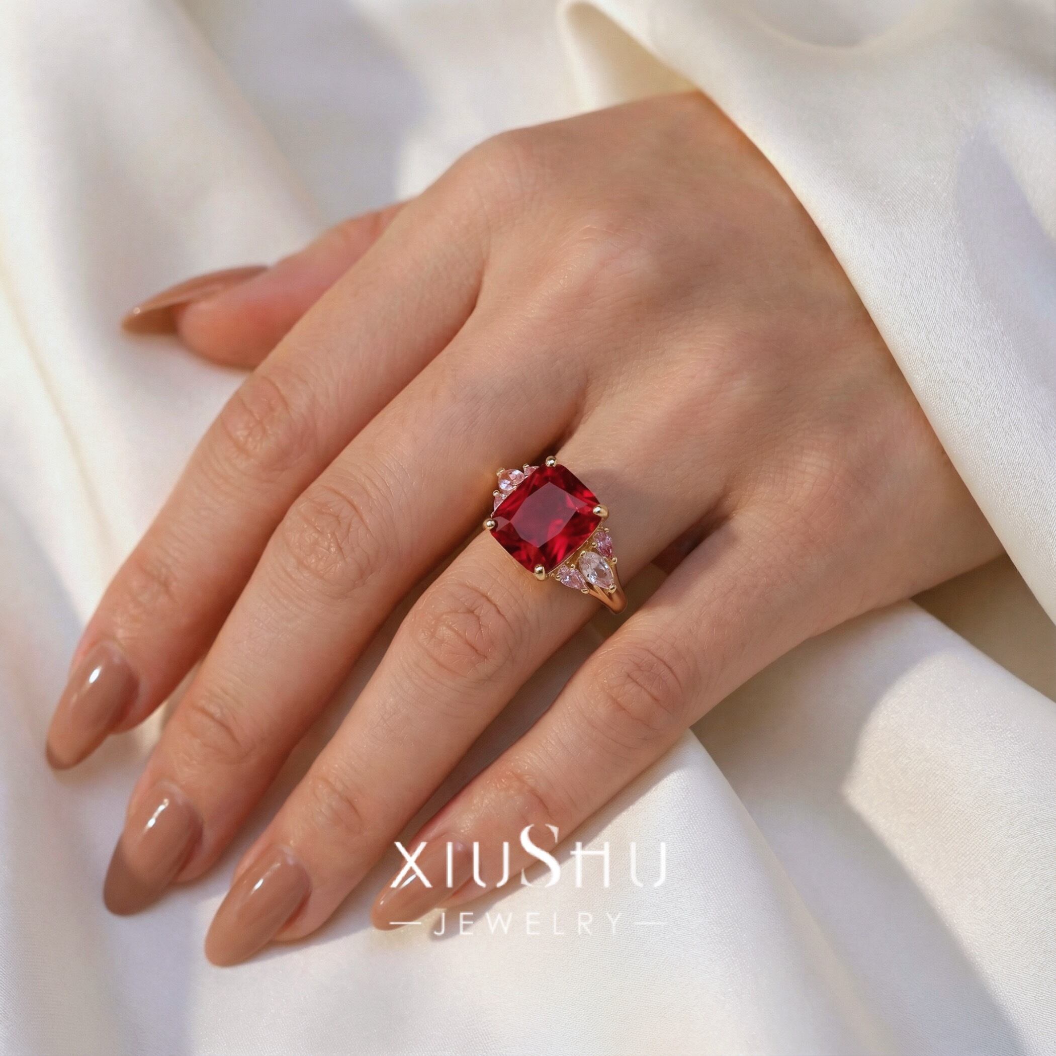 鮮やかな人工ルビーを主石に、両脇にはハイカーボンダイヤモンドをあしらったエレガントなリング。華やかさと上品さを兼ね備え、指先を印象的に彩ります。