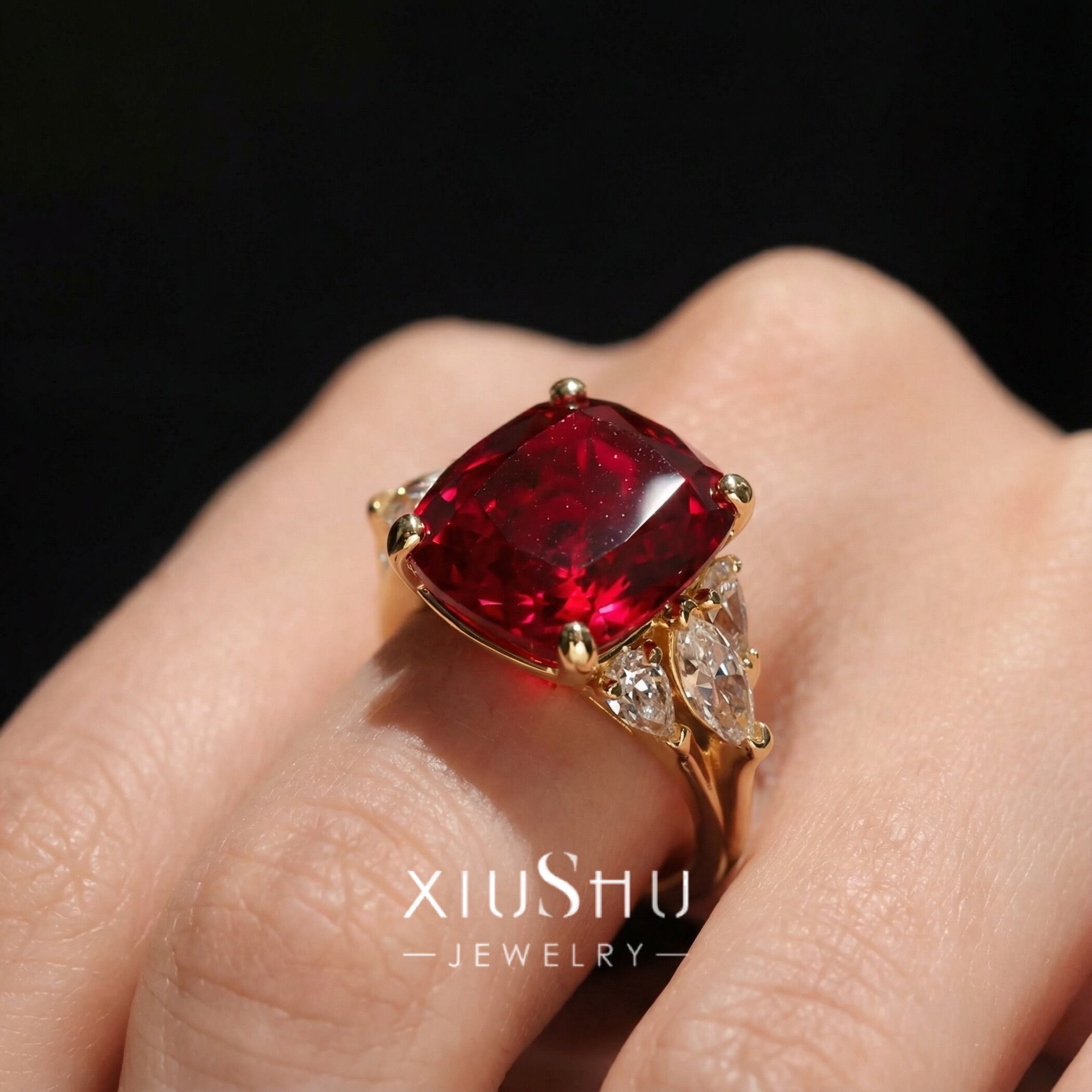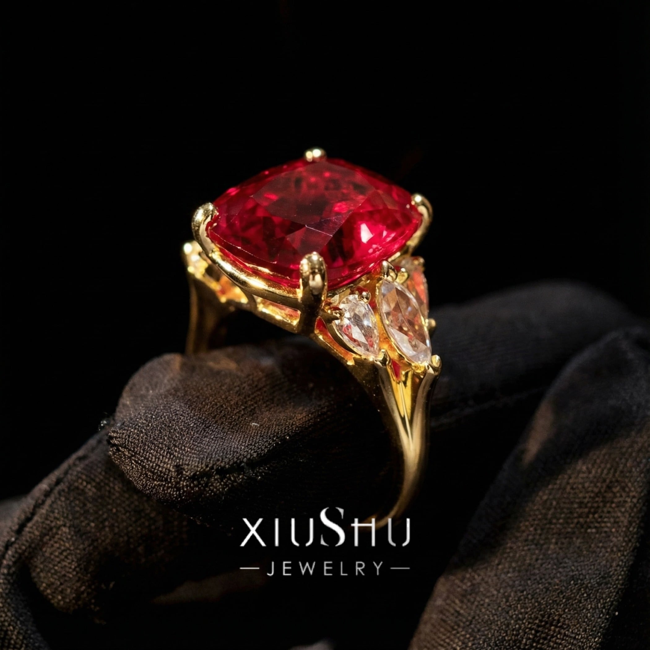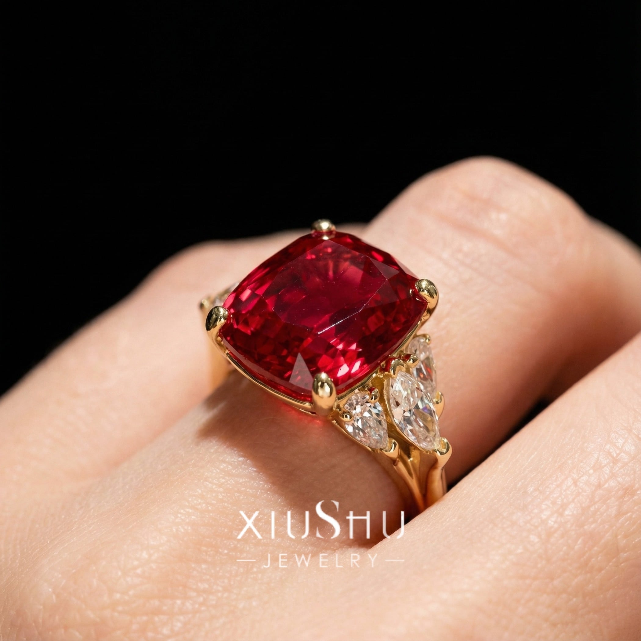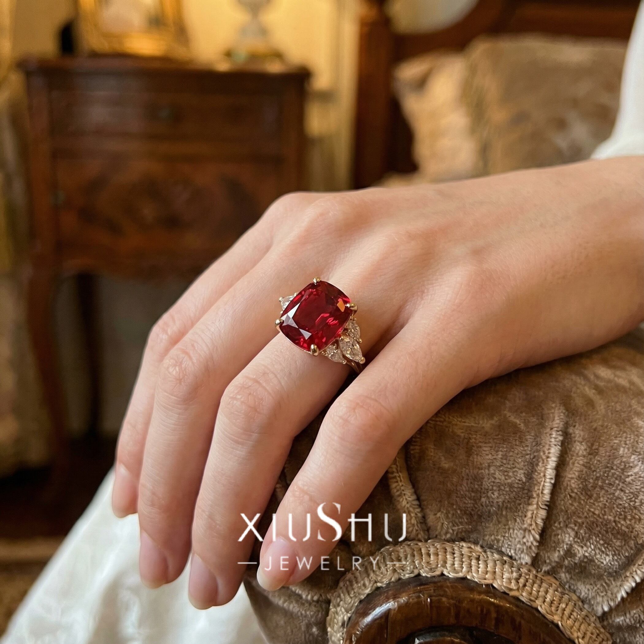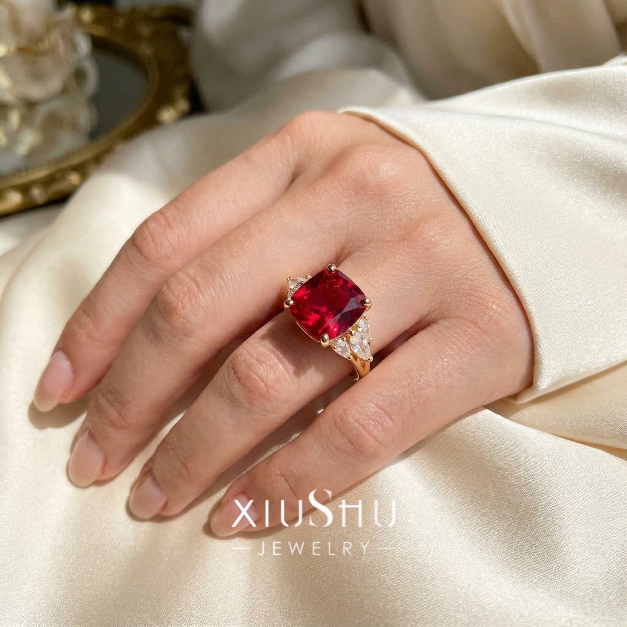 鮮やかな人工ルビーを主石に、両脇にはハイカーボンダイヤモンドをあしらったエレガントなリング。華やかさと上品さを兼ね備え、指先を印象的に彩ります。