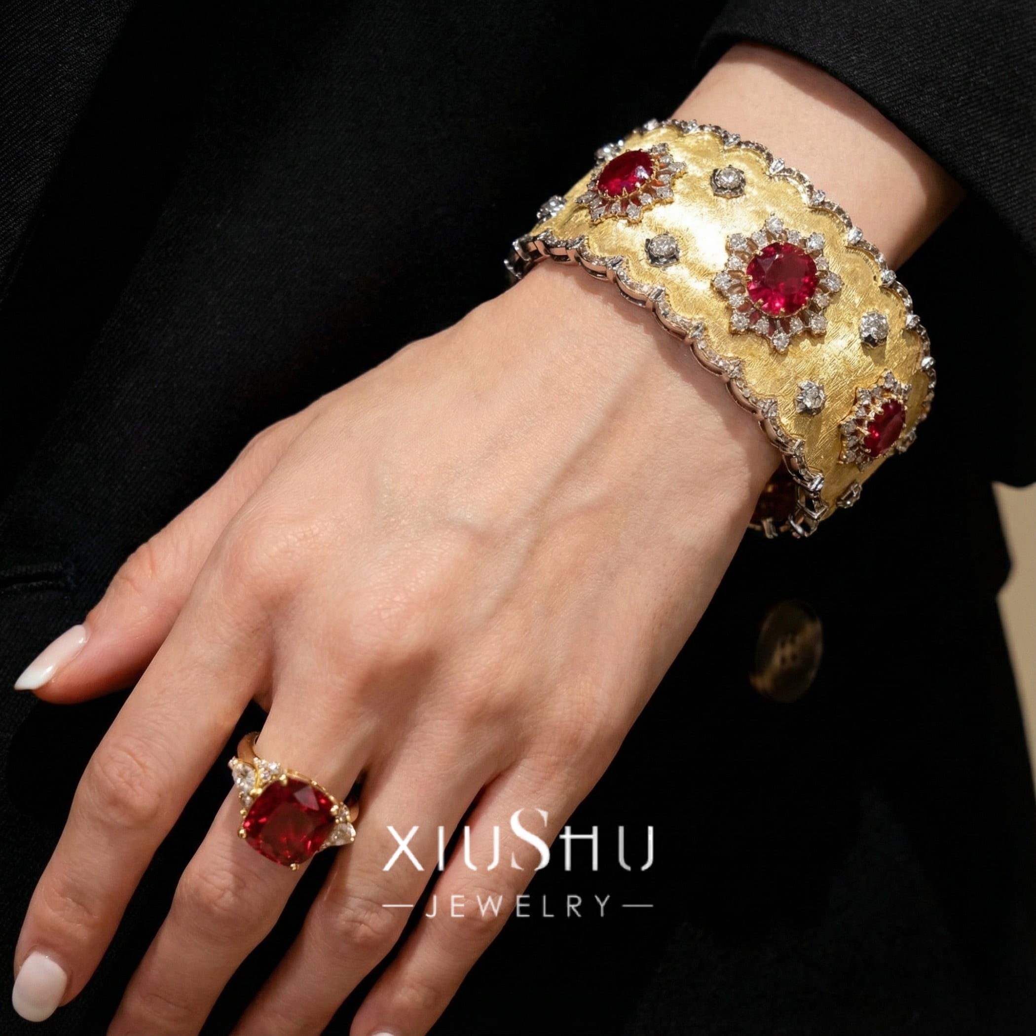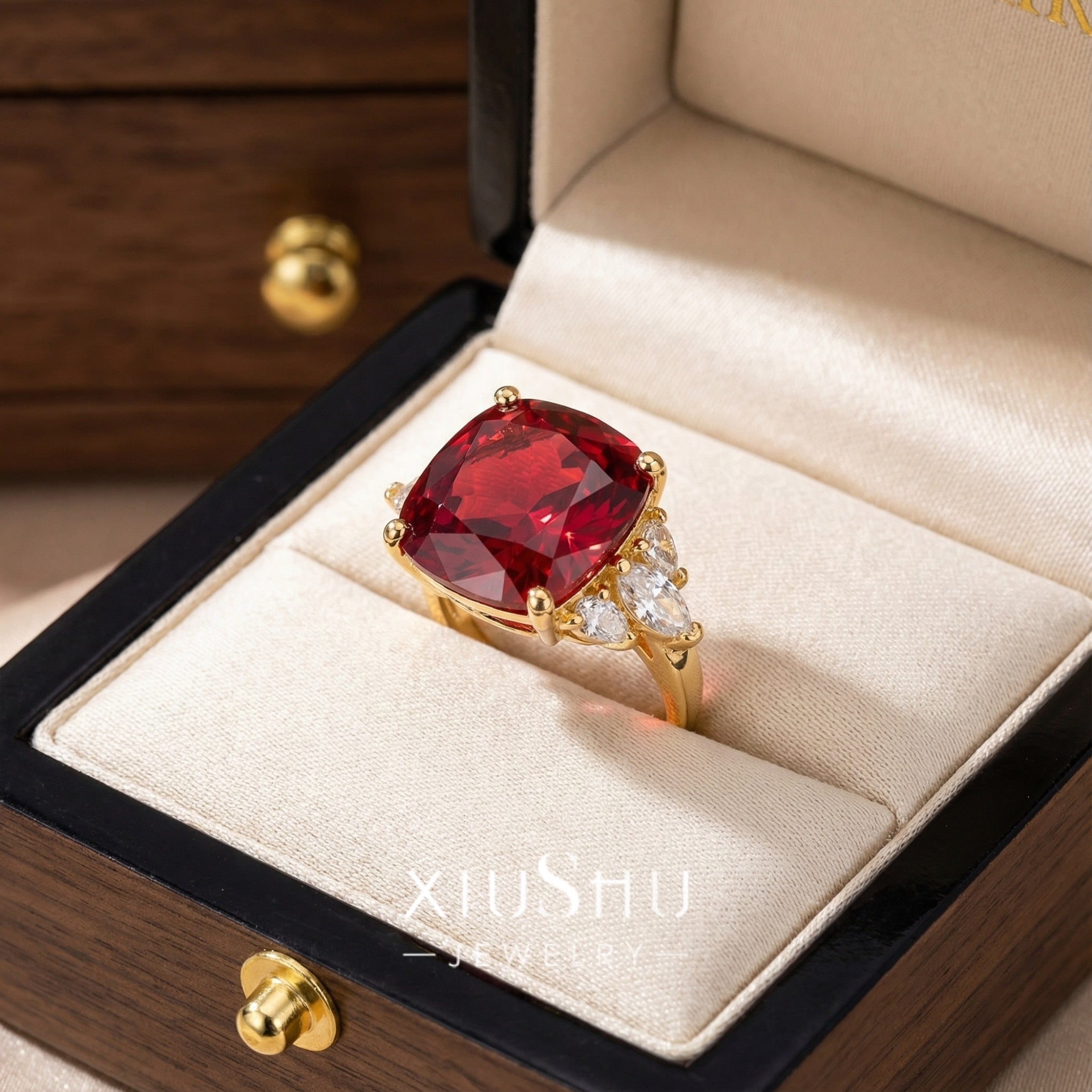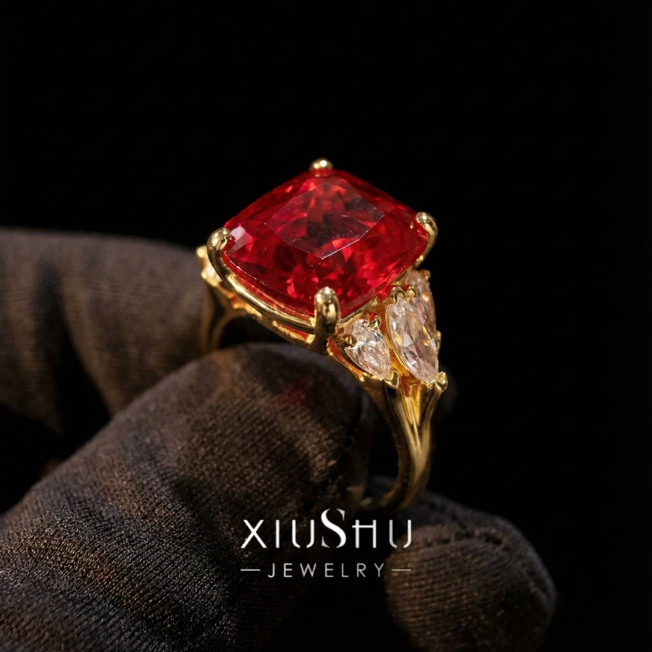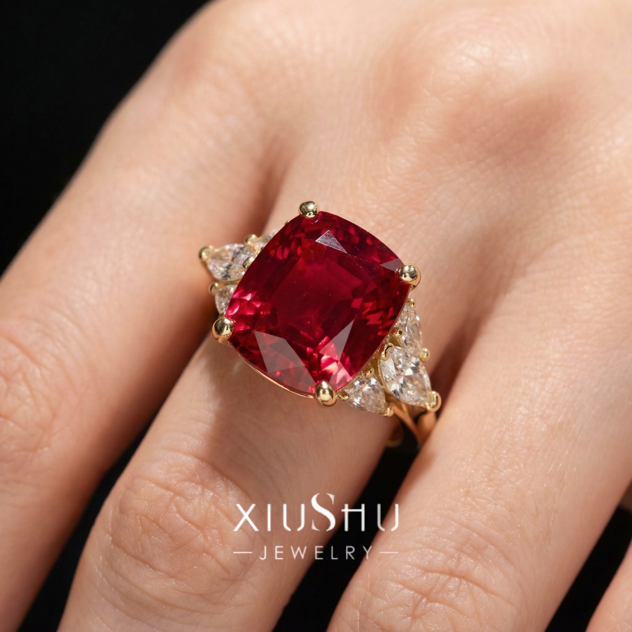 鮮やかな人工ルビーを主石に、両脇にはハイカーボンダイヤモンドをあしらったエレガントなリング。華やかさと上品さを兼ね備え、指先を印象的に彩ります。