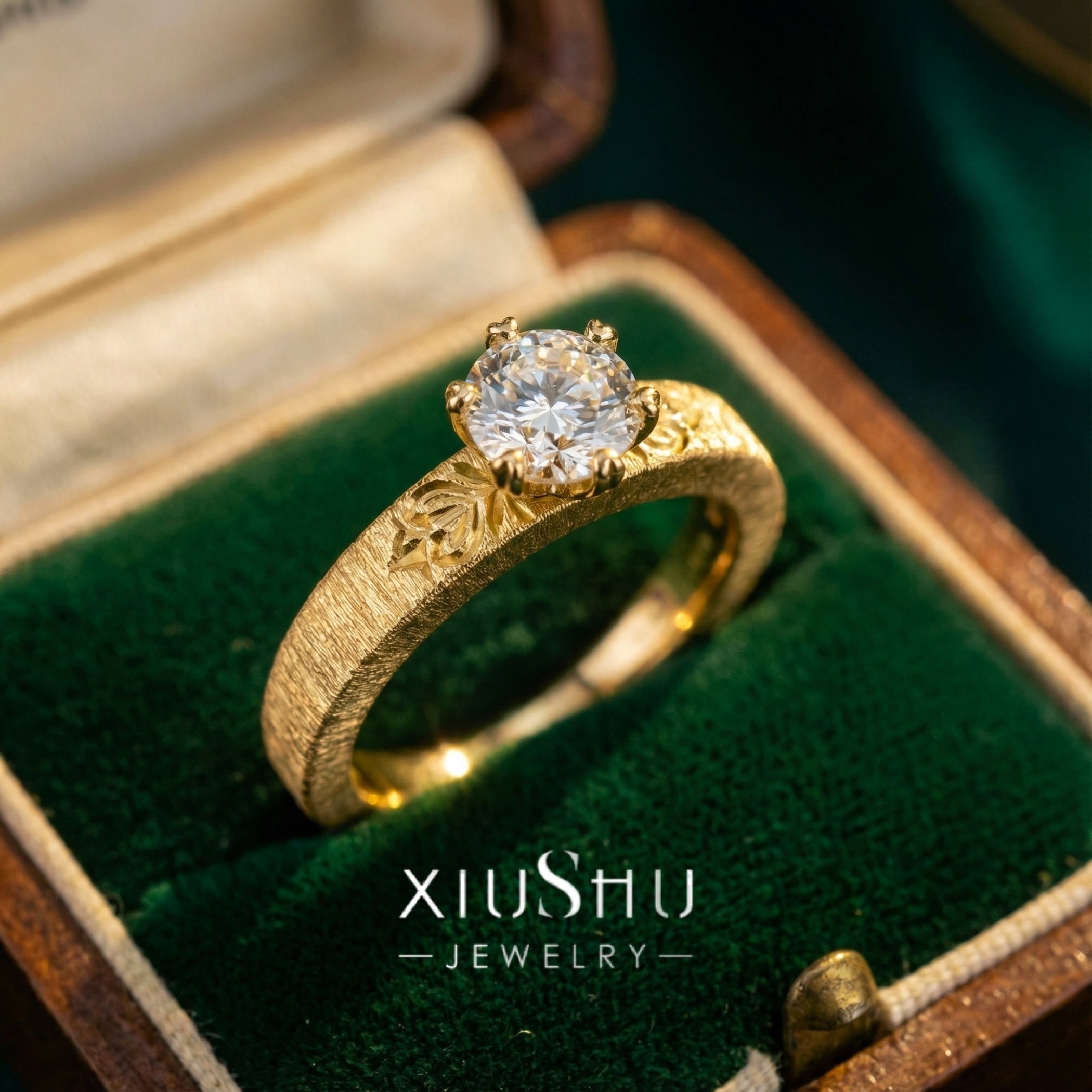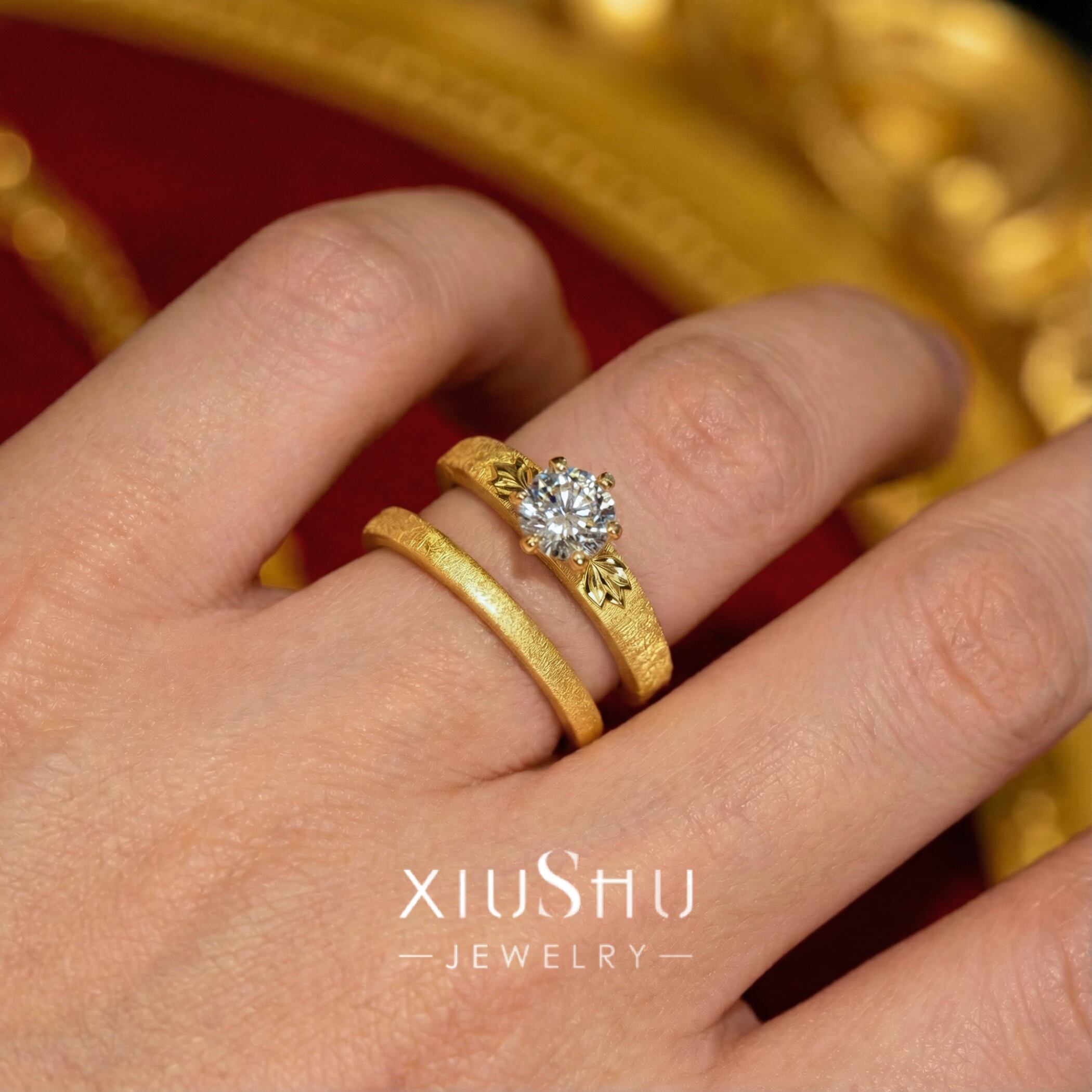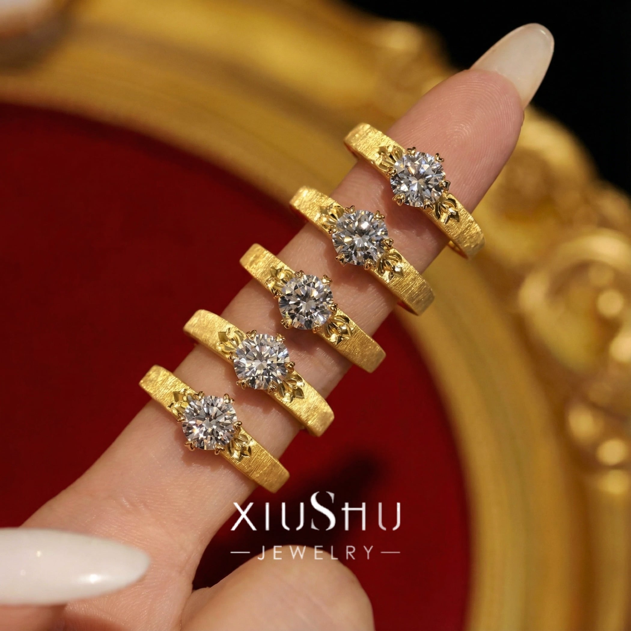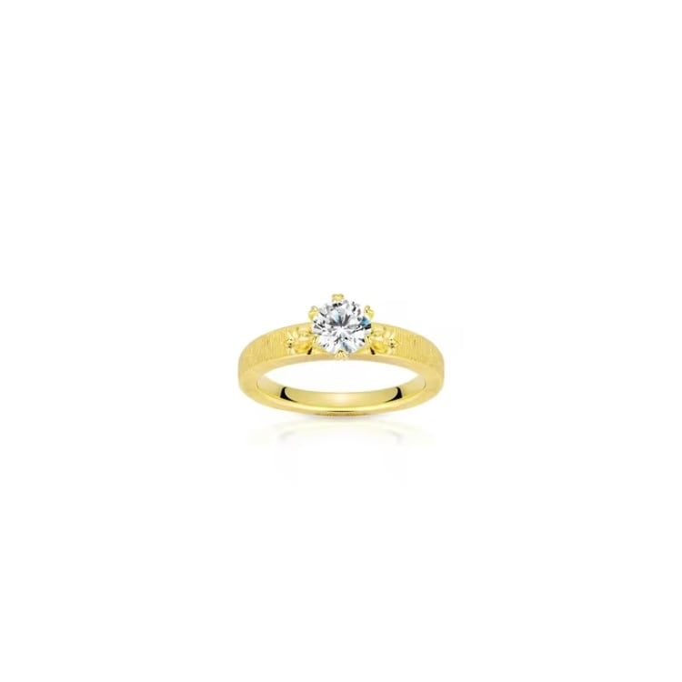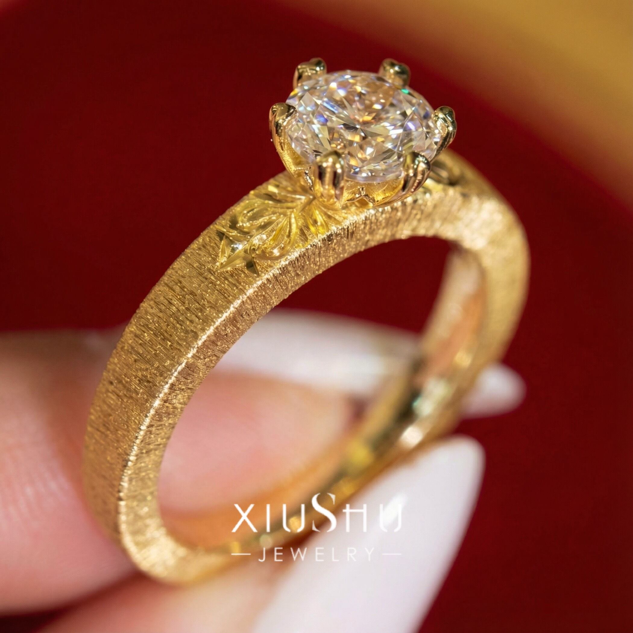 繊細な彫り模様を施したマットゴールドのアームに、高い輝きを放つハイカーボンダイヤモンドをセット。