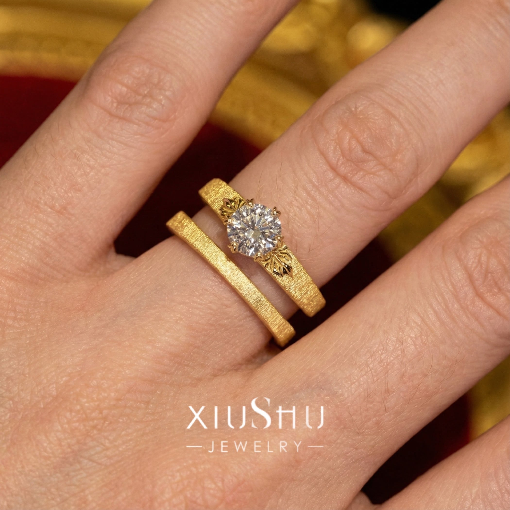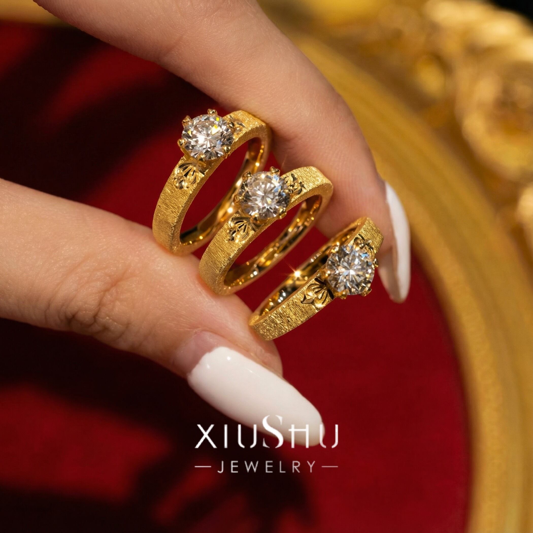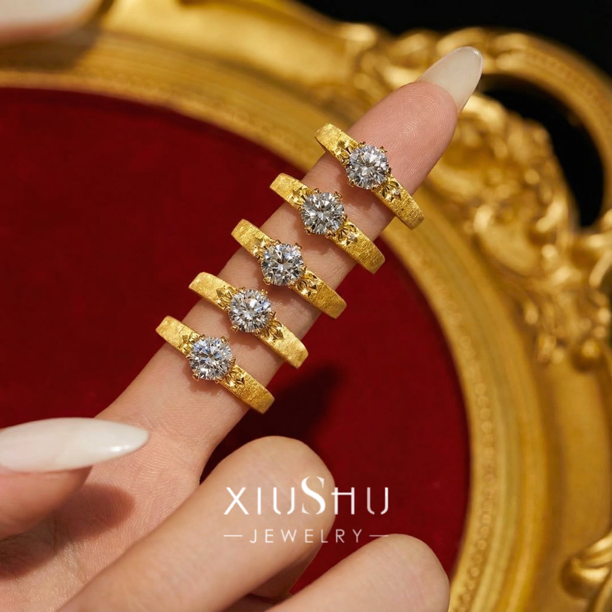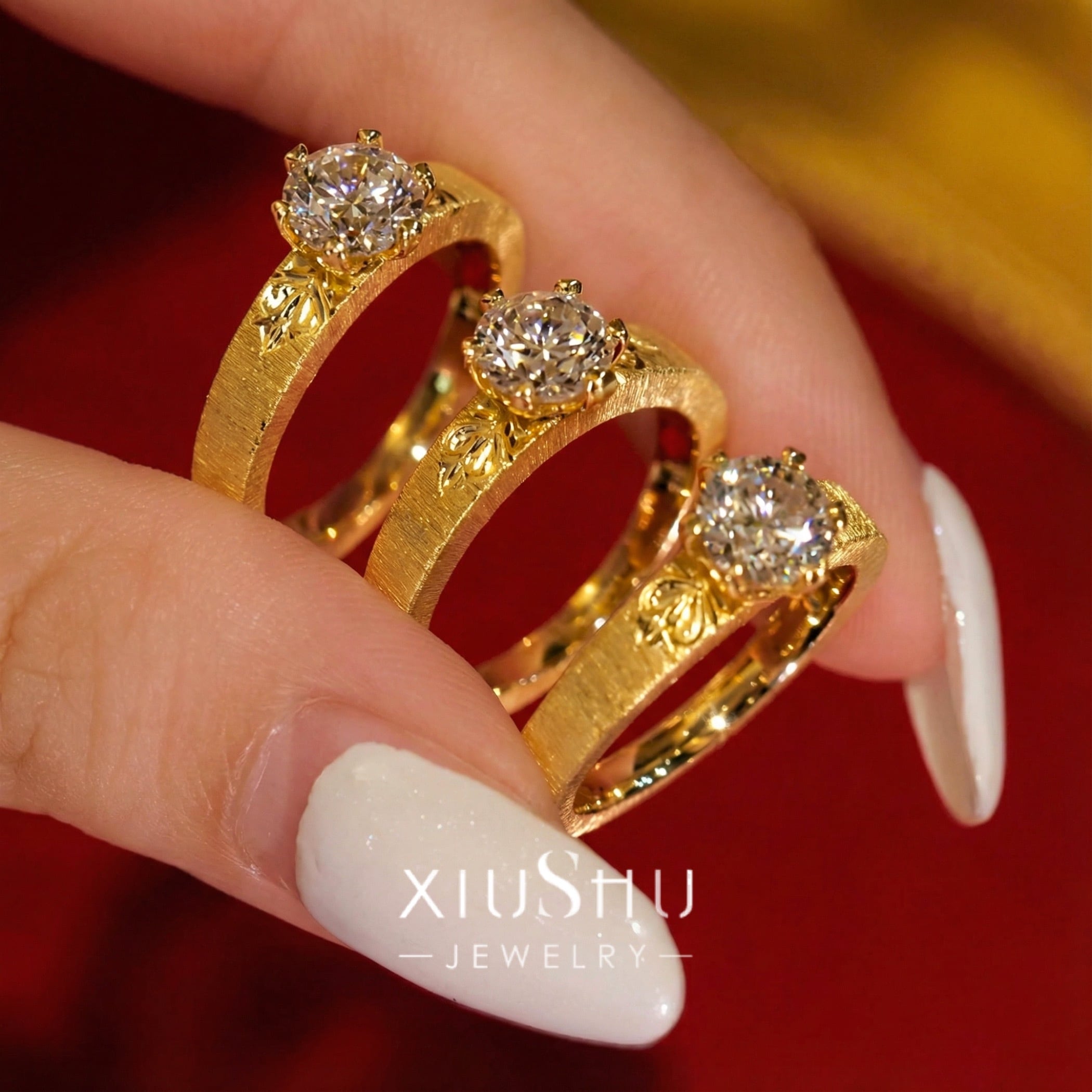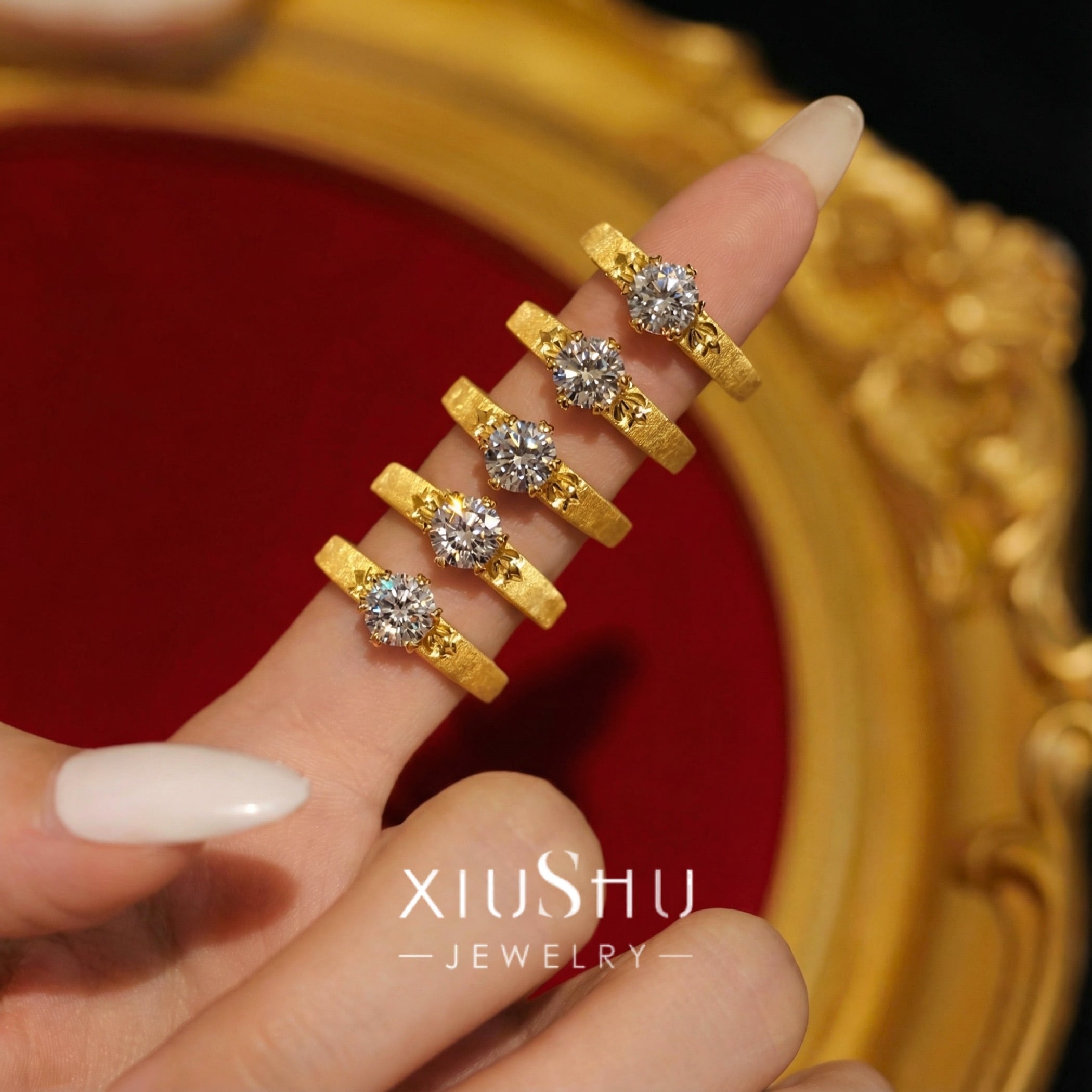 繊細な彫り模様を施したマットゴールドのアームに、高い輝きを放つハイカーボンダイヤモンドをセット。