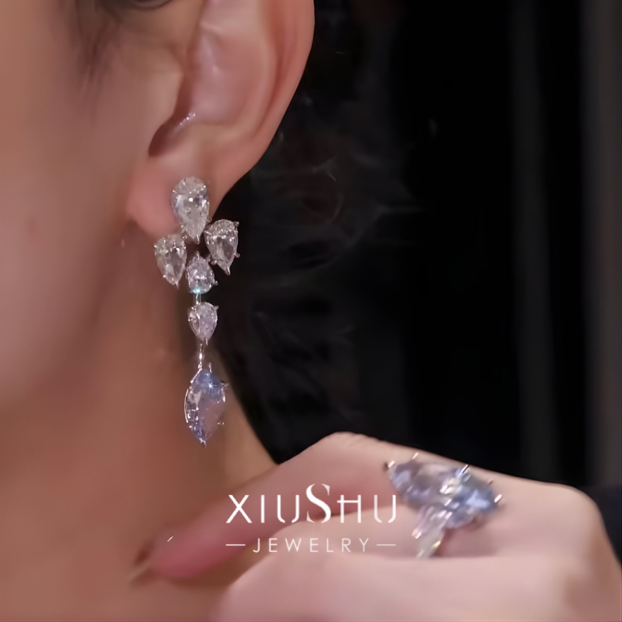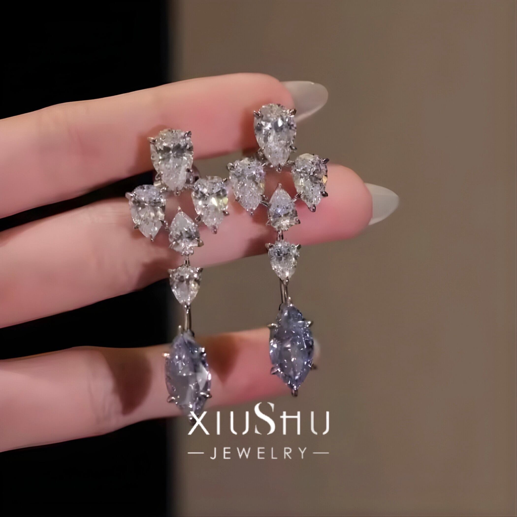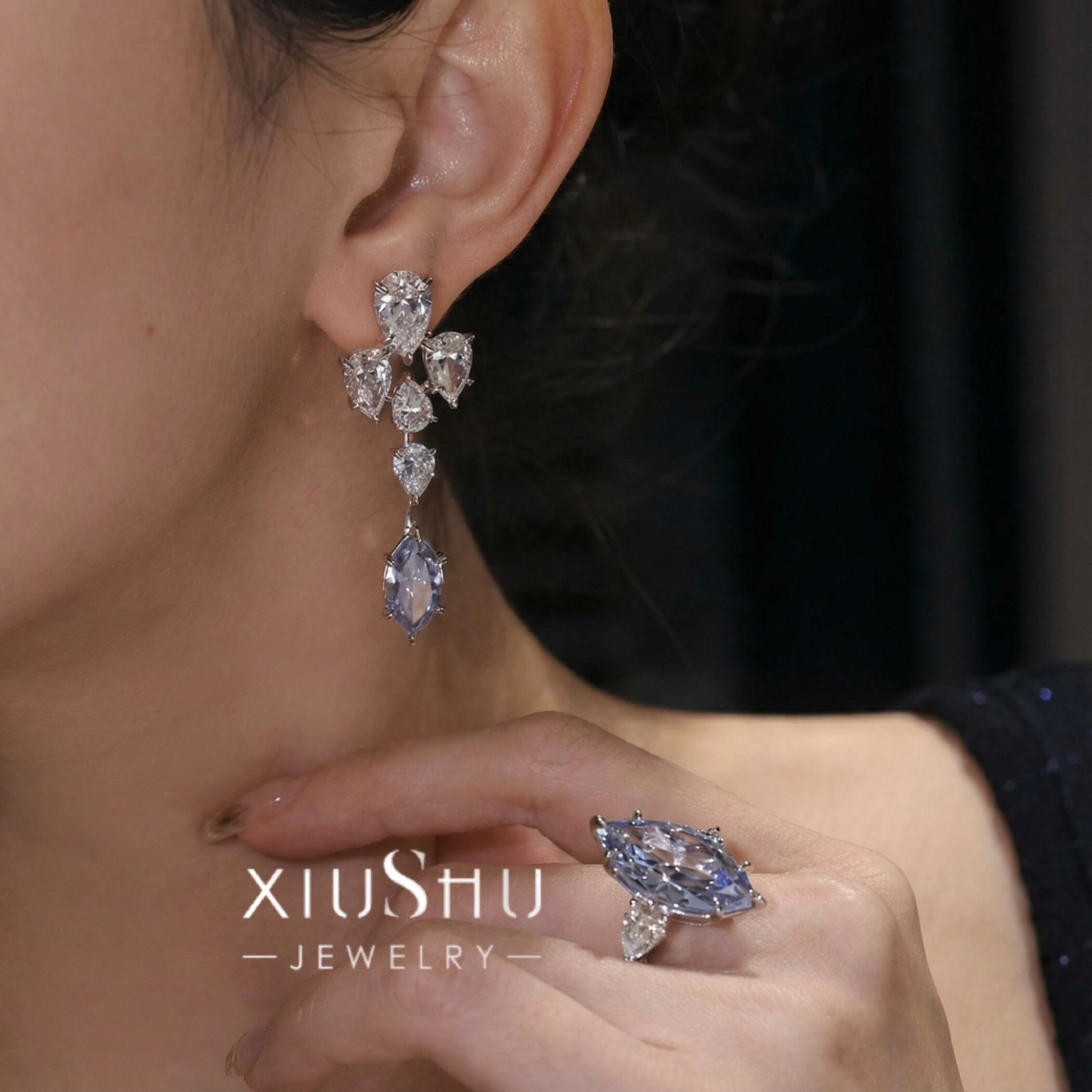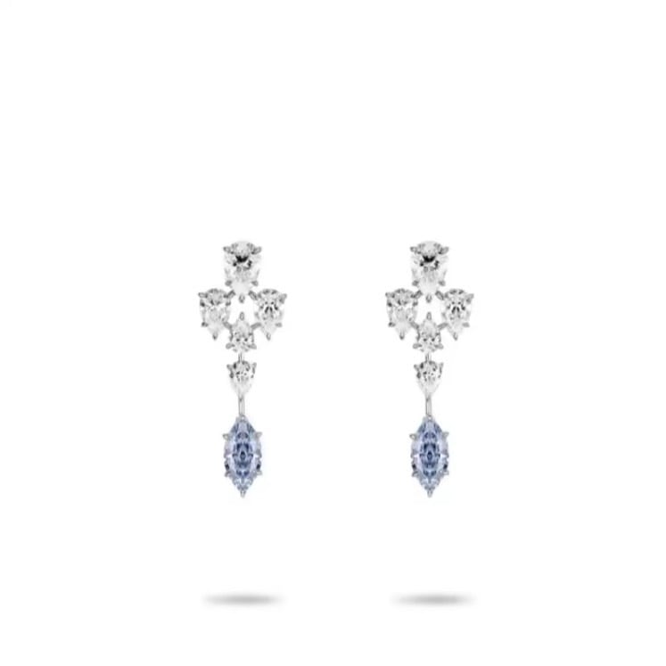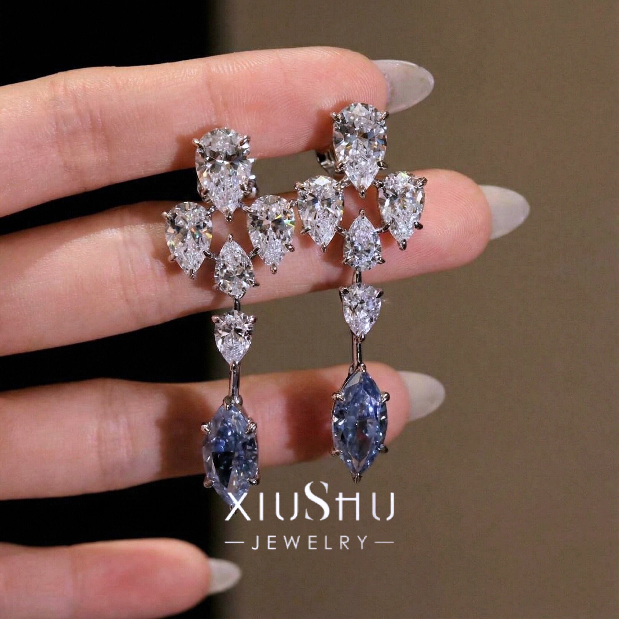 ブルー マーキスカット 高炭素ダイヤモンド キラキラ ゴージャス ピアス ハイカーボンダイヤモンド ホワイト レトロ S925 シルバー925 高級感 クール 青 ビッグ ドロップ ペアシェイプ ロングピアス